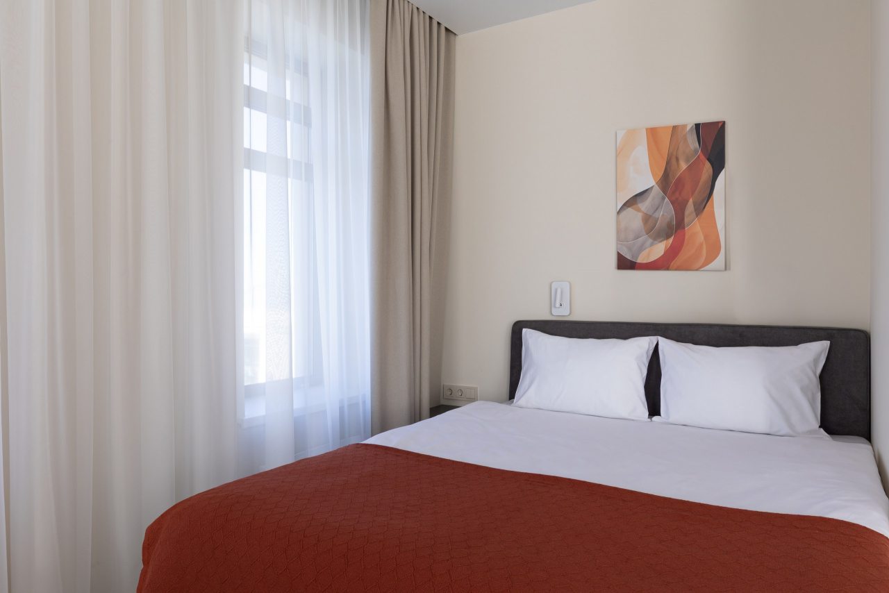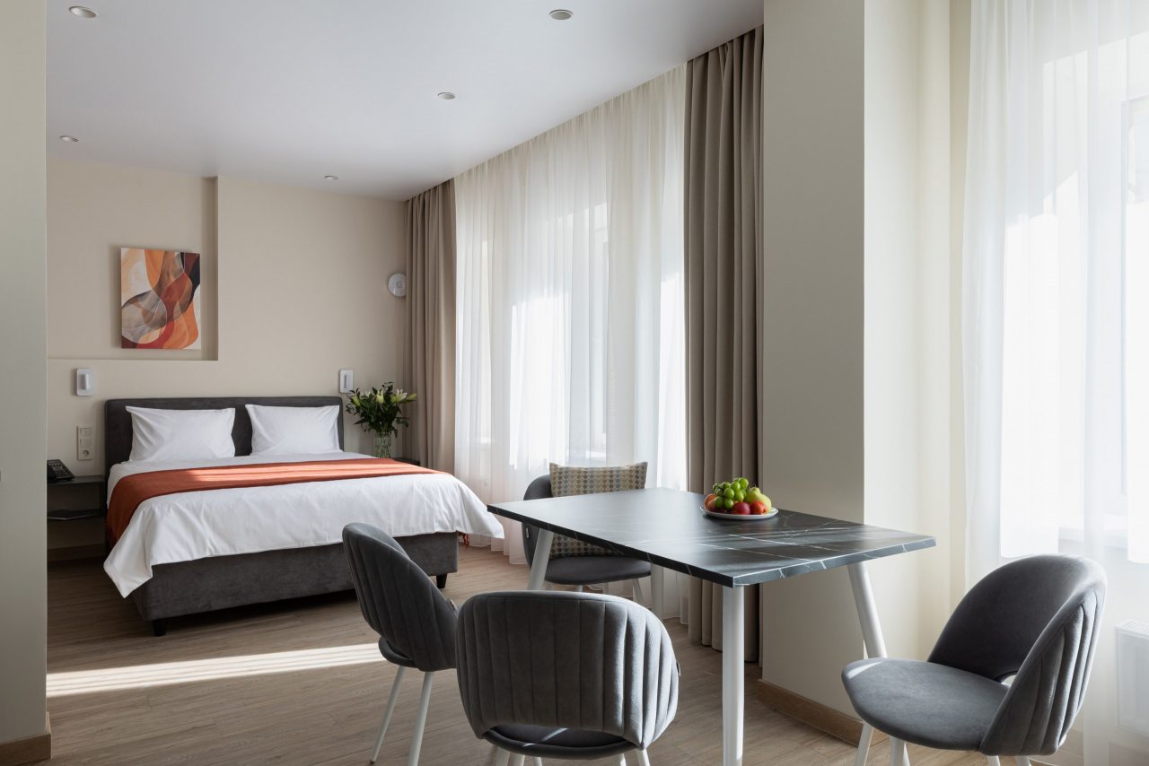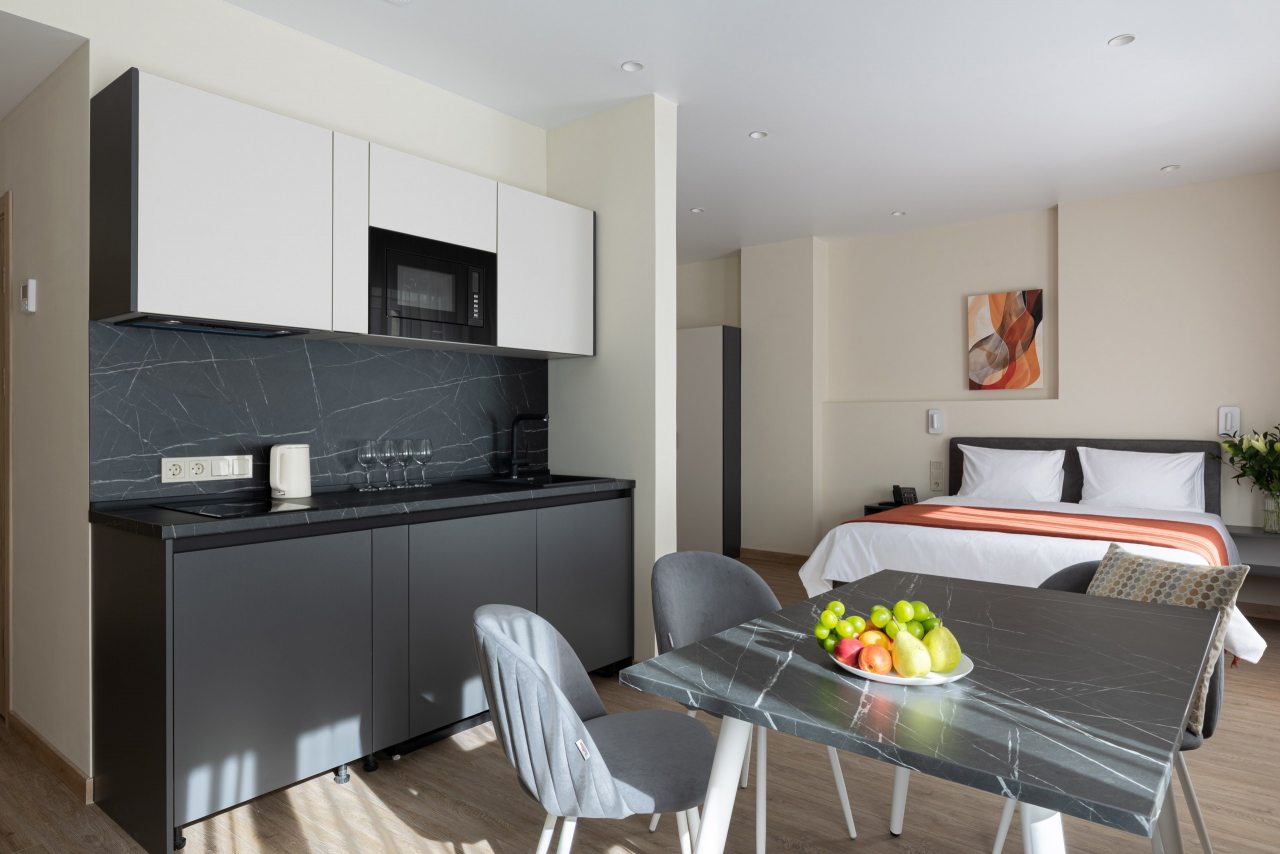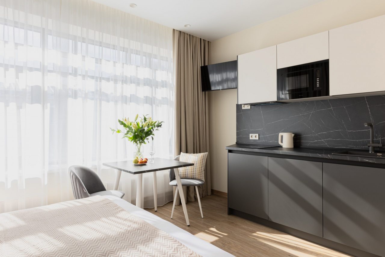 Гостям предоставляются номера с большими кроватями и функциональной мини-кухней. Имеется все необходимое для комфортного проживания: рабочая зона, спит-система, ванная комната с набором полотенец и тапочками.