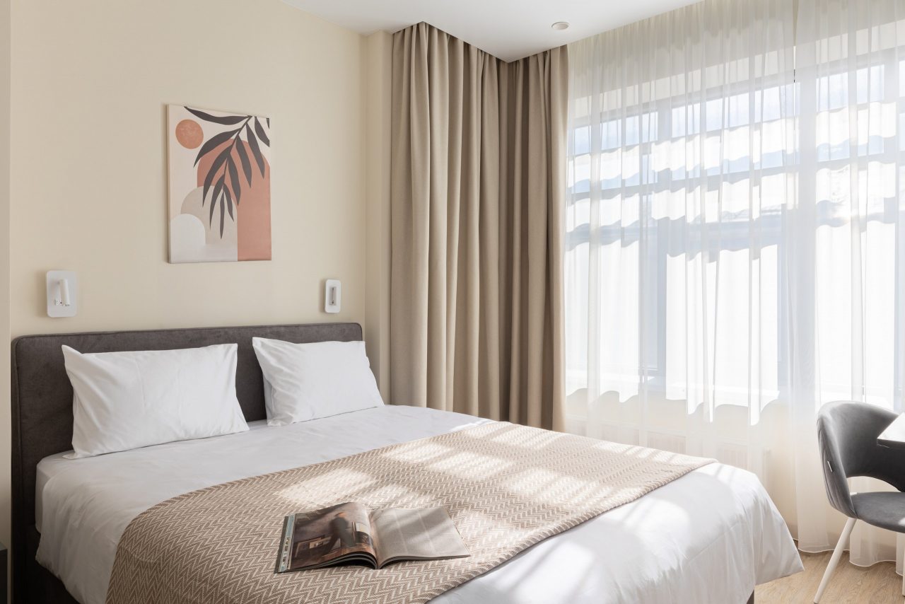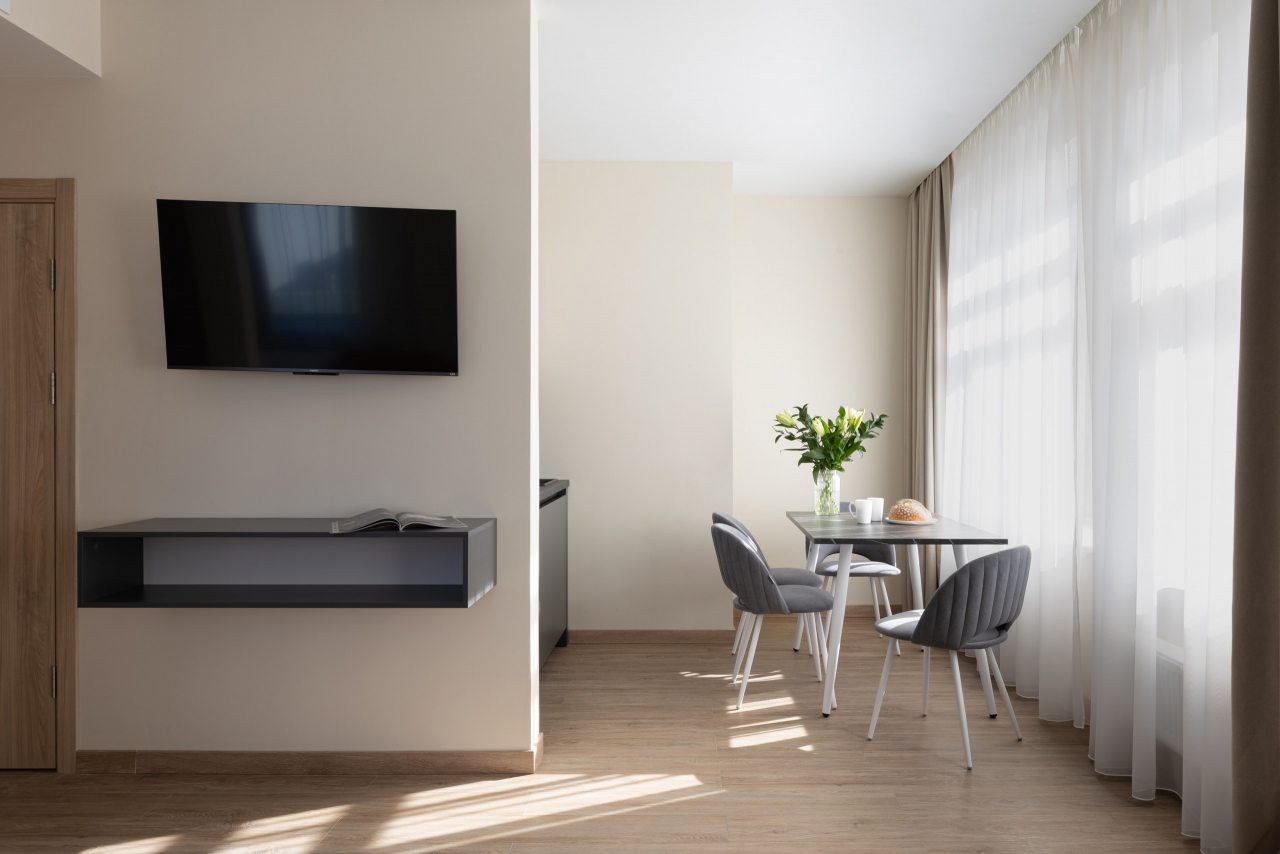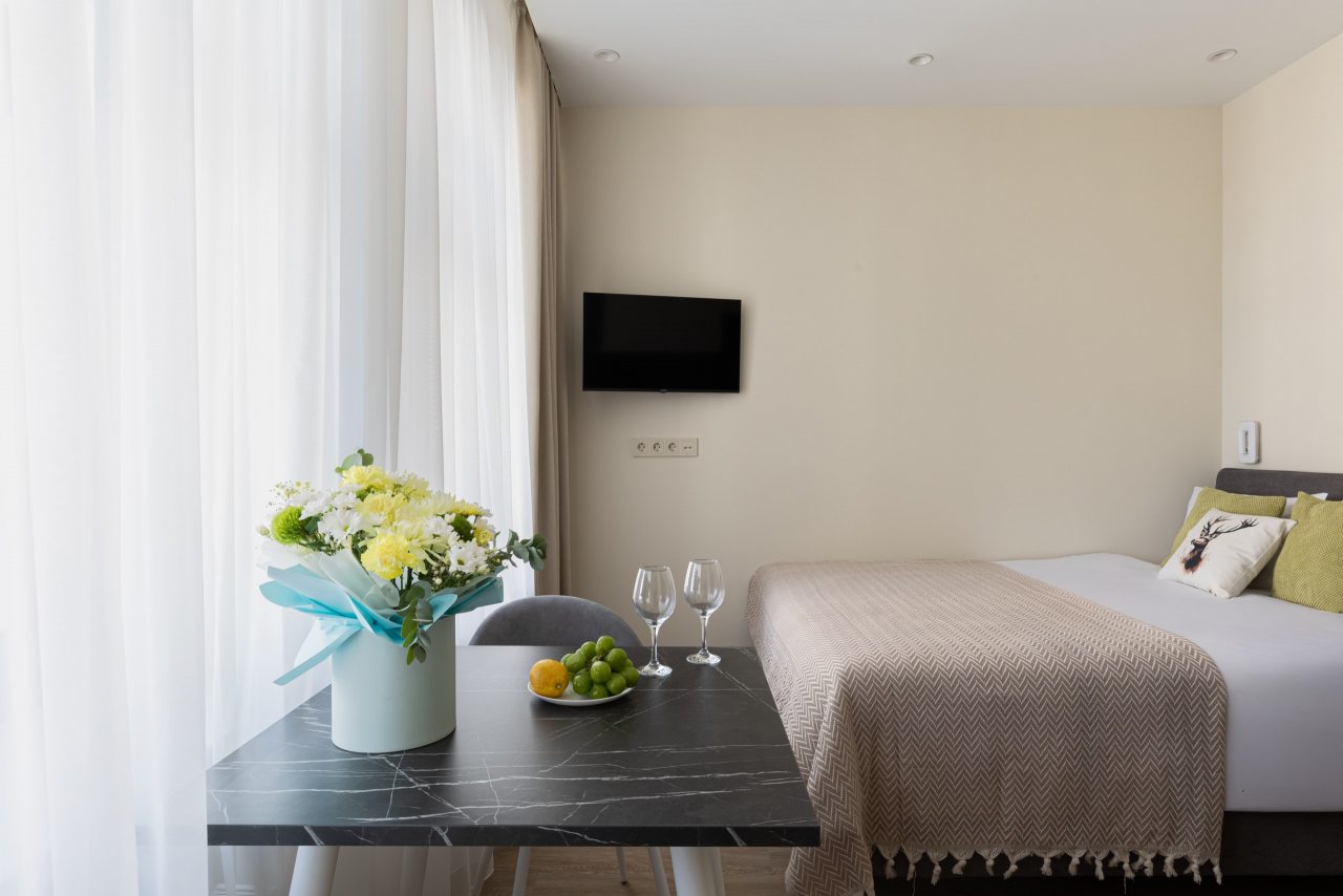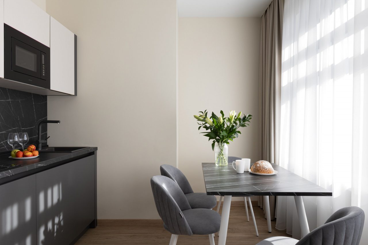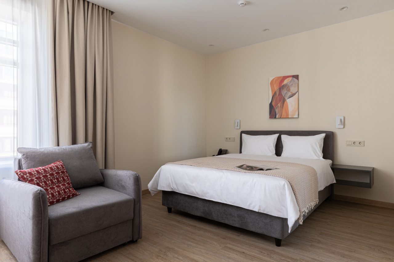 Гостям предоставляются номера с большими кроватями и функциональной мини-кухней. Имеется все необходимое для комфортного проживания: рабочая зона, спит-система, ванная комната с набором полотенец и тапочками.