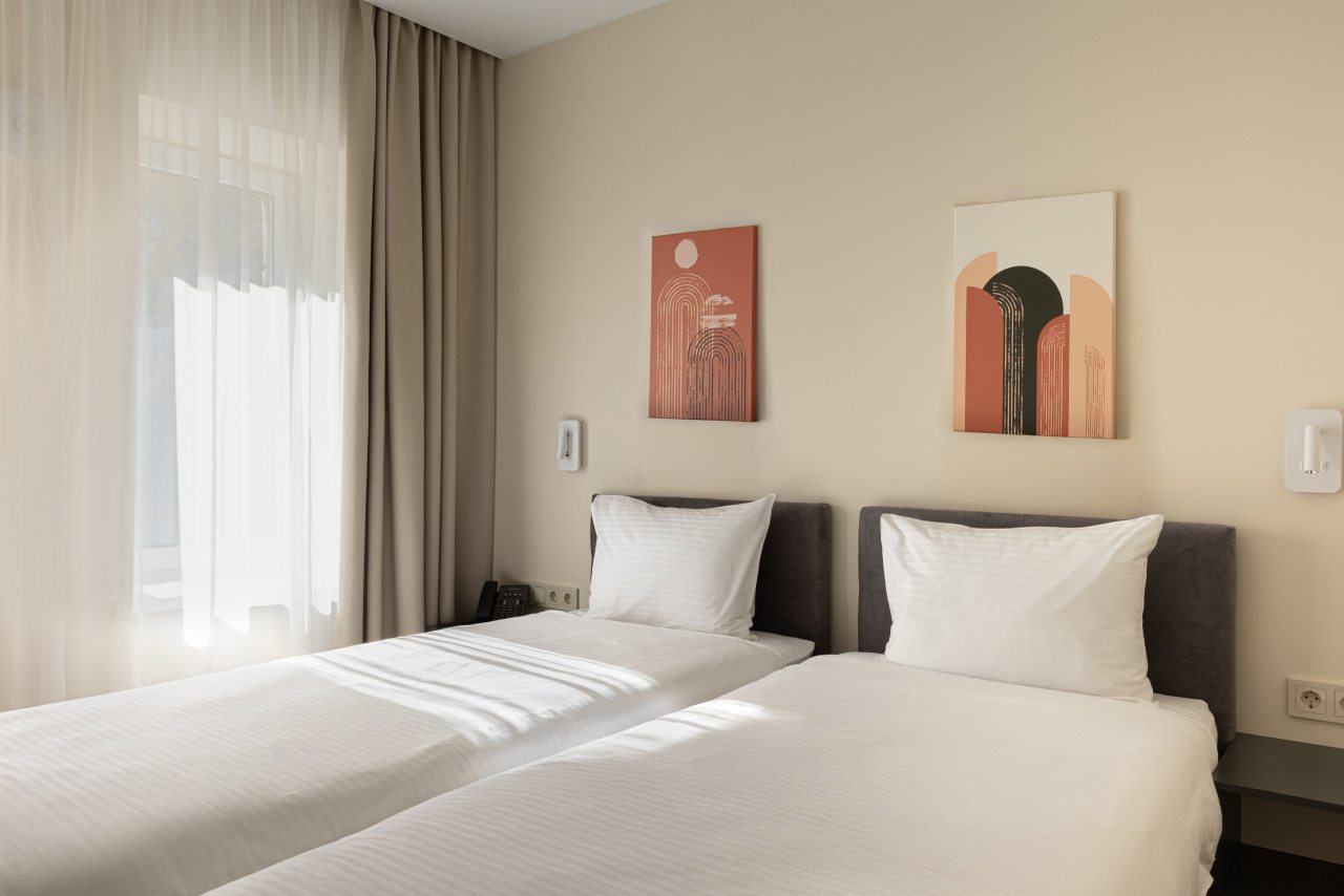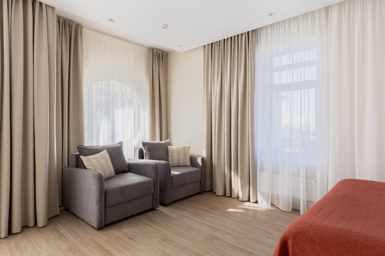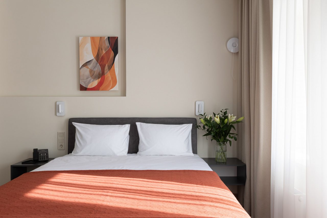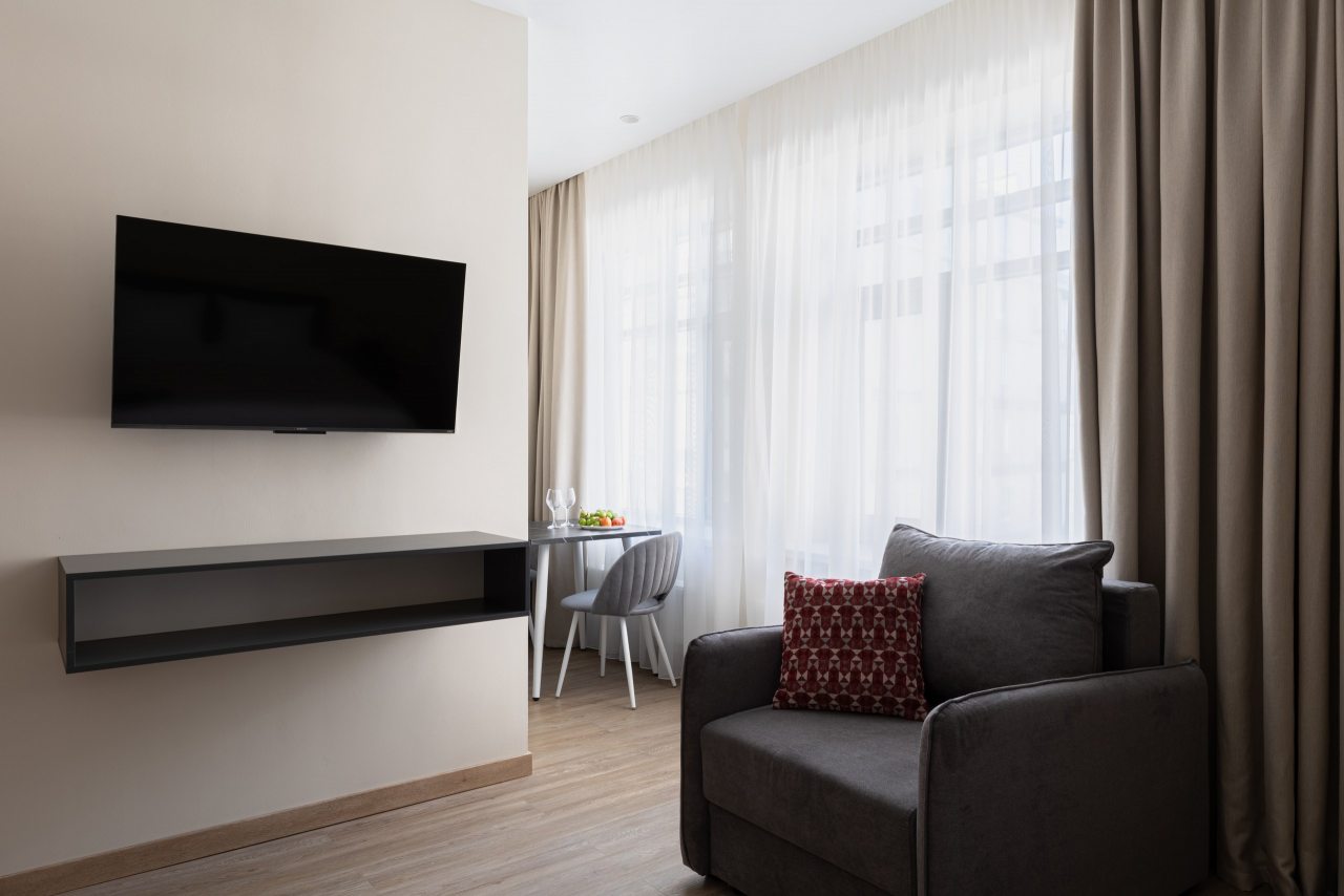 Гостям предоставляются номера с большими кроватями и функциональной мини-кухней. Имеется все необходимое для комфортного проживания: рабочая зона, спит-система, ванная комната с набором полотенец и тапочками.