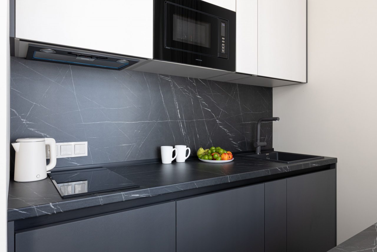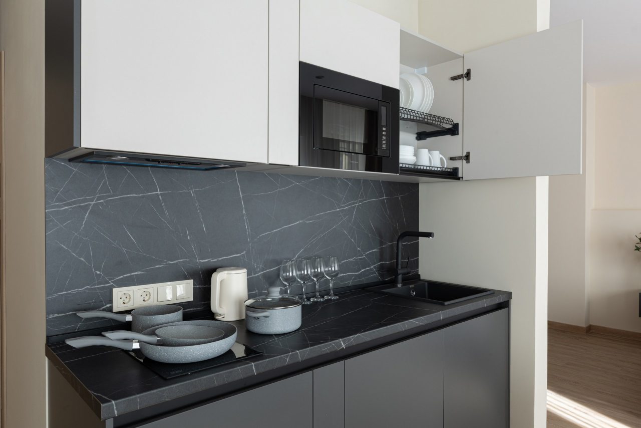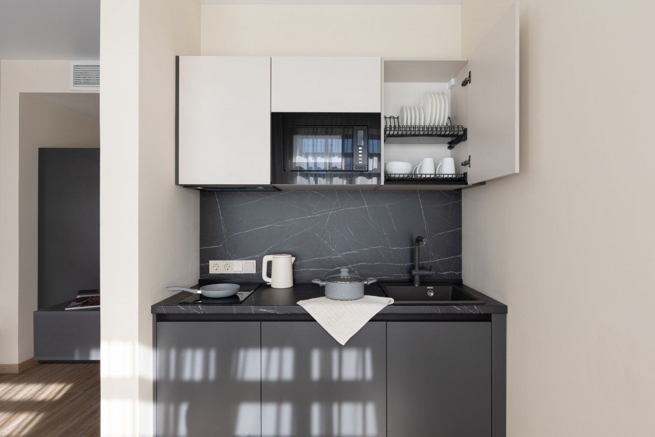 Кухня в номерах оснащена варочной панелью, вытяжкой, микроволновой печью, электрочайником и другими приборами.