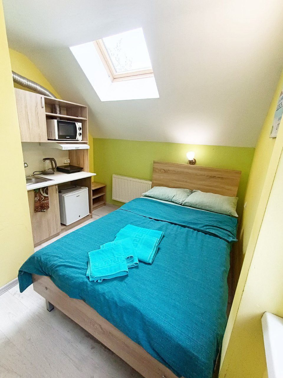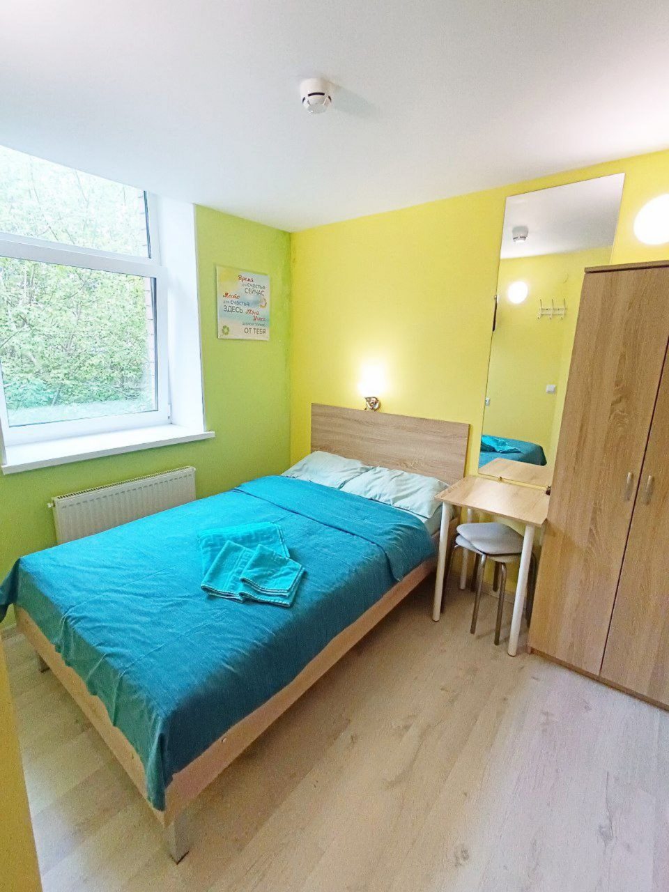 Для проживания предлагается двухместный номер с двуспальной кроватью и набором постельного белья, бра, прикроватными тумбочками. Есть вместительный шкаф для удобного хранения одежды. Санузел оборудован необходимой сантехникой.