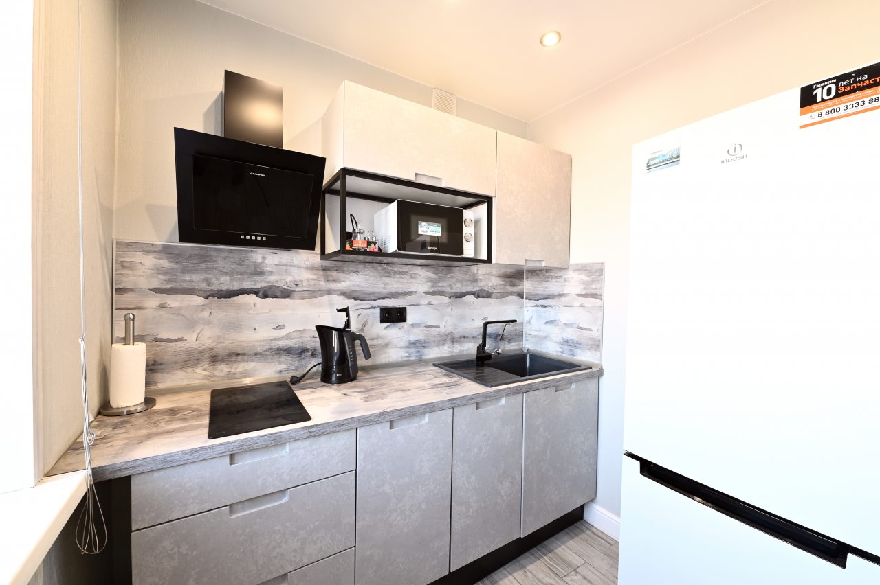 На кухне есть все для приготовления любимых блюд, обеденная зона и кухонный гарнитур с техникой. Установлен холодильник, варочная панель, чайник. Постояльцы могут выпить чай и кофе. Рядом есть несколько продуктовых магазинов и кондитерская «Айсберг».
