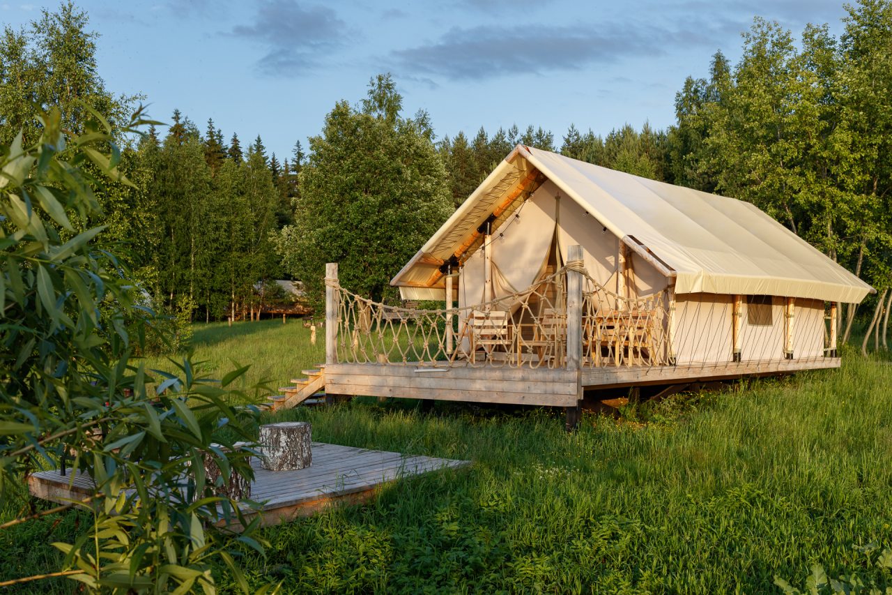 Для пребывания гостей подготовлены четырнадцать домиков, сделанных по типу каркасно-тентового сооружения. Они круглосуточно отапливаются, отделаны тёплым слоем и оборудованы обогревателями. Так же в число удобств входят комфортабельные спальные места, шкаф для одежды, прикроватные тумбы, бесплатный Wi-fi, газовая плитка, холодильник и собственная ванная комната.