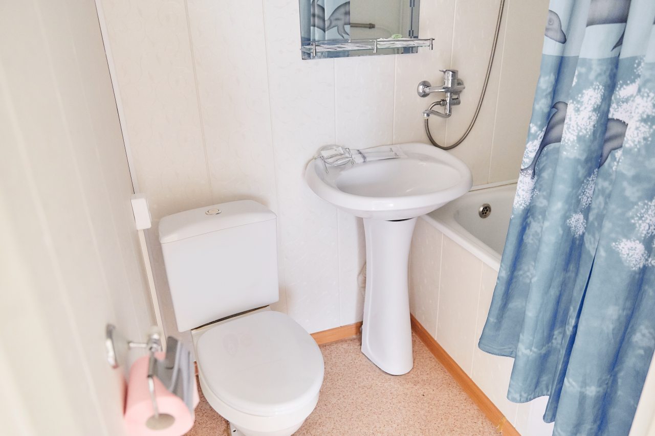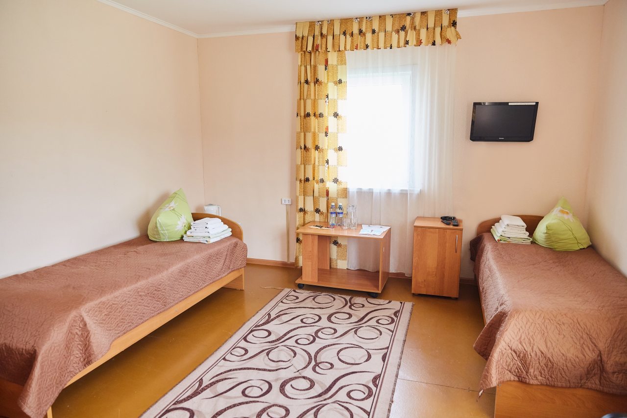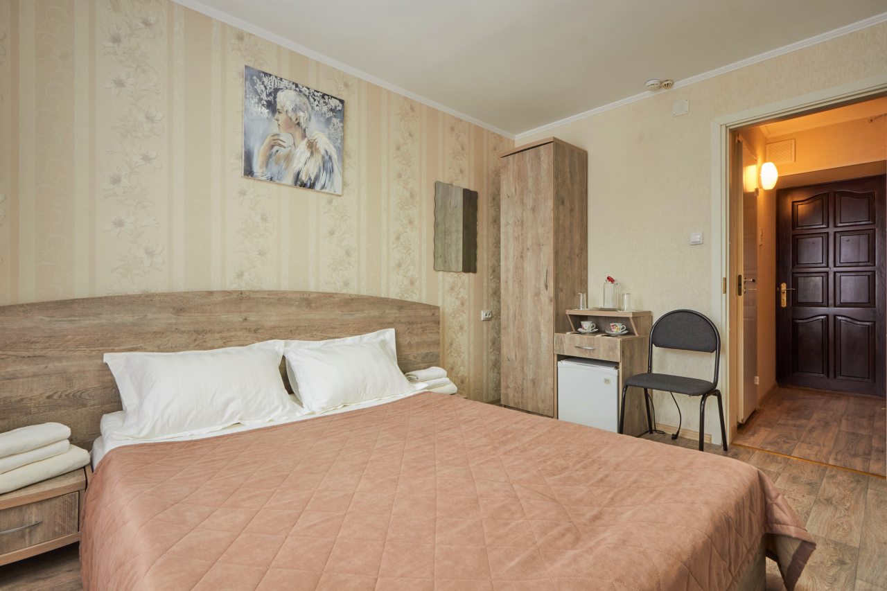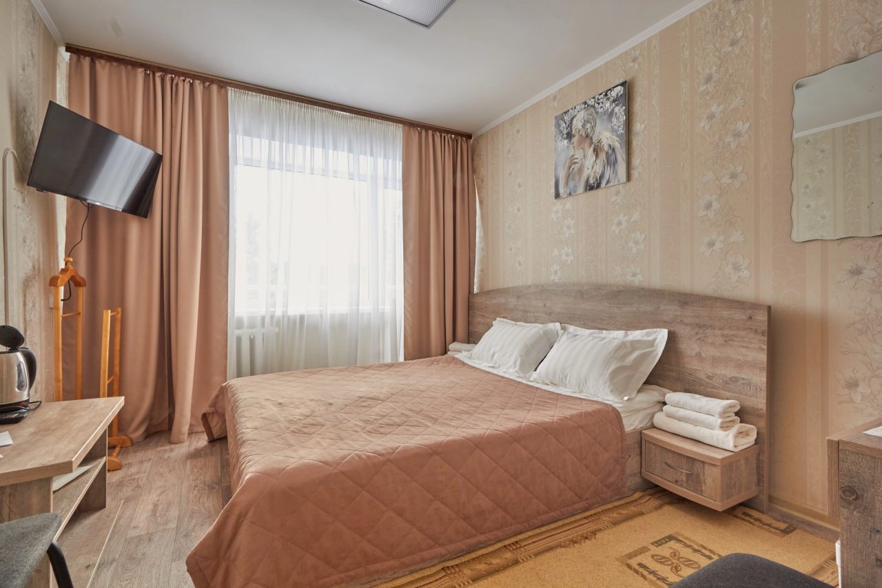 Для выбора представлены номера различных категорий. В каждом — удобная для сна кровать, шкаф, телевизор, набор полотенец, а также собственный санузел с душем, туалетом, раковиной и средствами для гигиены.
