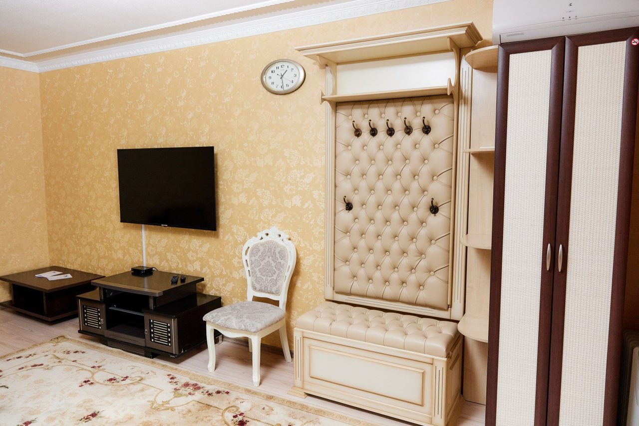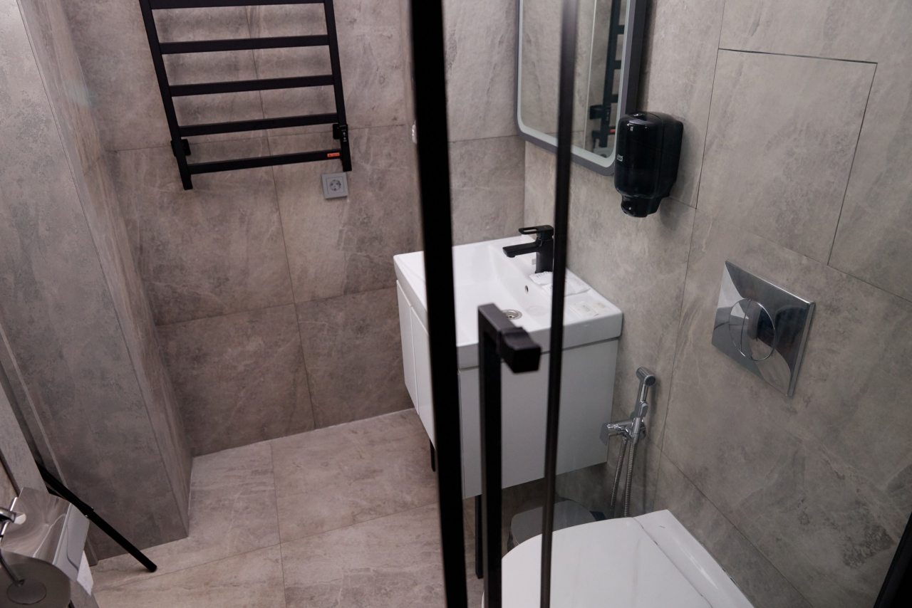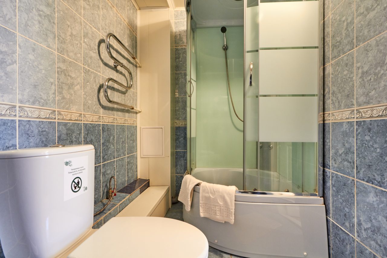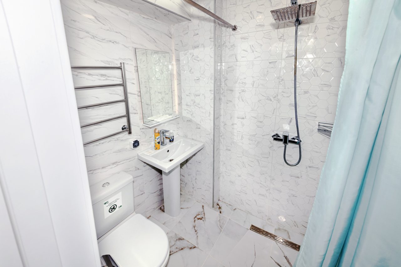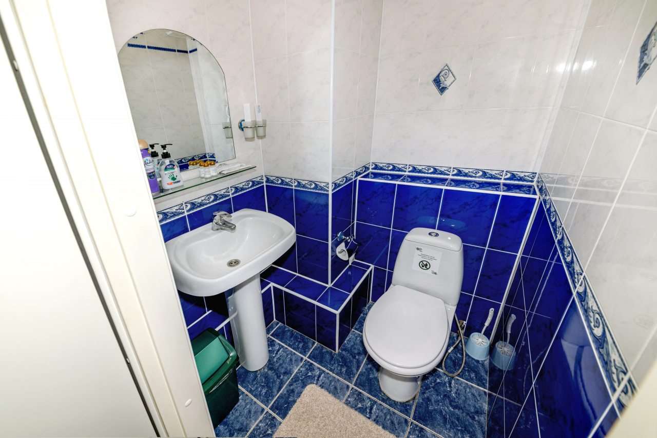 Для выбора представлены номера различных категорий. В каждом — удобная для сна кровать, шкаф, телевизор, набор полотенец, а также собственный санузел с душем, туалетом, раковиной и средствами для гигиены.