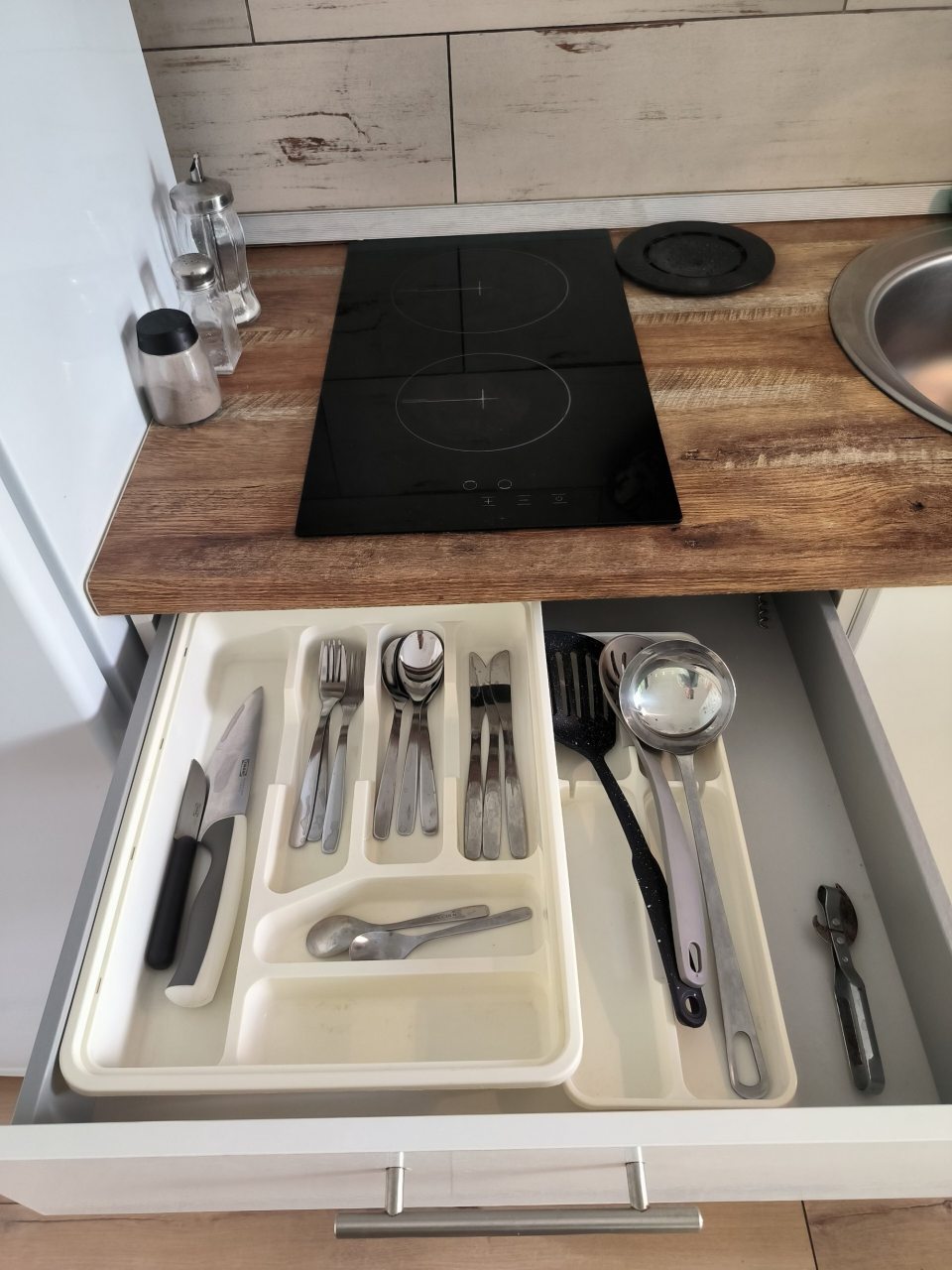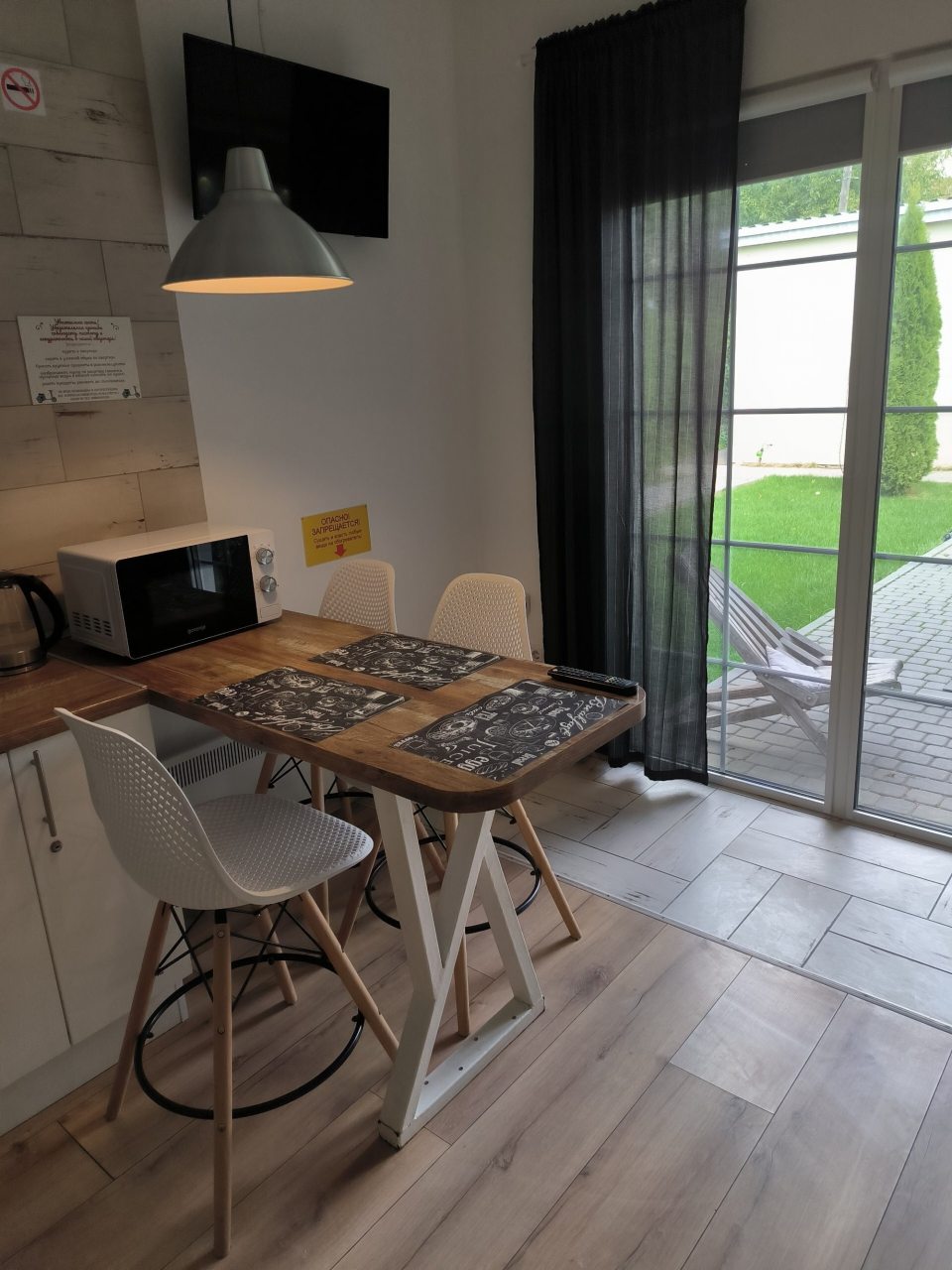 Для приготовления и употребления любимых домашних блюд предусмотрена обеденная зона, плита, холодильник, СВЧ-печь и чайник.