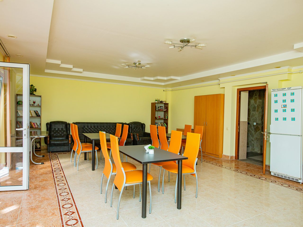 В номерах есть холодильник, а в общей кухонной зоне – всё необходимое, включая посуду, микроволновую печь и духовой шкаф, для самостоятельного приготовления любых блюд.