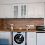Кухонная зона укомплектована микроволновой печью, холодильником, чайником, набором посуды. В доступности есть кондитерская, кафе и продуктовый магазин.