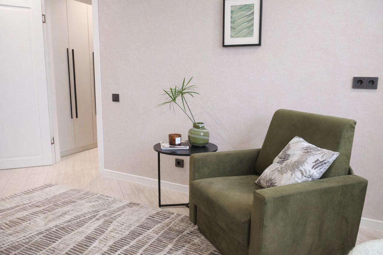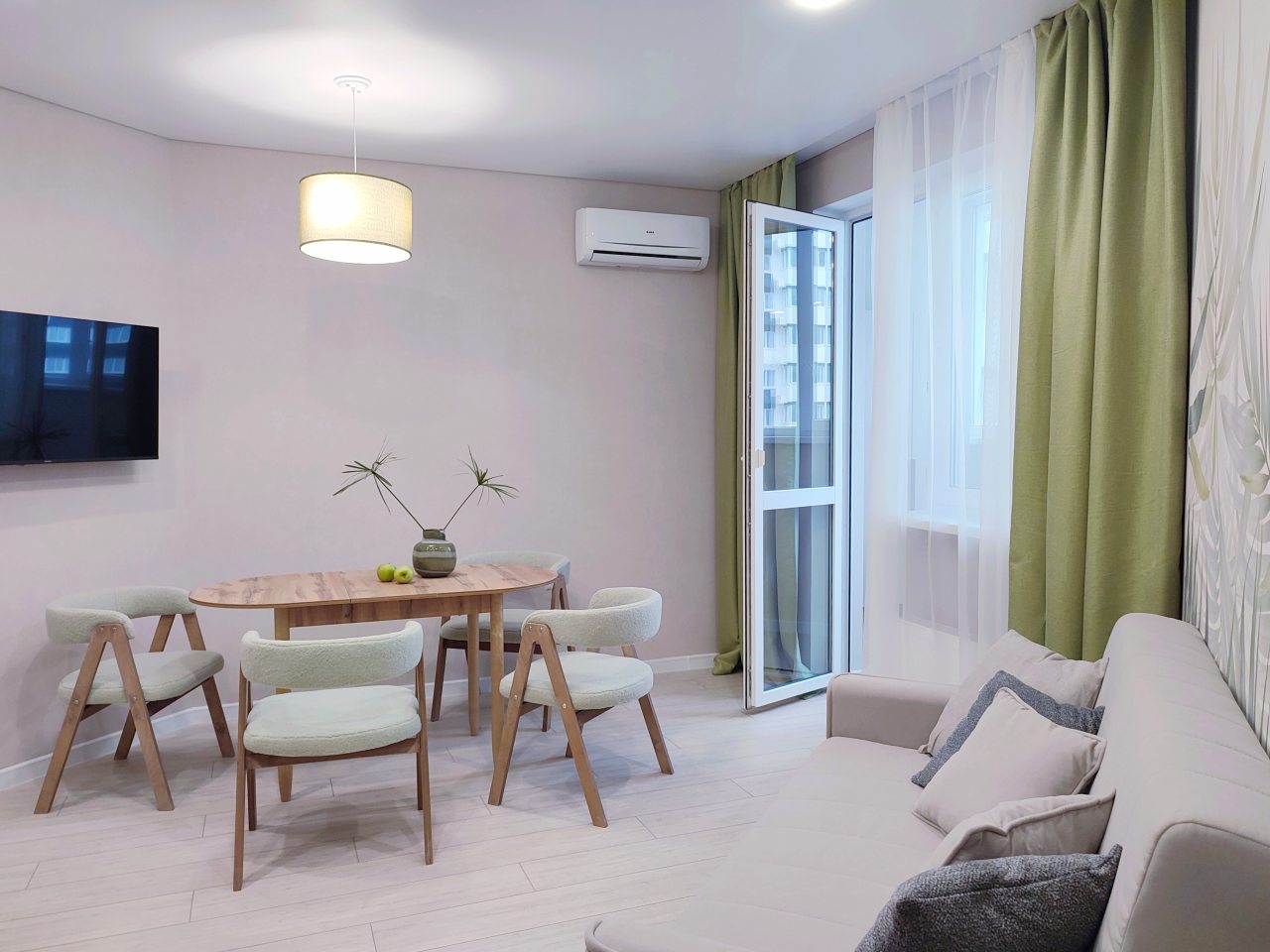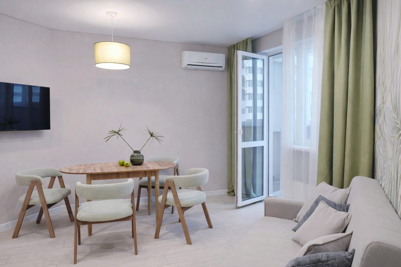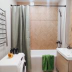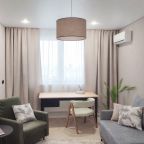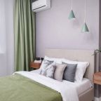 Уютная квартира с современным ремонтом оборудована удобной двуспальной кроватью, розетками возле спального места, диваном, кондиционером, письменным столом, телевизором с онлайн-кинотеатрами, шкафом, wi-fi и др. Санузел оснащен качественной сантехникой, стиральной машиной, гигиеническими средствами.