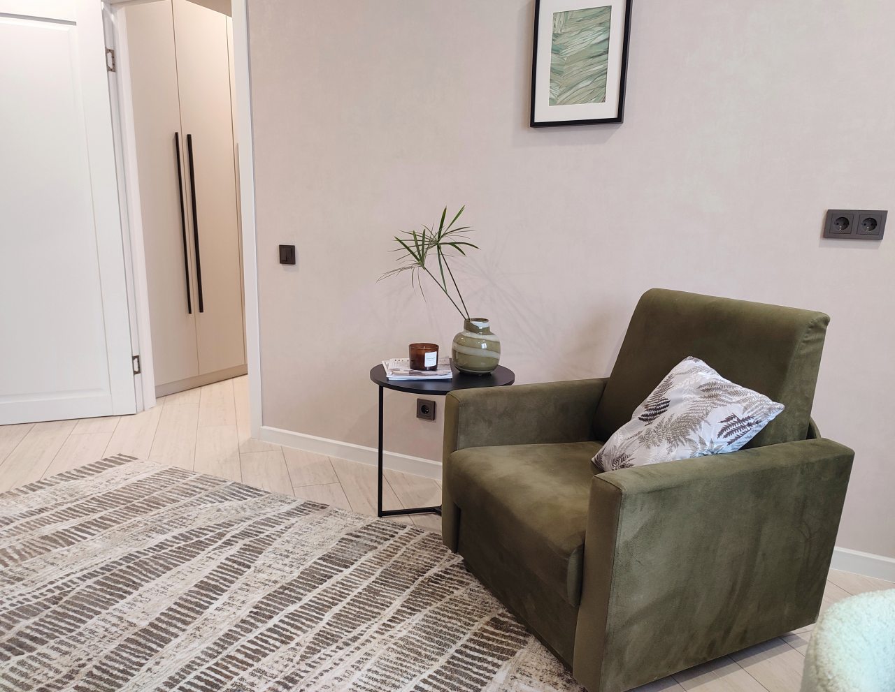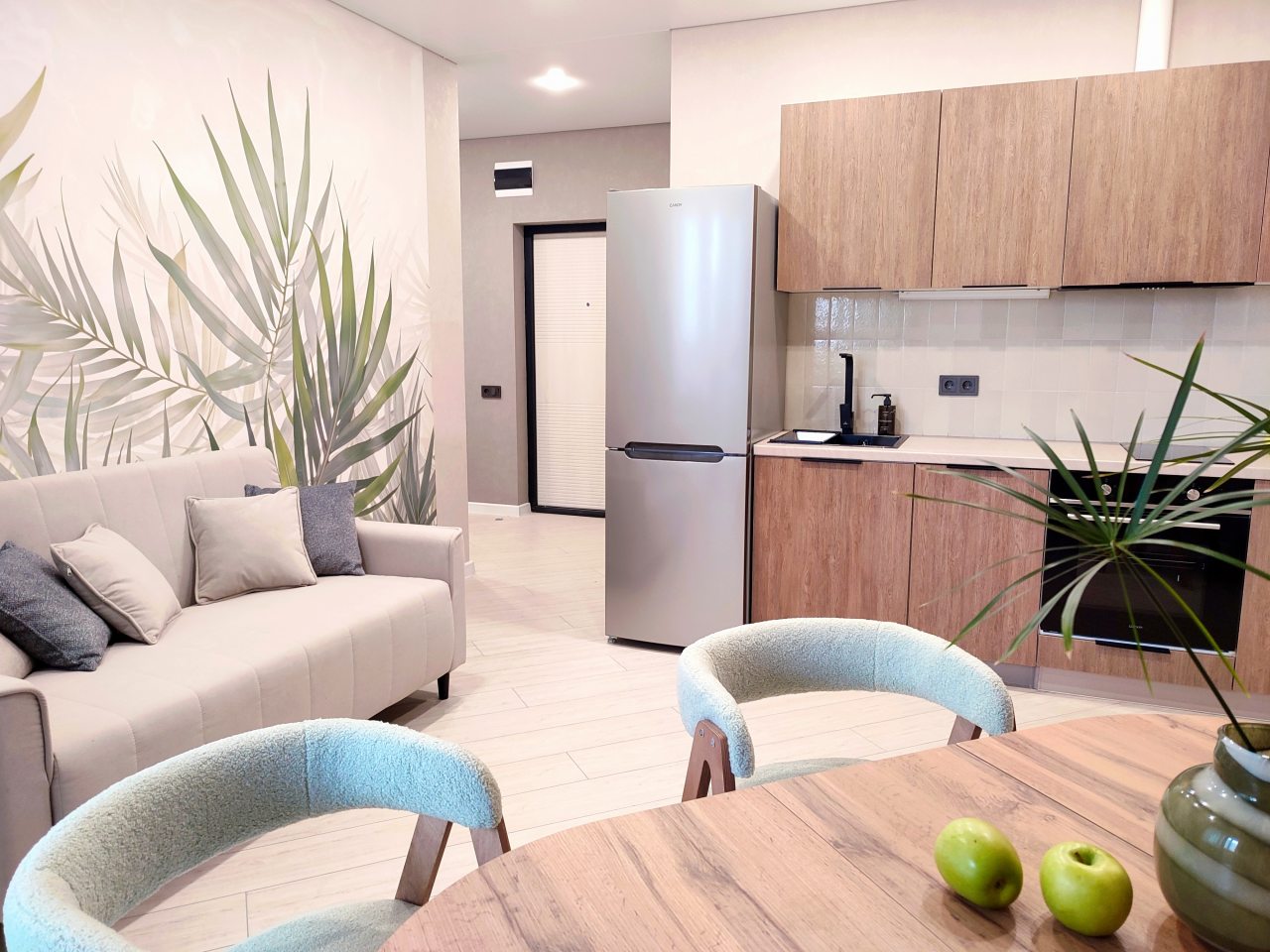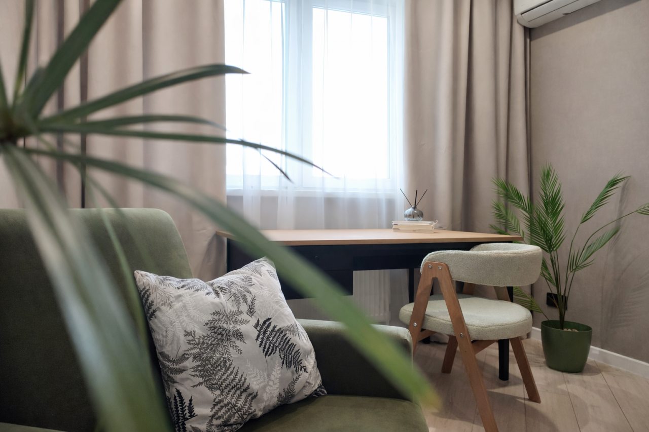 Уютная квартира с современным ремонтом оборудована удобной двуспальной кроватью, розетками возле спального места, диваном, кондиционером, письменным столом, телевизором с онлайн-кинотеатрами, шкафом, wi-fi и др. Санузел оснащен качественной сантехникой, стиральной машиной, гигиеническими средствами.