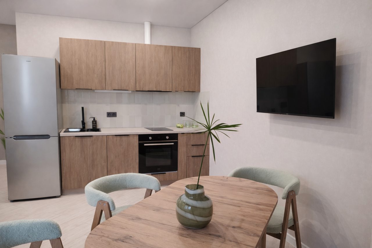 Просторная кухня оборудована комплектом стильного гарнитура, обеденным столом и необходимой бытовой техникой. Пообедать можно в одном из ближайших кафе.