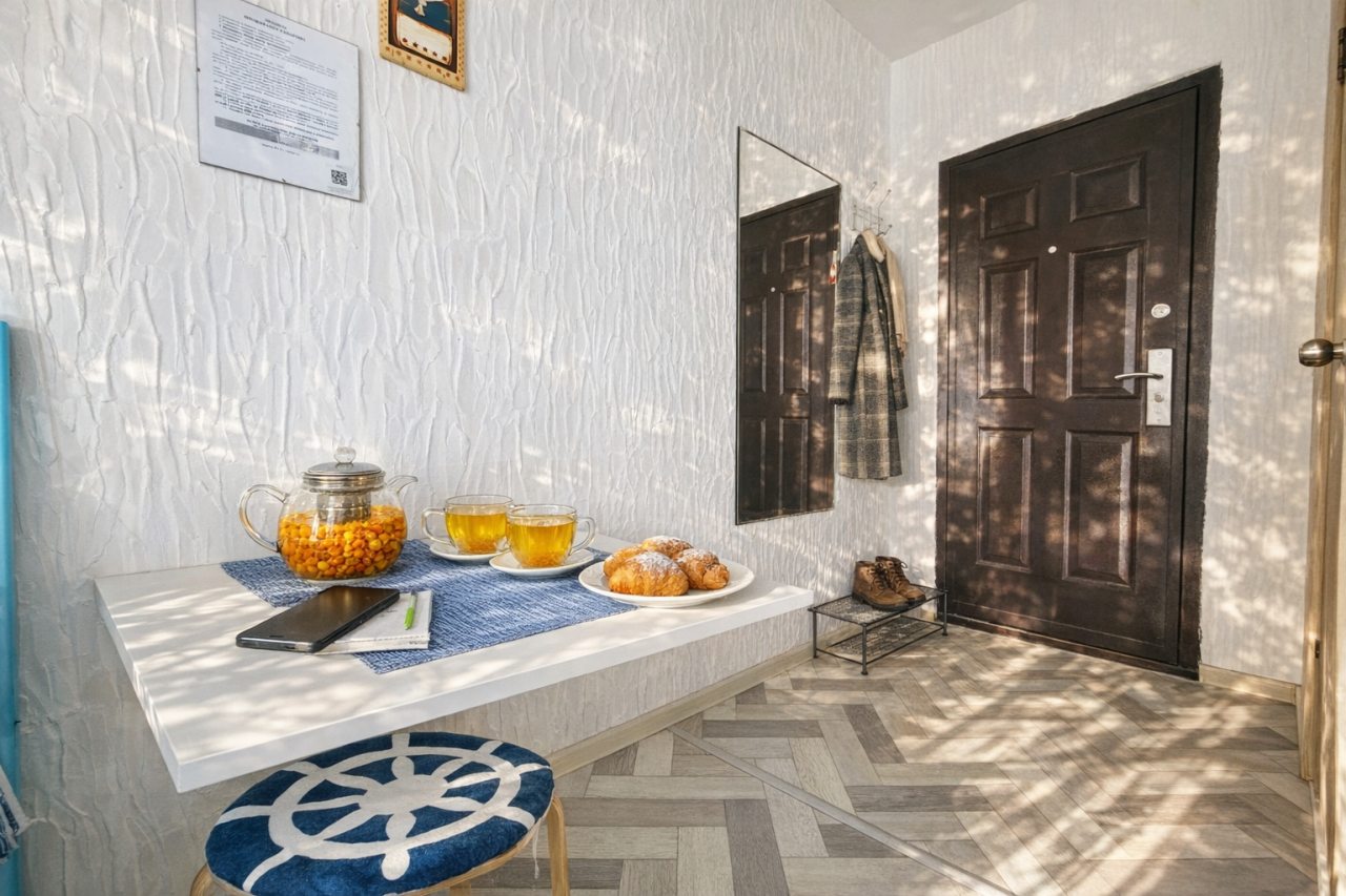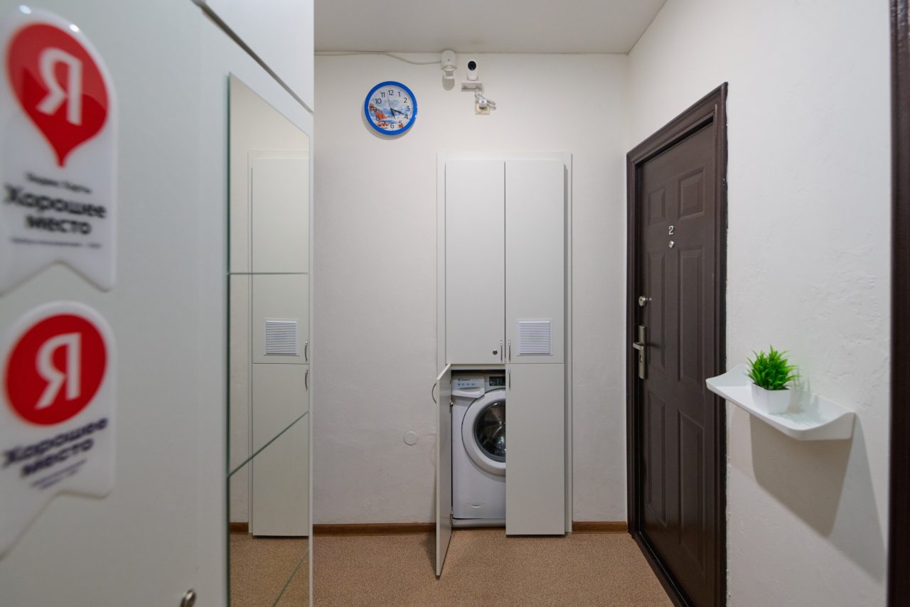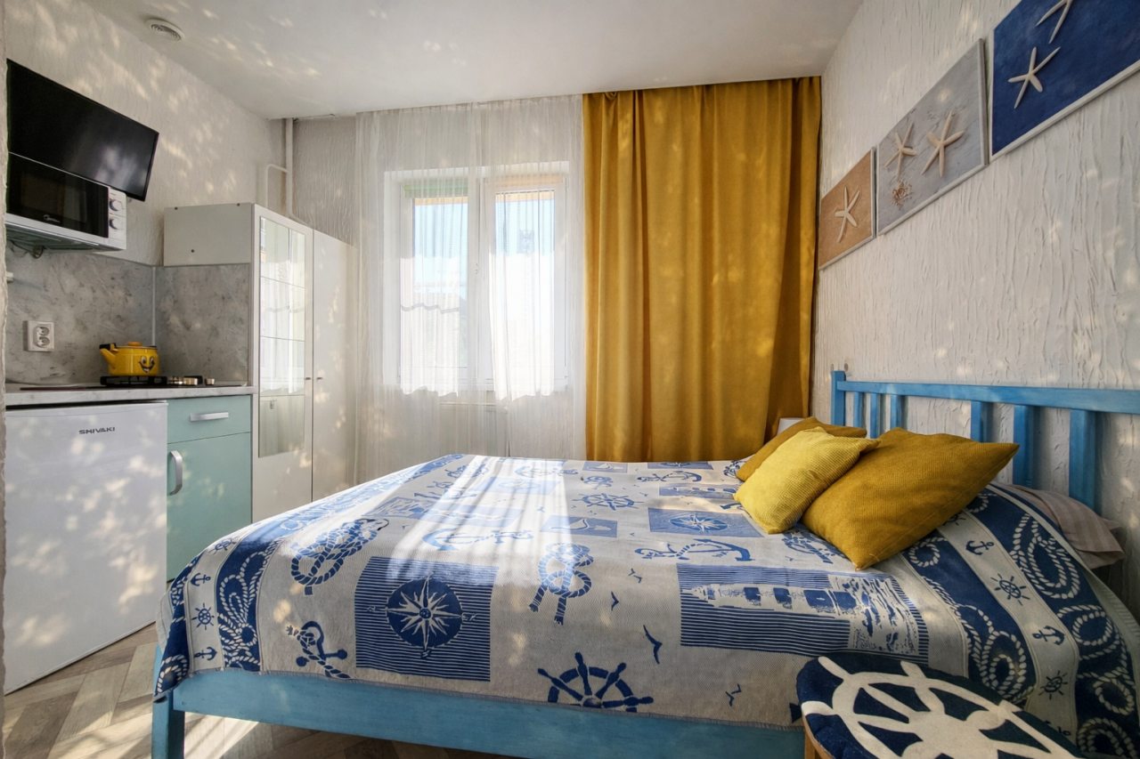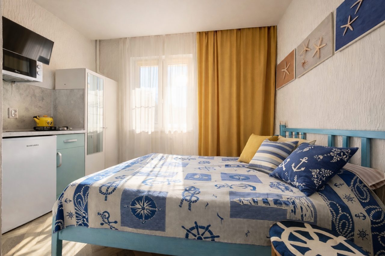 Чисто, без посторонних запахов, недалеко от моря. Удобное заселение. Есть мини кухня со всем необходимым. Есть стиральная машина в общем тамбуре на 2 квартиры. Там же есть гладильная доска, утюг и ведро со шваброй для уборки. Металичесаая дверь в общий тамбур и апартаменты. Есть металическая сушилка