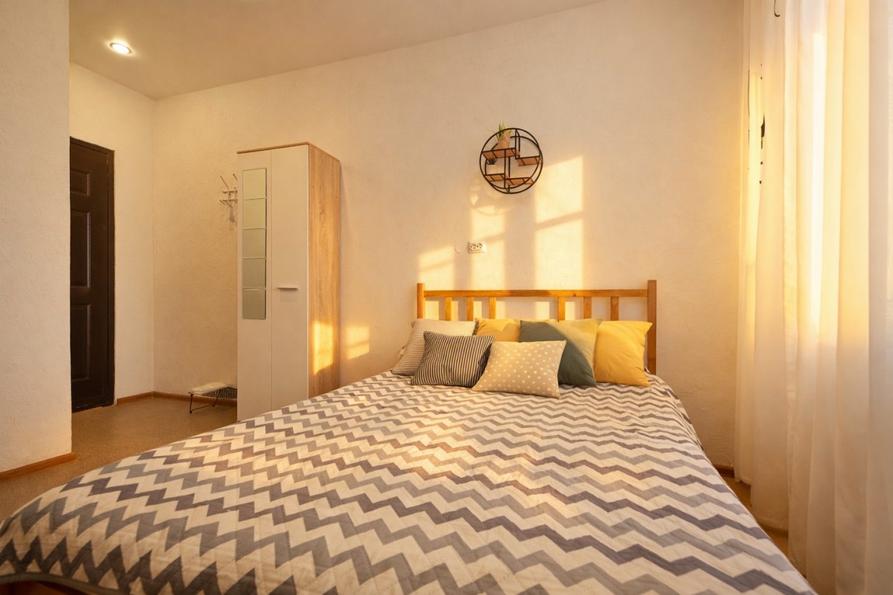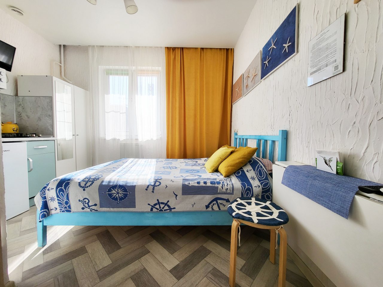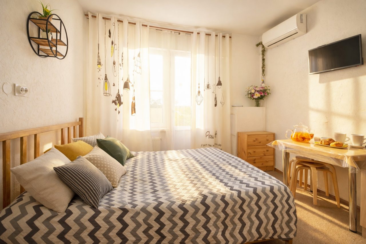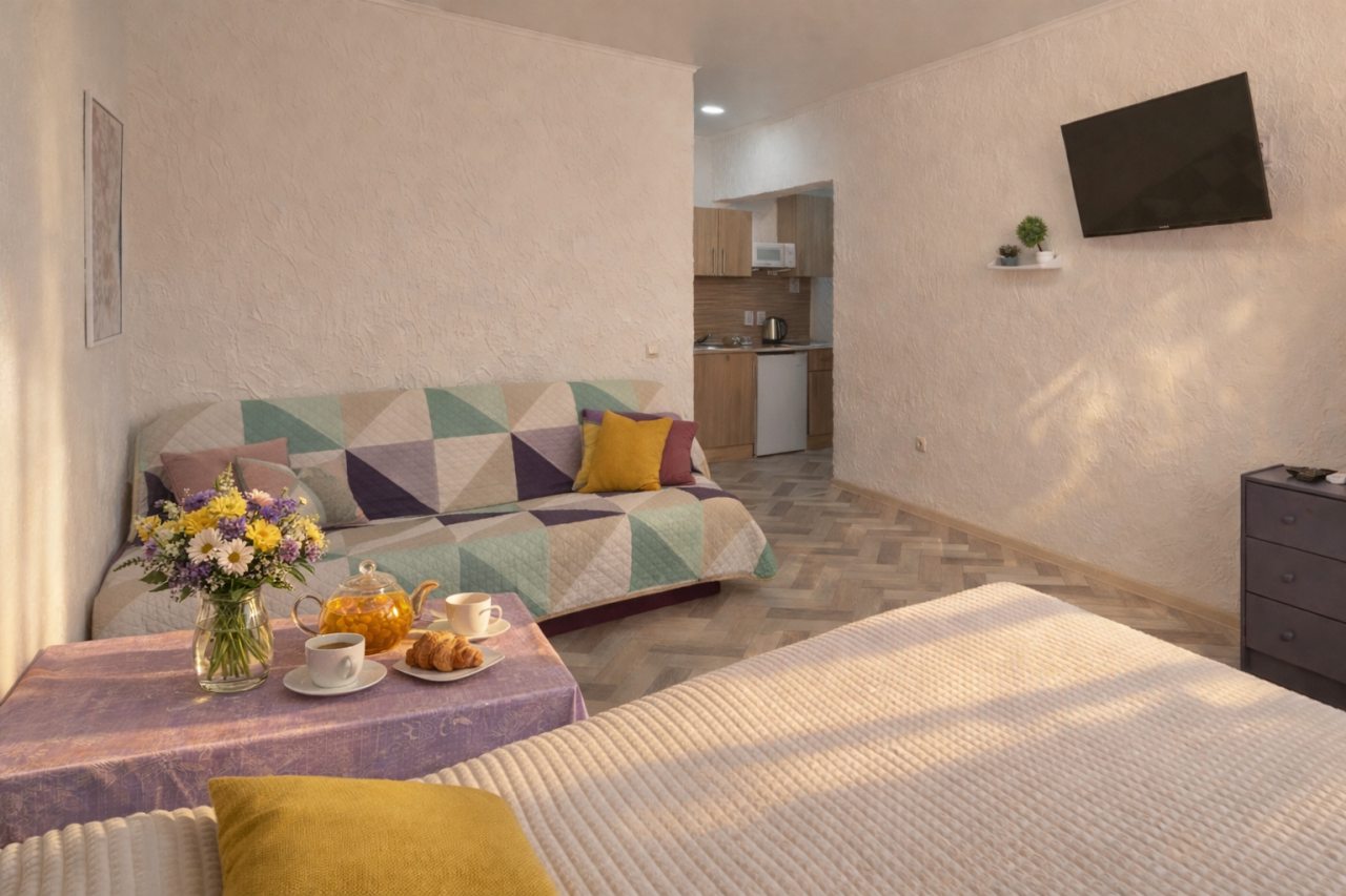 Чисто, без посторонних запахов, недалеко от моря. Удобное заселение. Есть мини кухня со всем необходимым. Есть стиральная машина в общем тамбуре на 2 квартиры. Там же есть гладильная доска, утюг и ведро со шваброй для уборки. Металичесаая дверь в общий тамбур и апартаменты. Есть металическая сушилка