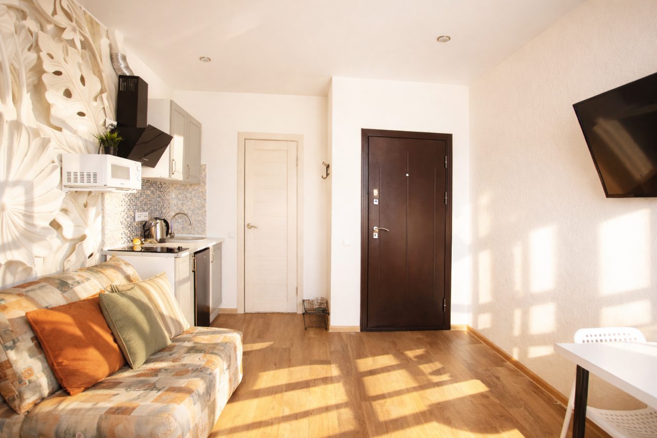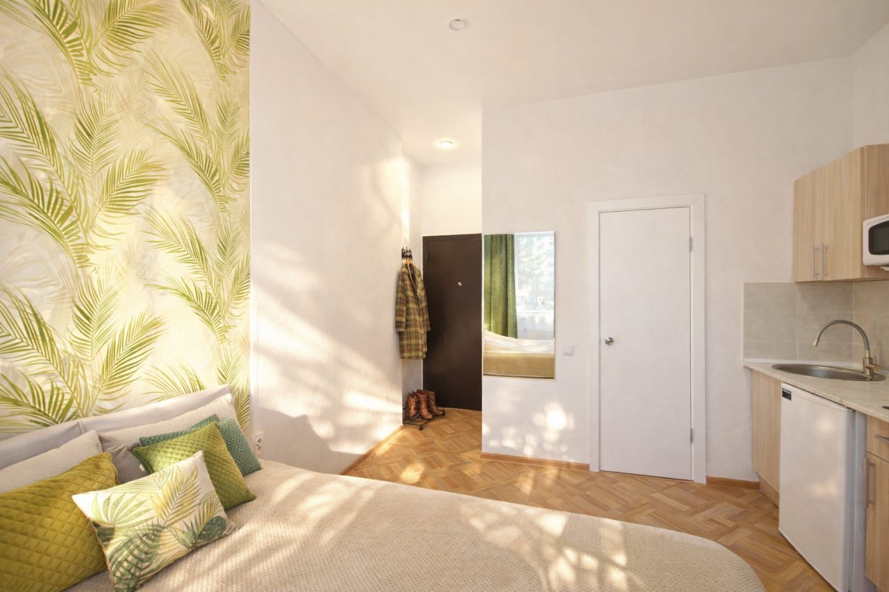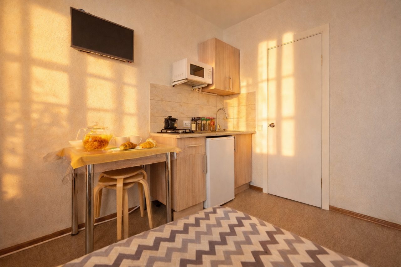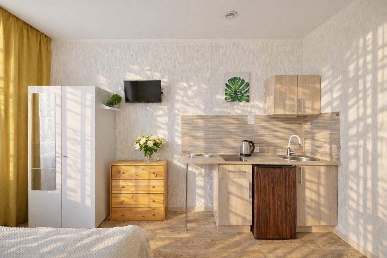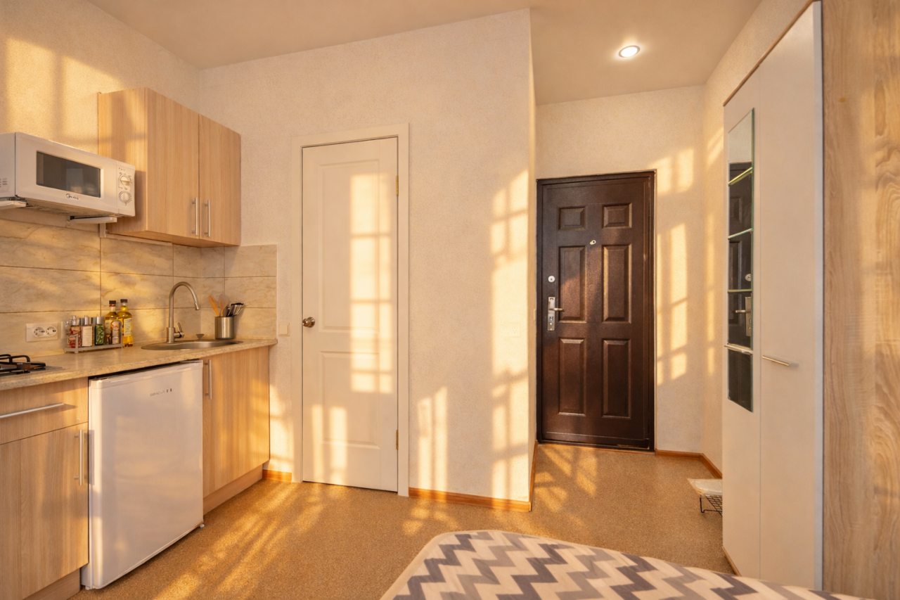 Проживали в трёх местном номере. Студия сделана из квартиры на первом этаже. Чисто, тепло, всё для удобства есть.