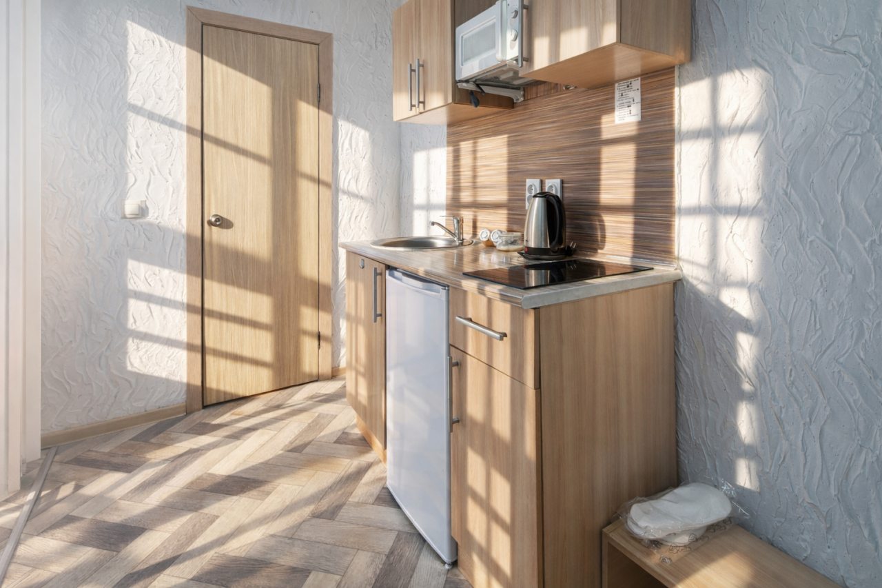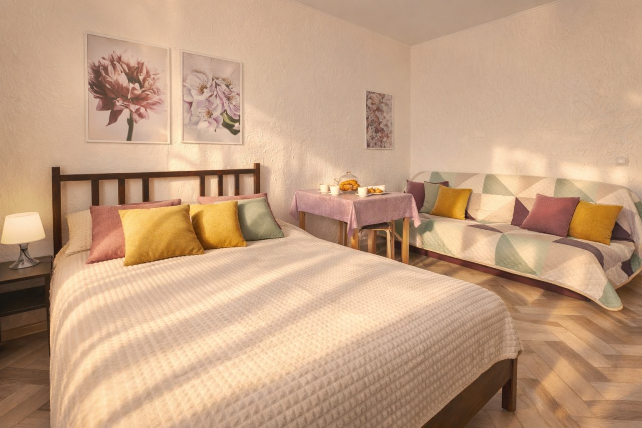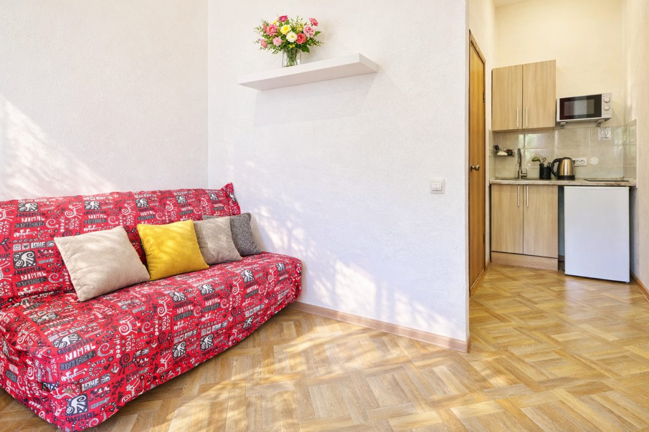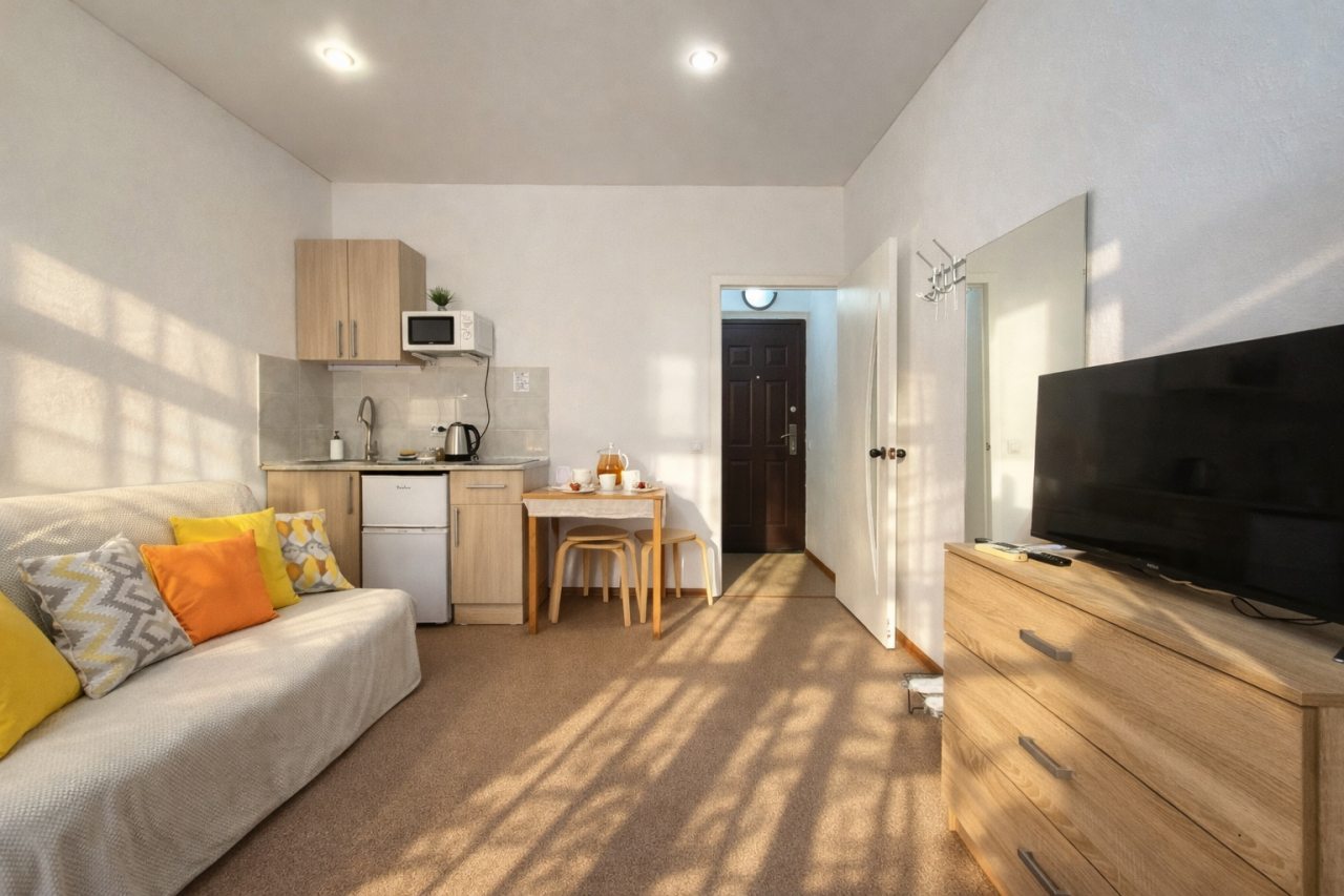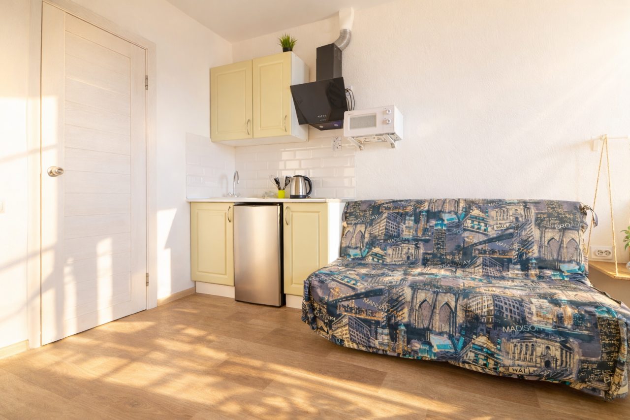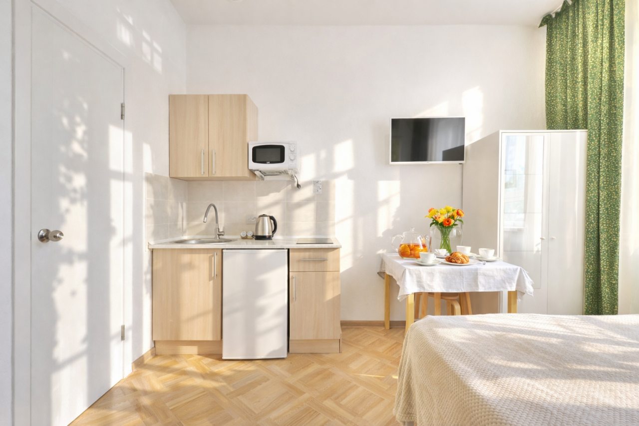 Проживали в трёх местном номере. Студия сделана из квартиры на первом этаже. Чисто, тепло, всё для удобства есть.