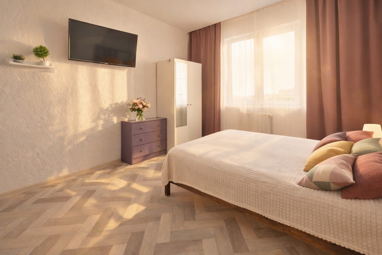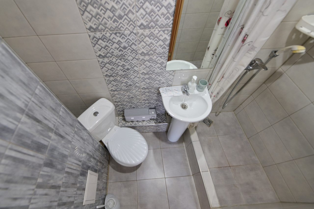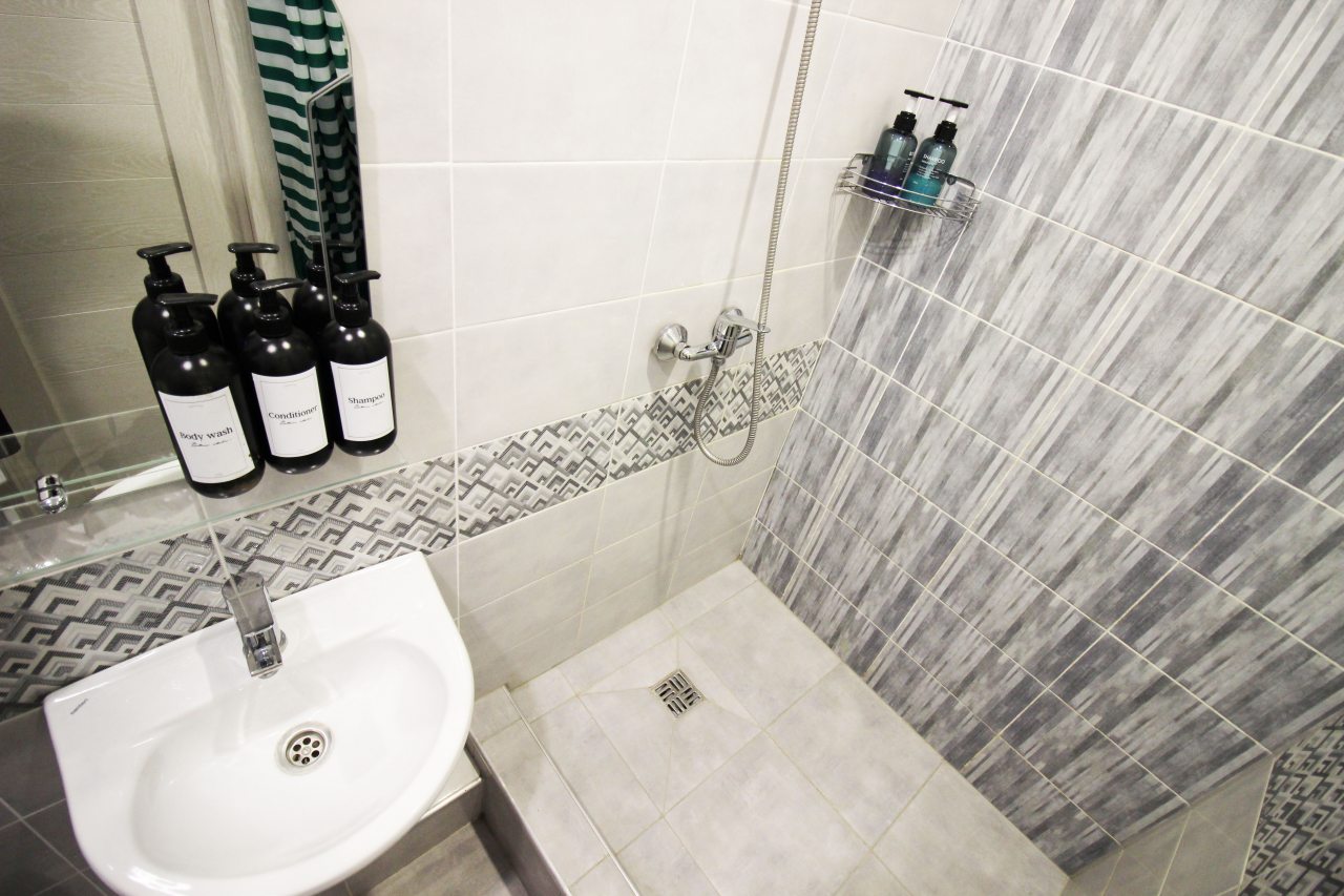 Из недостатков: мало мебели: шкаф, как игрушечный, в нём лежат подушки и одеяла, можно разместить на вешалках 7 футболок и всё, рядом игрушечный комод, так же не вместительный совсем. У кровати одна тумбочка вернее металическая конструкция и диван. На стене есть полочка, но декоративная. Так что вещи были в сумках на полу. Кондиционер над головой - не удачное решение. В ванной аналогично нет полочекшкафа или тумбочки, но есть стремянка! Нет балкона и вещи сущить необходимо в помещении. Вентиляция работает плохо. Почему-то 1.5 полотенца в апартаментах для двоих