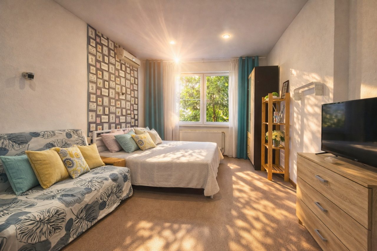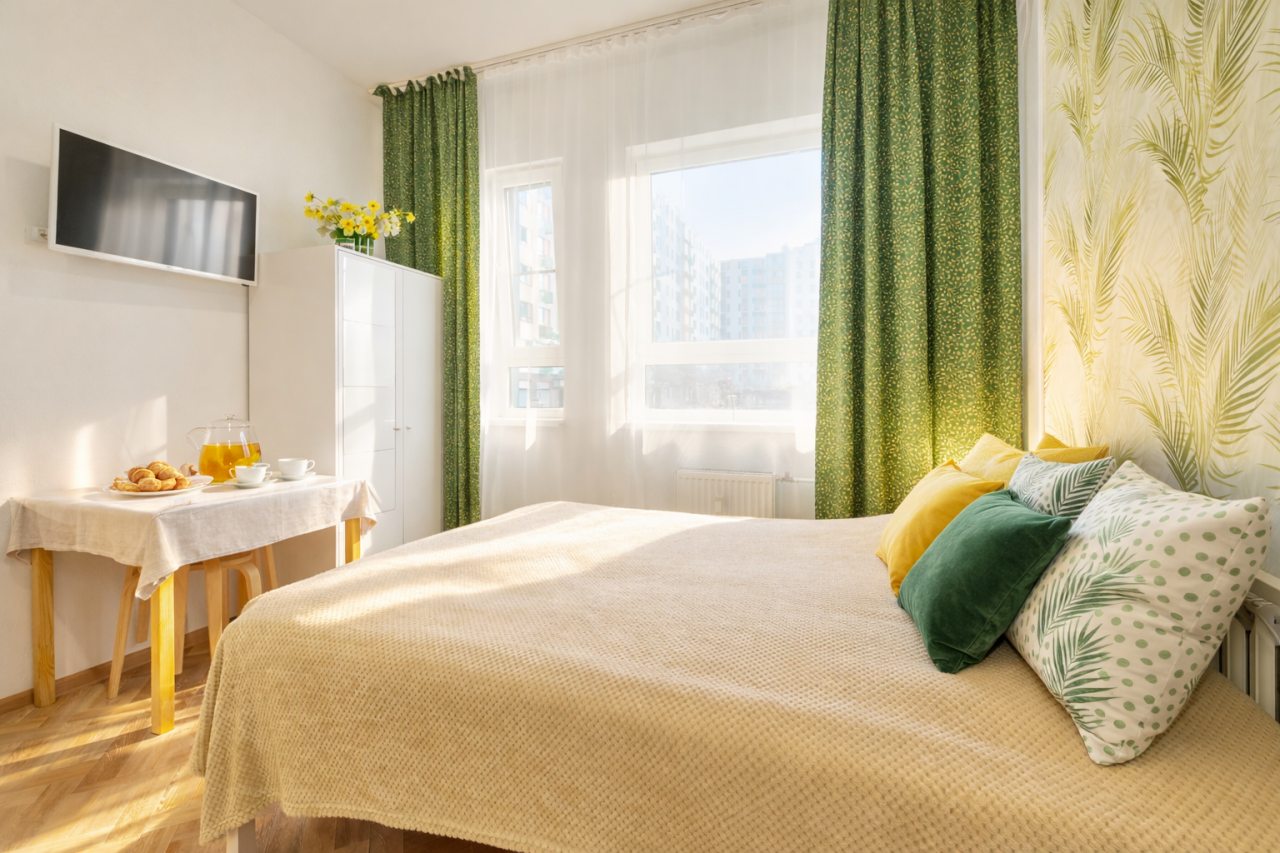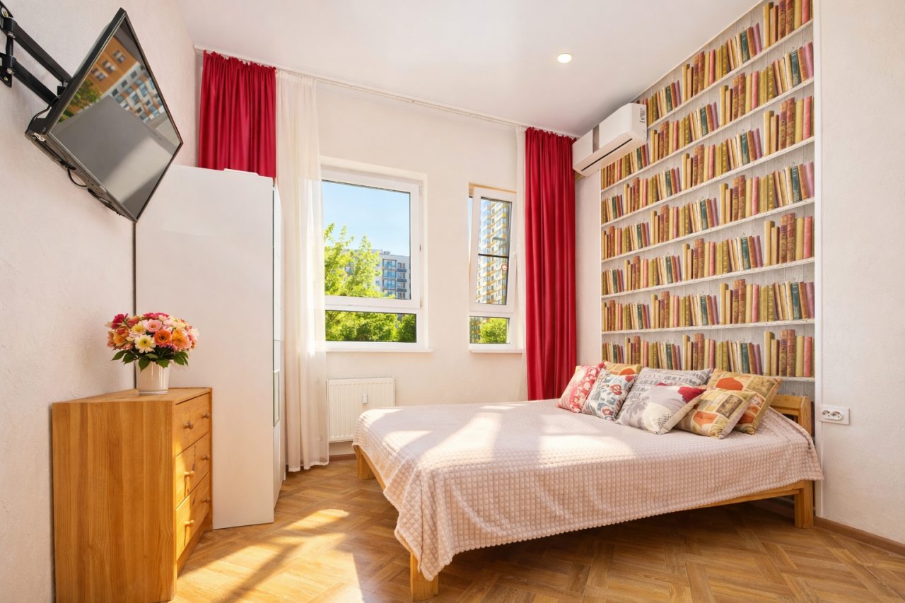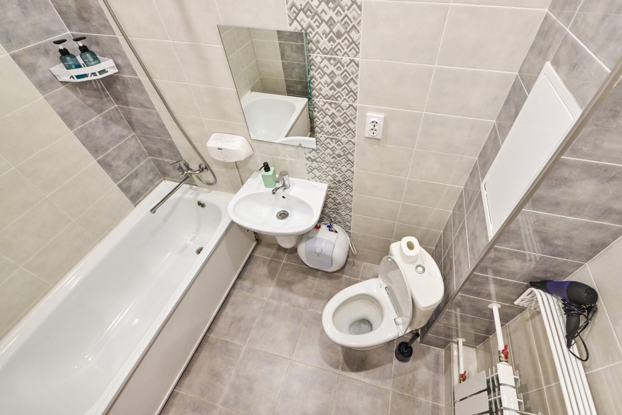 Из недостатков: мало мебели: шкаф, как игрушечный, в нём лежат подушки и одеяла, можно разместить на вешалках 7 футболок и всё, рядом игрушечный комод, так же не вместительный совсем. У кровати одна тумбочка вернее металическая конструкция и диван. На стене есть полочка, но декоративная. Так что вещи были в сумках на полу. Кондиционер над головой - не удачное решение. В ванной аналогично нет полочекшкафа или тумбочки, но есть стремянка! Нет балкона и вещи сущить необходимо в помещении. Вентиляция работает плохо. Почему-то 1.5 полотенца в апартаментах для двоих