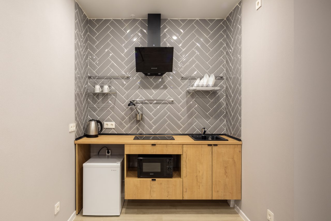 Комплектация кухонной бытовой техники может варьироваться. В каждом номере имеются плита, чайник, холодильник, СВЧ, уютная обеденная зона.