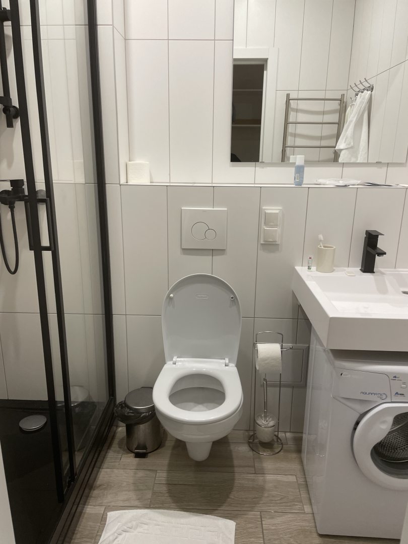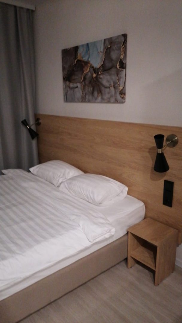 Замечательные аппартаменты. Абсолютно новый дом. В номерах чисто (снимали сразу три номера). Чистое, белоснежное белье и полотенца. Отличные ортопедические матрасы. Для нас это важно. Кухня с новой посудой и стиральная машина в каждом номере. Бутылочка воды на человека каждый день. Рядом недорогая платная парковка и кафе-столовая, где можно сытно позавтракать, пообедать и поужинать, если не хочется готовить самим.