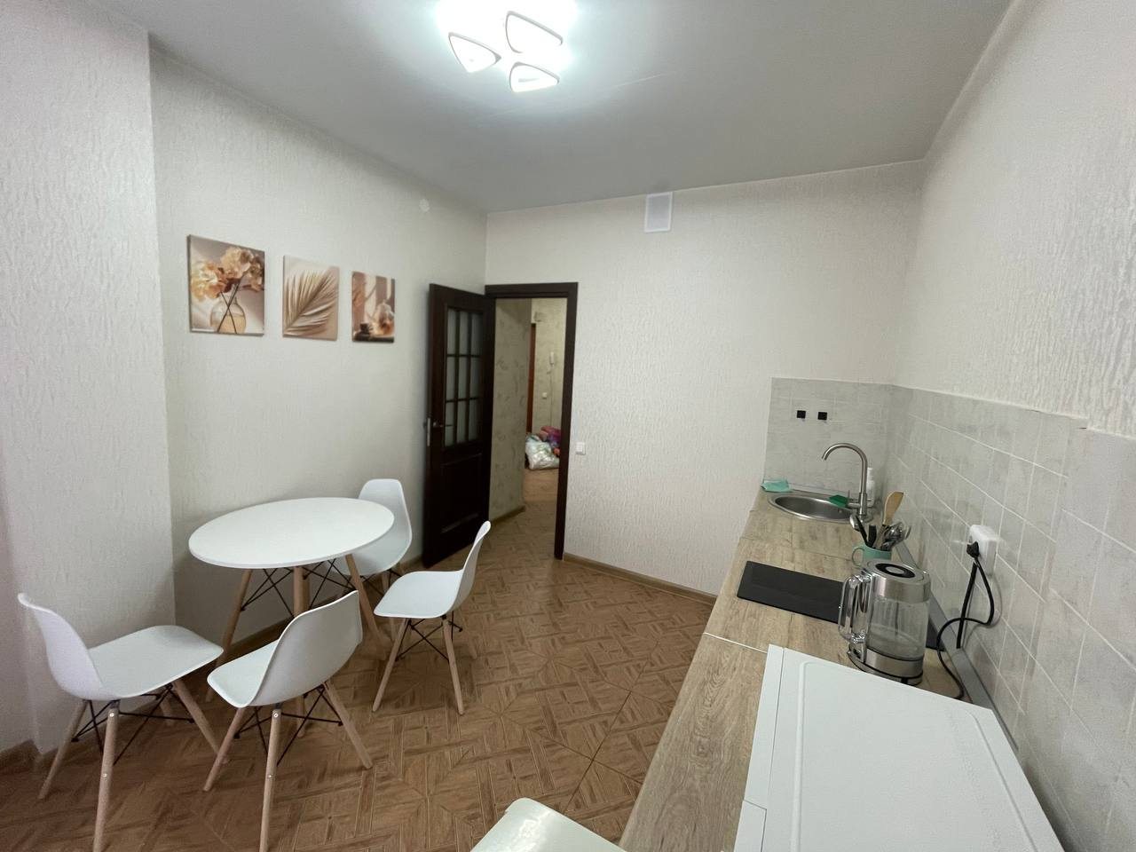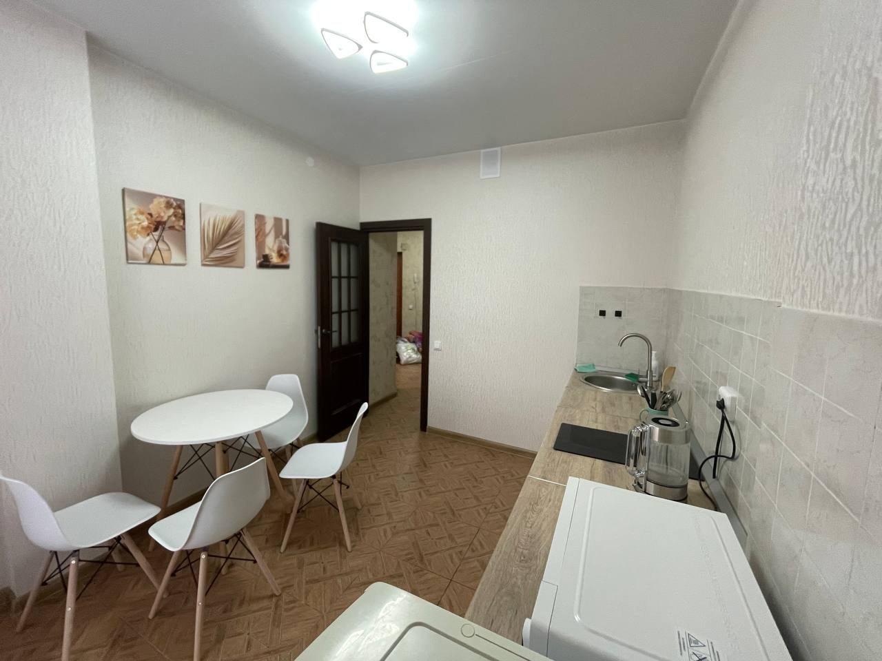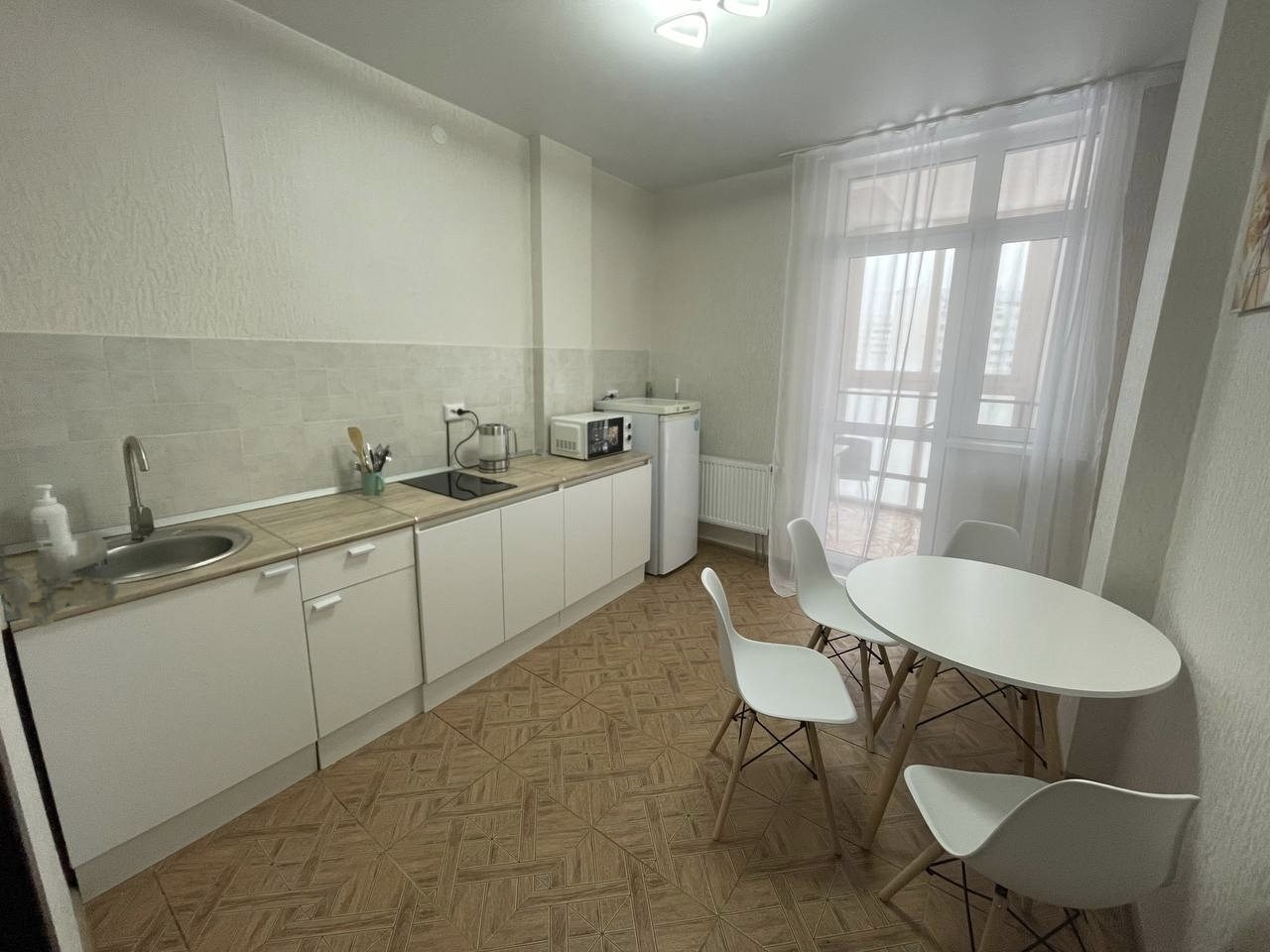 Просторная кухня оснащена чайником, белоснежным гарнитуром, варочной панелью, микроволновой печью, холодильником и обеденным столом.