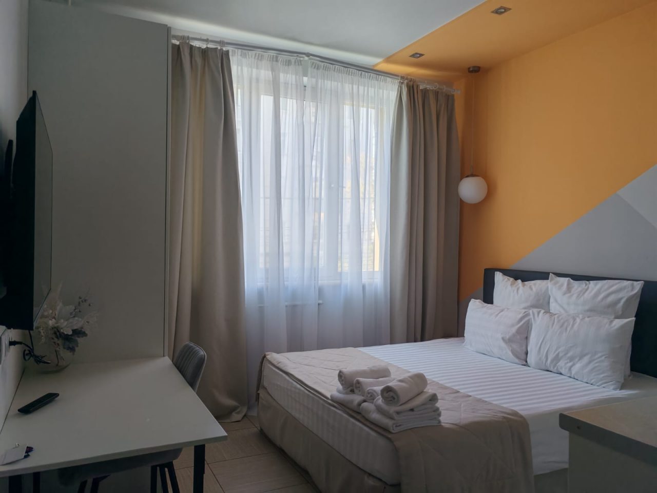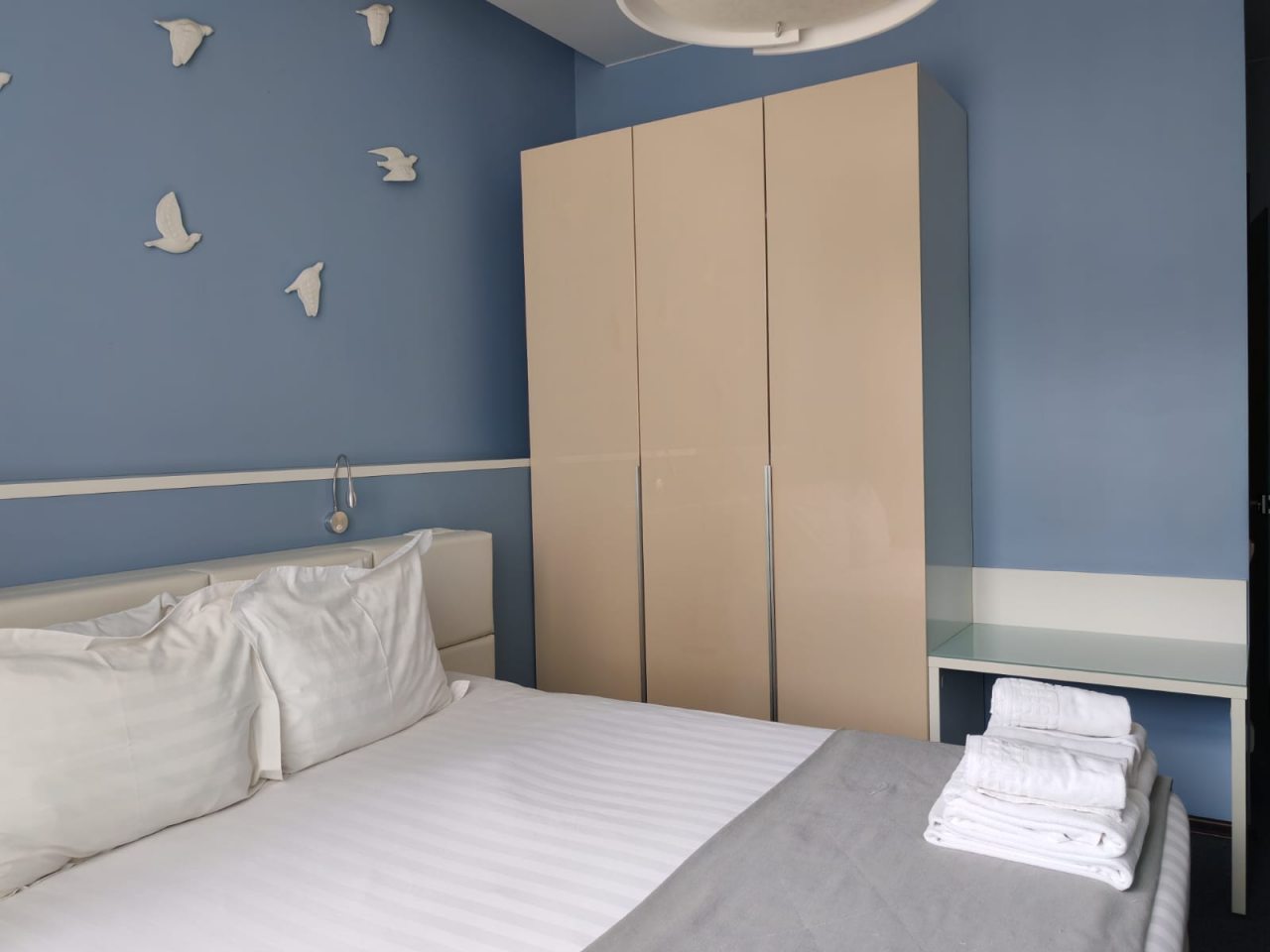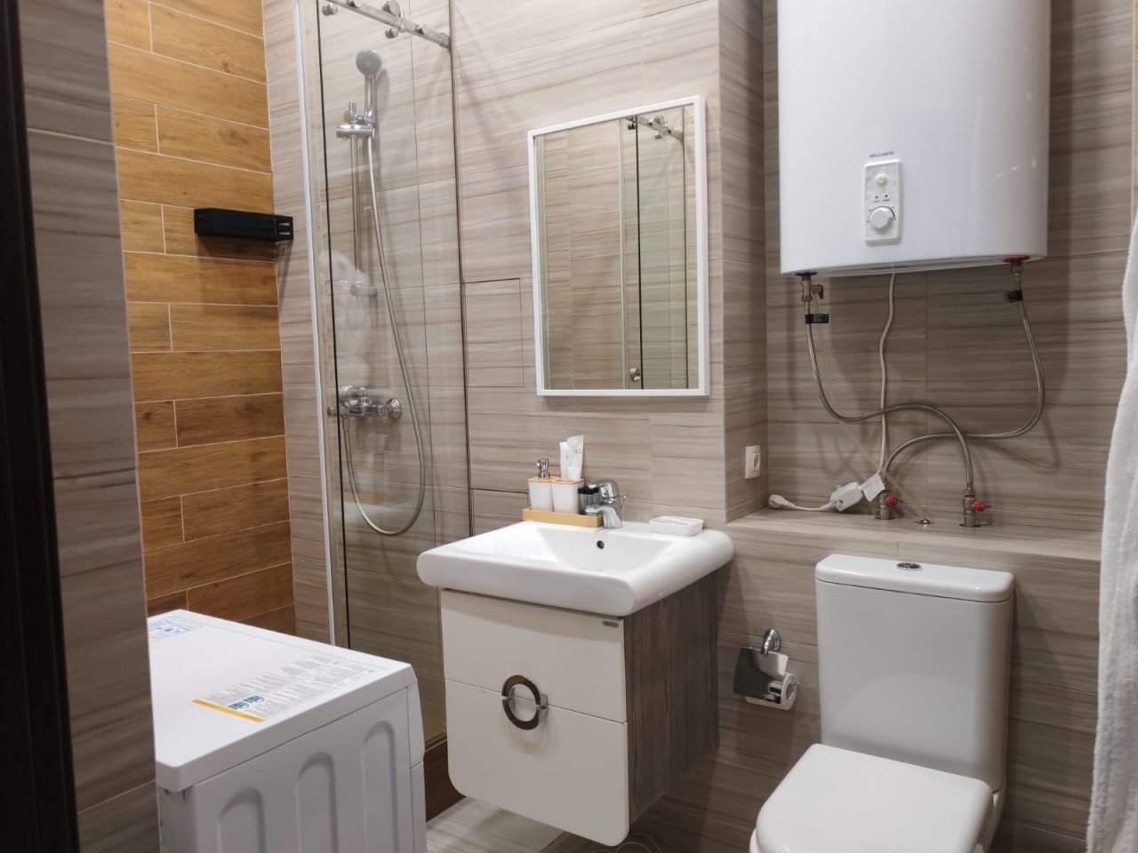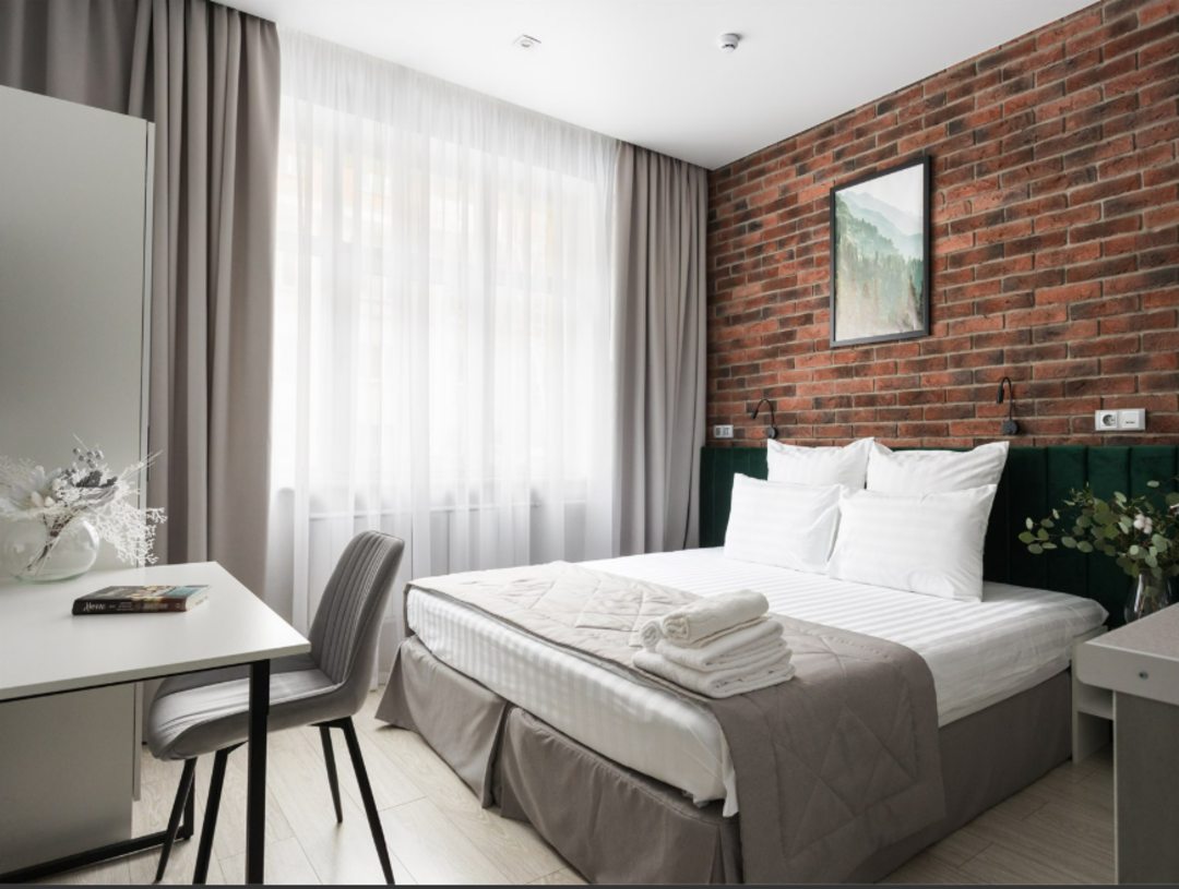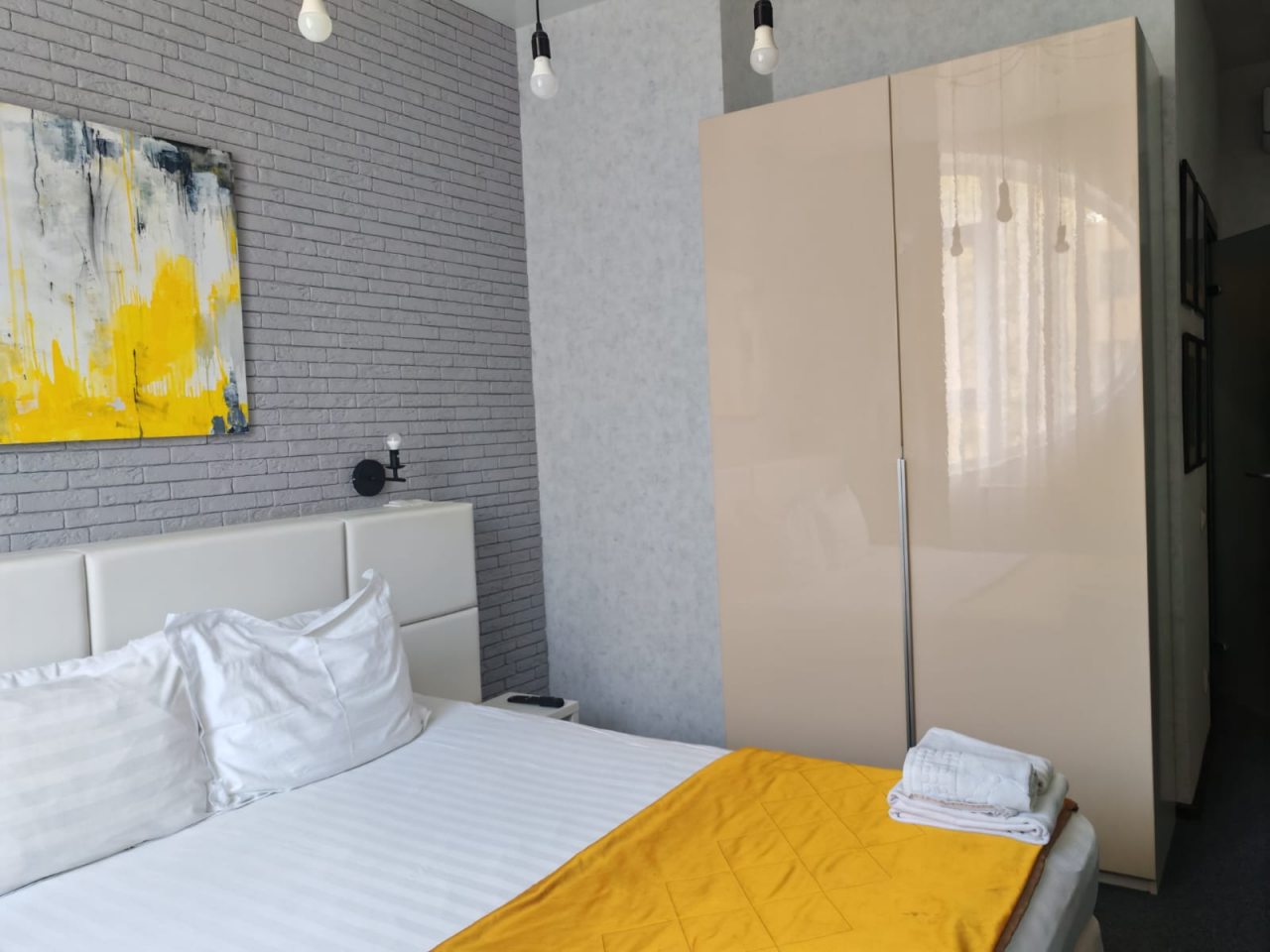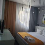 Современные апартаменты с ремонтом в приятных светлых тонах подготовлены к пребыванию гостей и оснащены: двуспальной кроватью, прикроватными тумбочками, письменным столом, телевизором. В санузле есть фен и халаты.