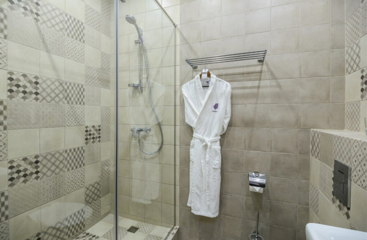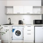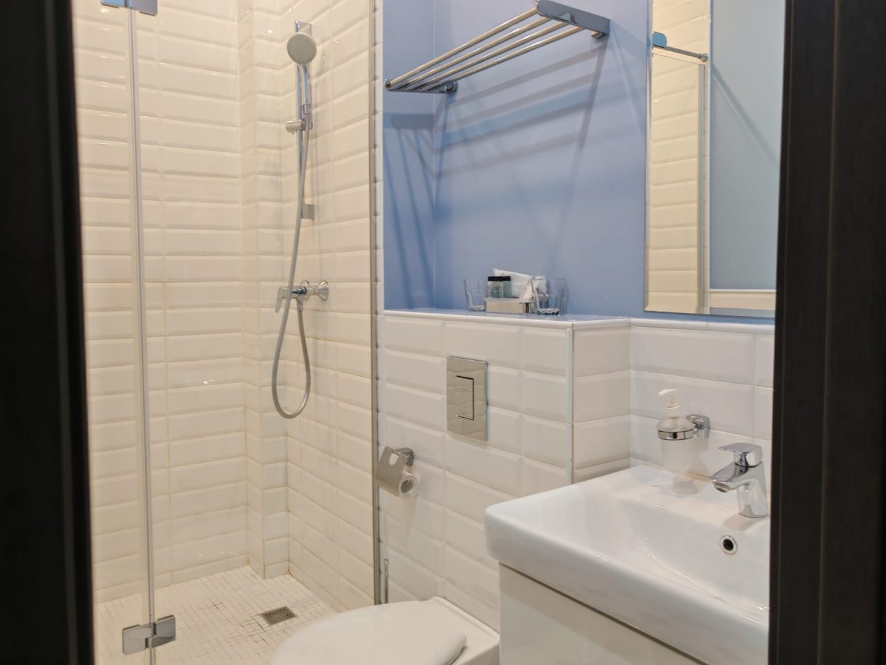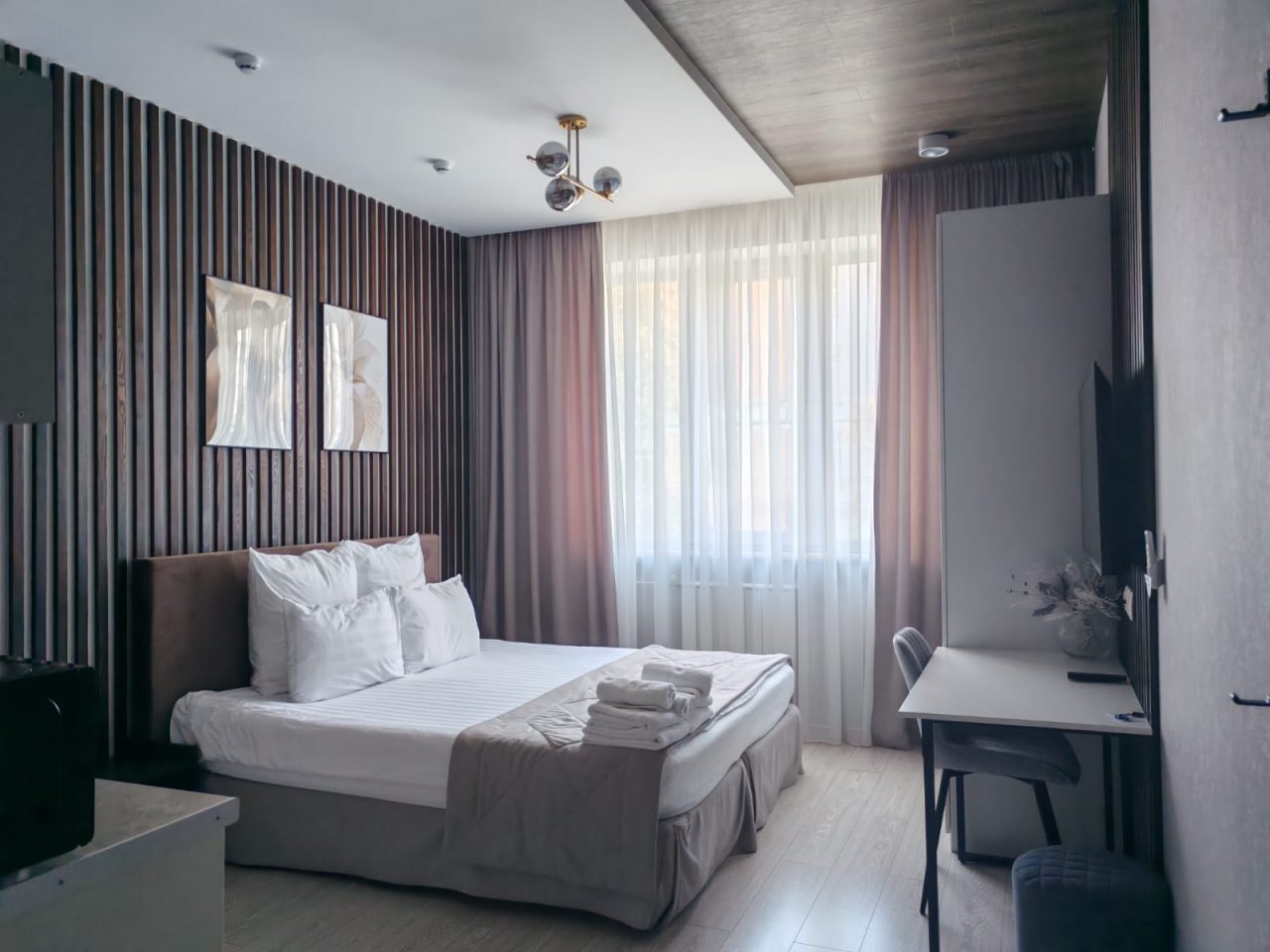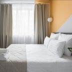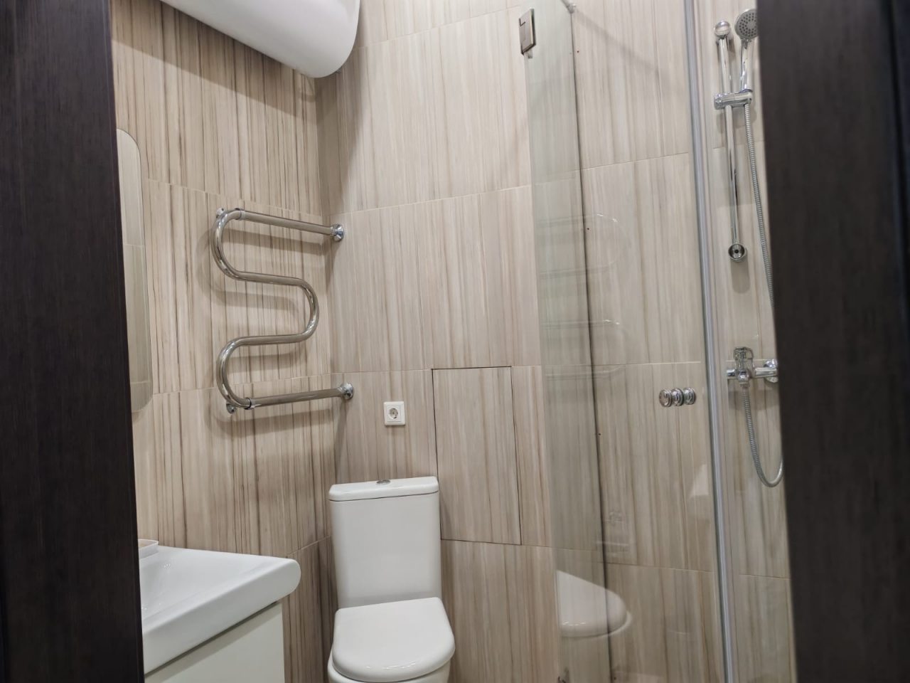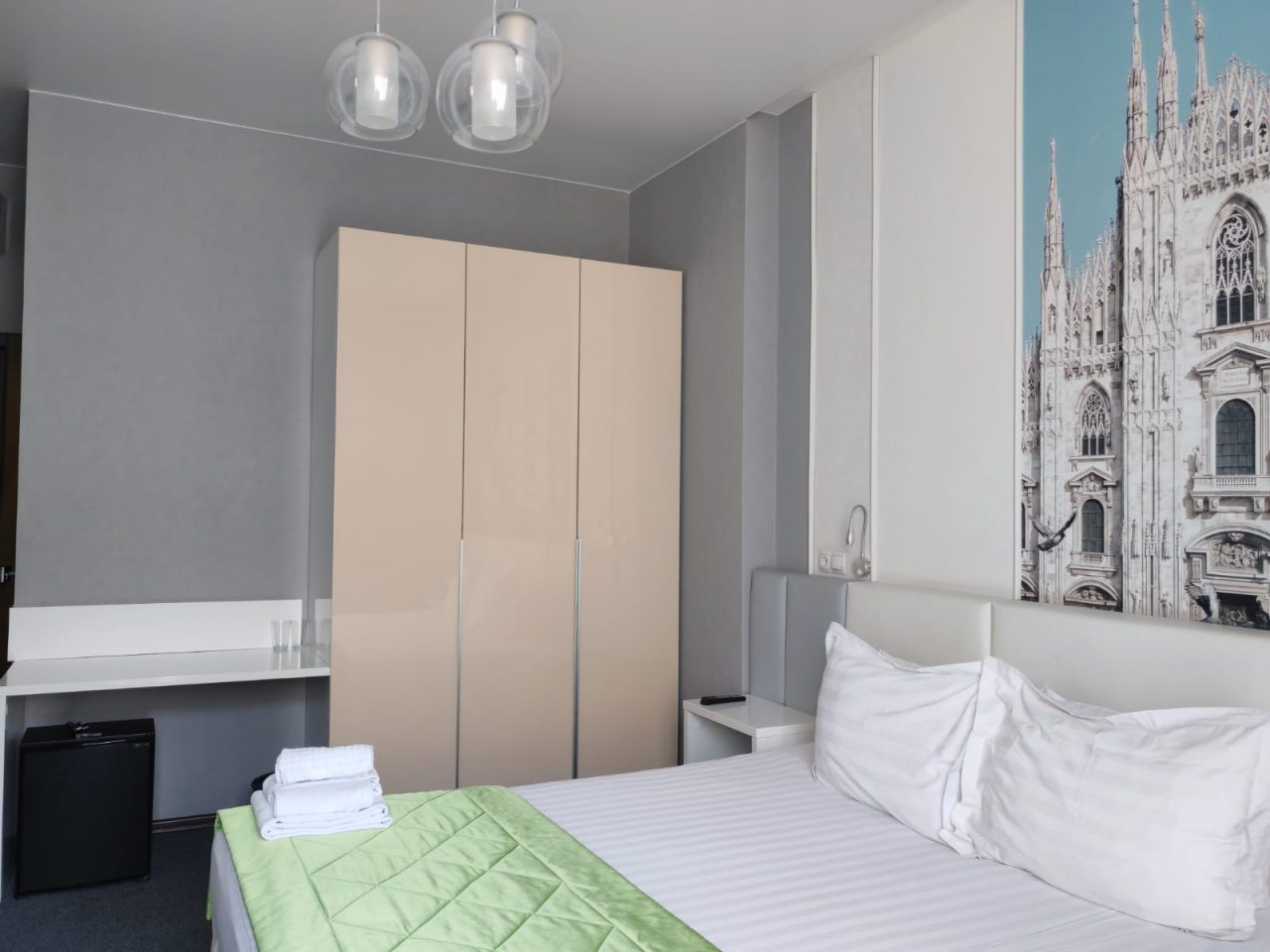 Современные апартаменты с ремонтом в приятных светлых тонах подготовлены к пребыванию гостей и оснащены: двуспальной кроватью, прикроватными тумбочками, письменным столом, телевизором. В санузле есть фен и халаты.