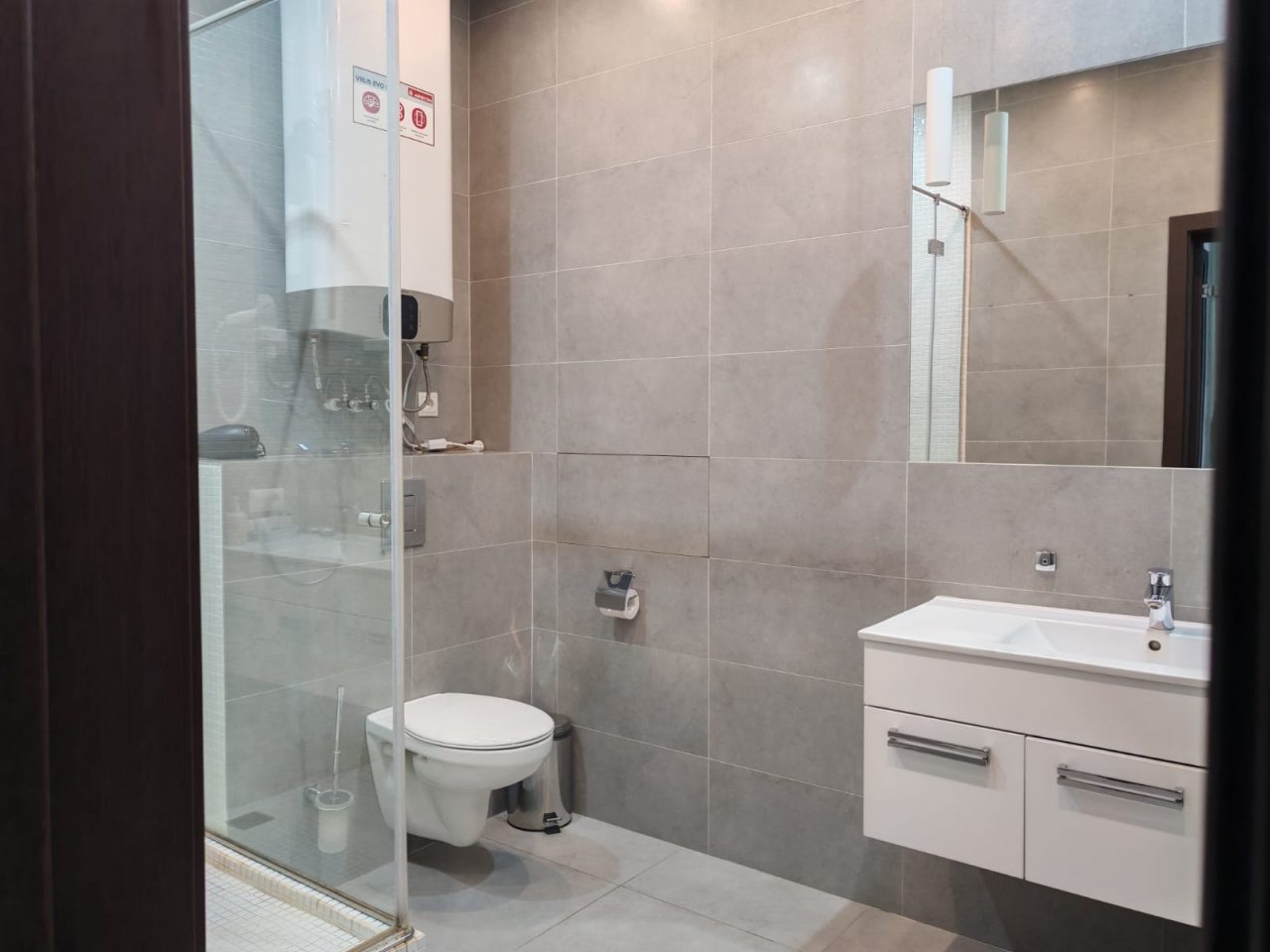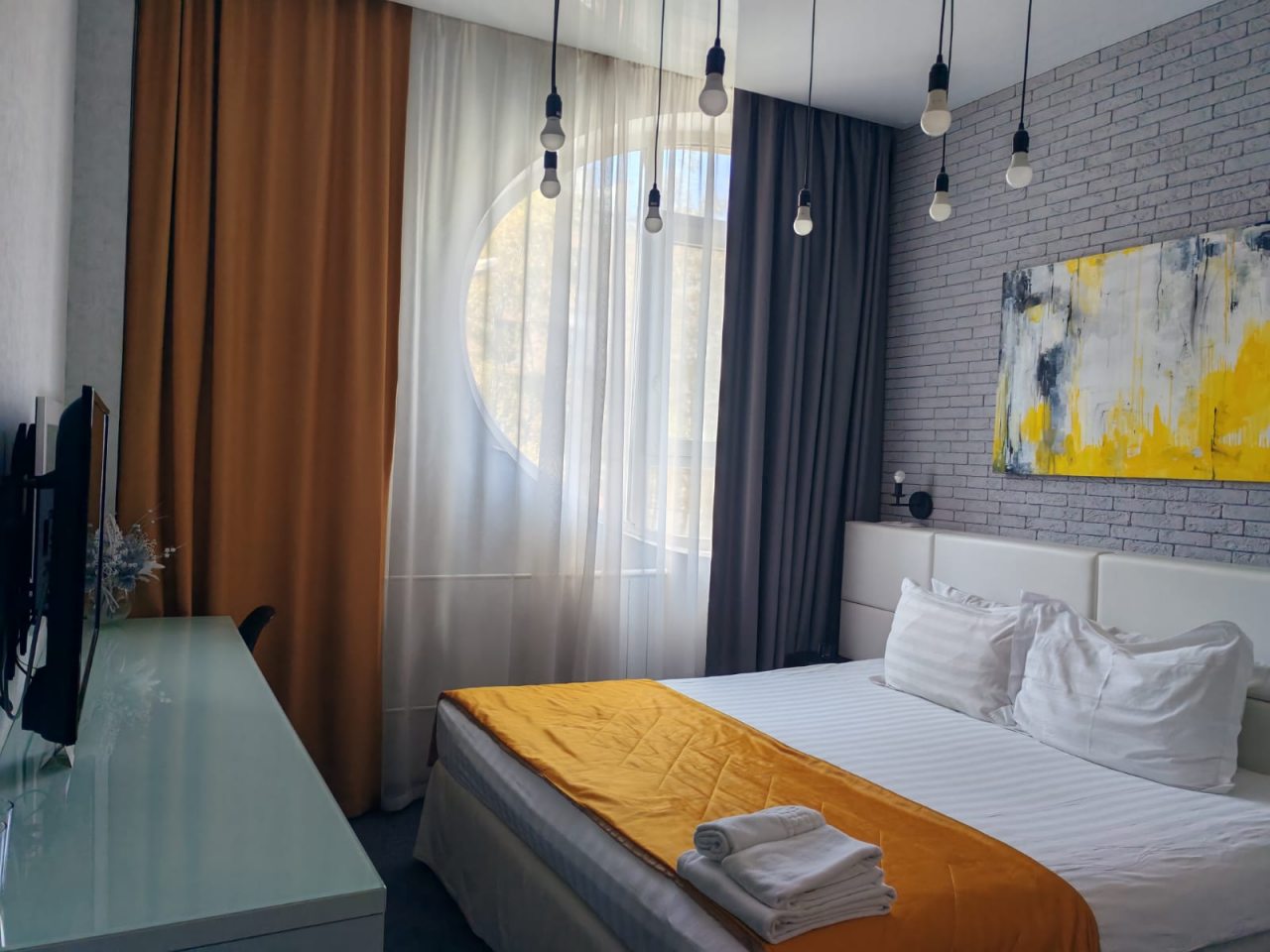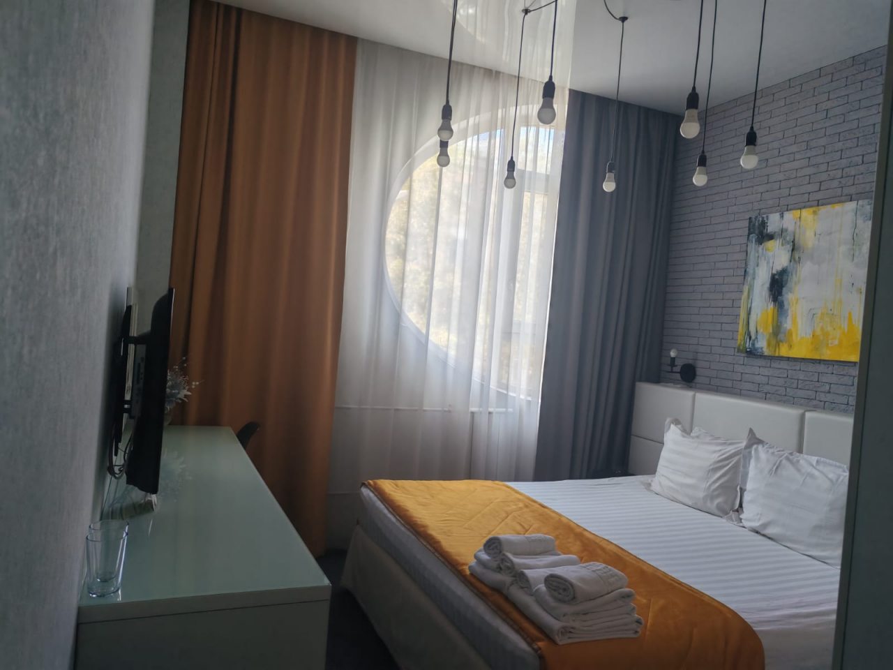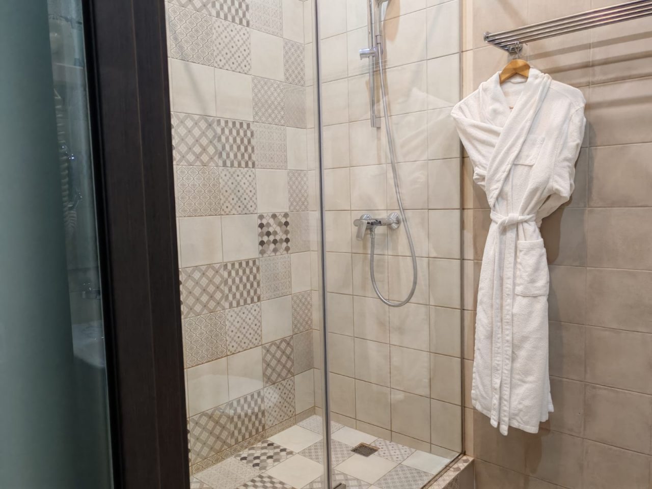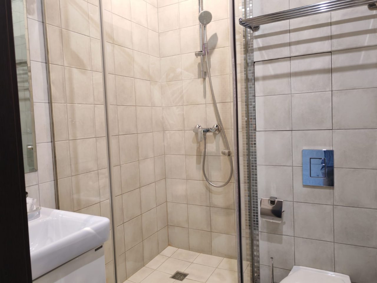 Современные апартаменты с ремонтом в приятных светлых тонах подготовлены к пребыванию гостей и оснащены: двуспальной кроватью, прикроватными тумбочками, письменным столом, телевизором. В санузле есть фен и халаты.