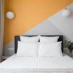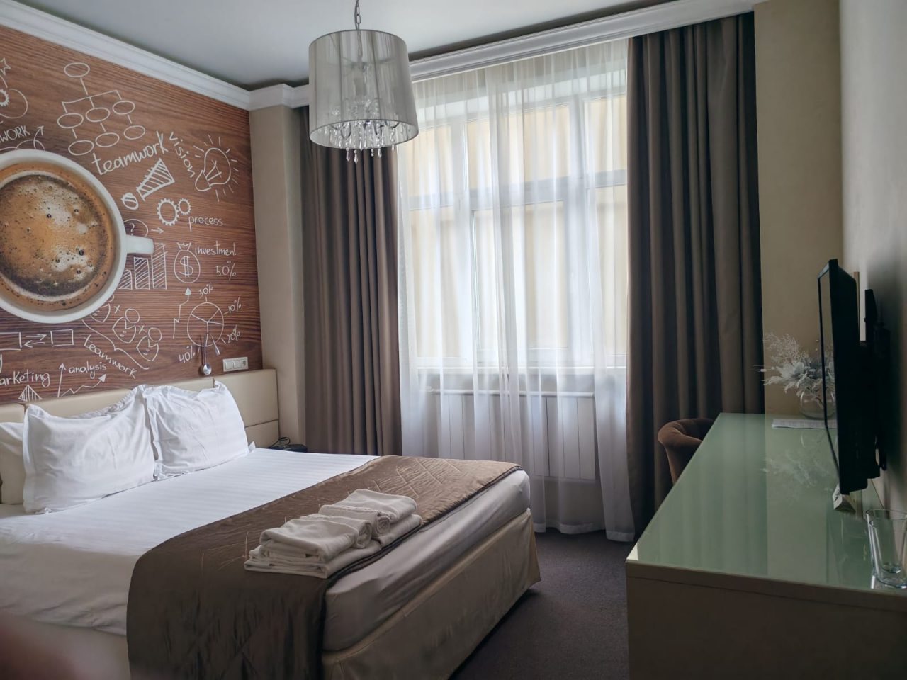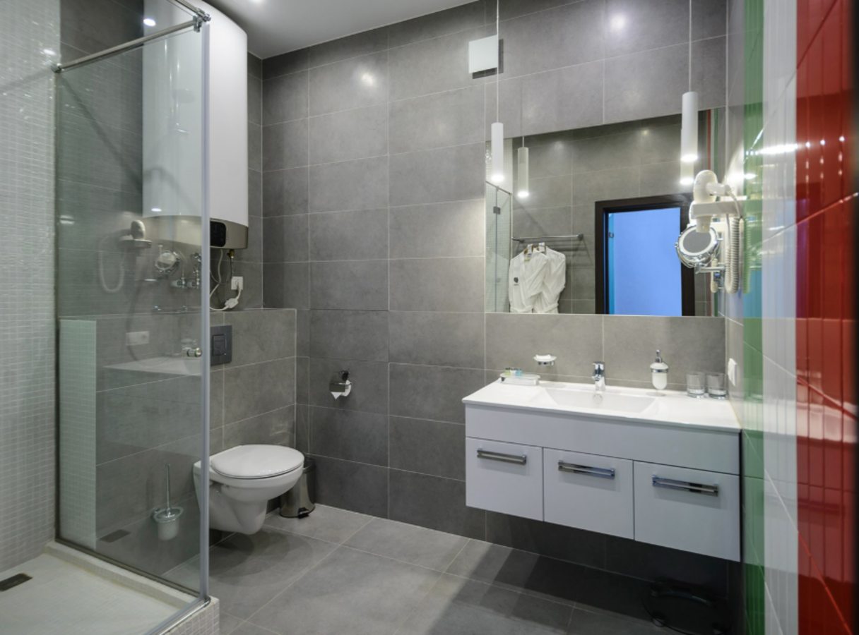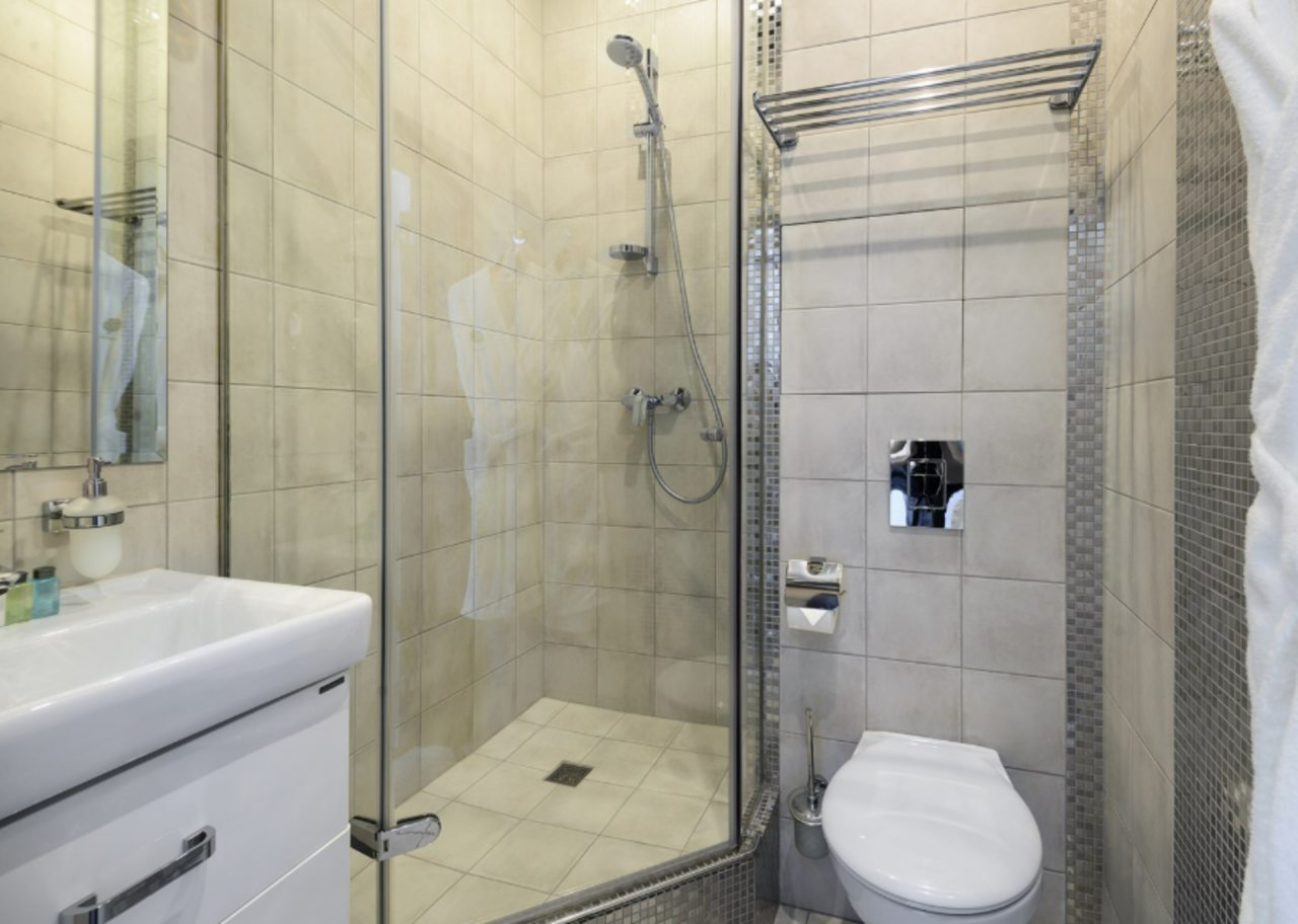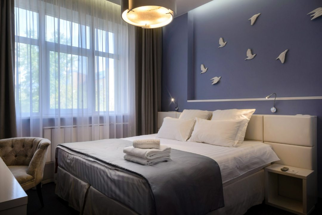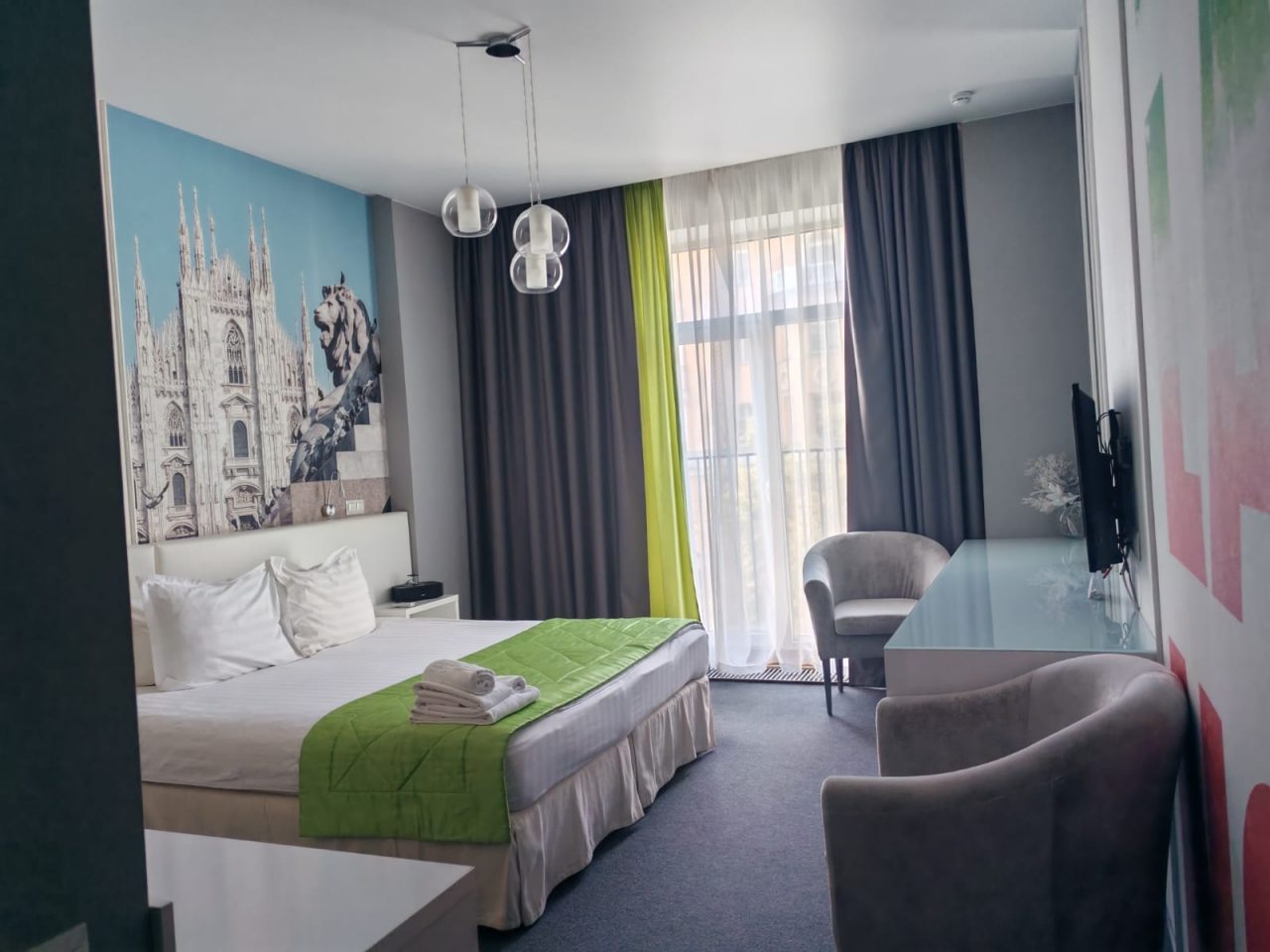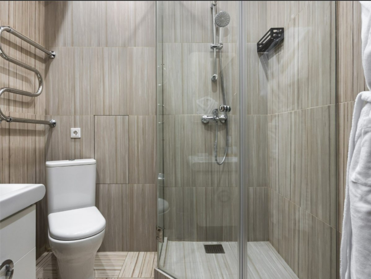 Современные апартаменты с ремонтом в приятных светлых тонах подготовлены к пребыванию гостей и оснащены: двуспальной кроватью, прикроватными тумбочками, письменным столом, телевизором. В санузле есть фен и халаты.