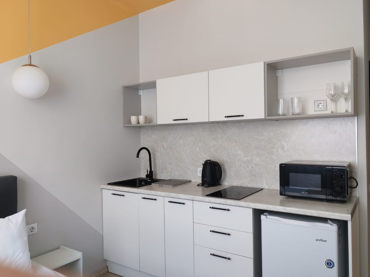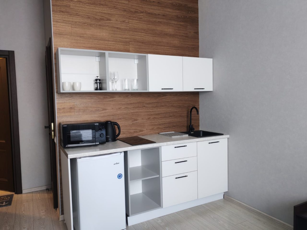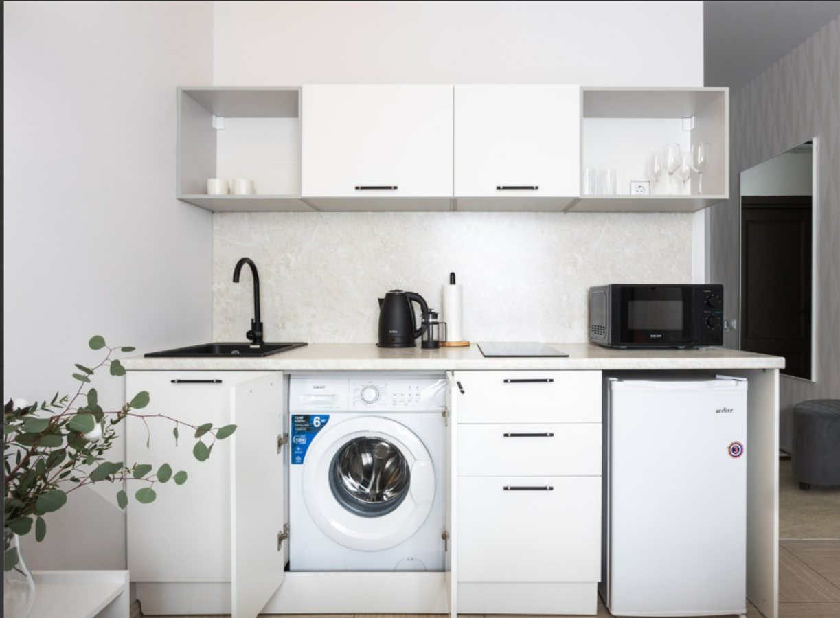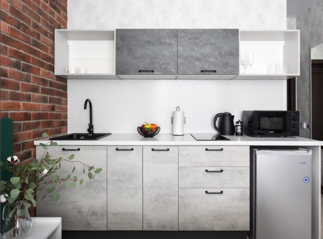 Кухонная зона укомплектована техникой для самостоятельной организации питания: холодильник, чайник, микроволновая печь, варочная панель, а также посуда. Поблизости работают несколько заведений, где можно пообедать.