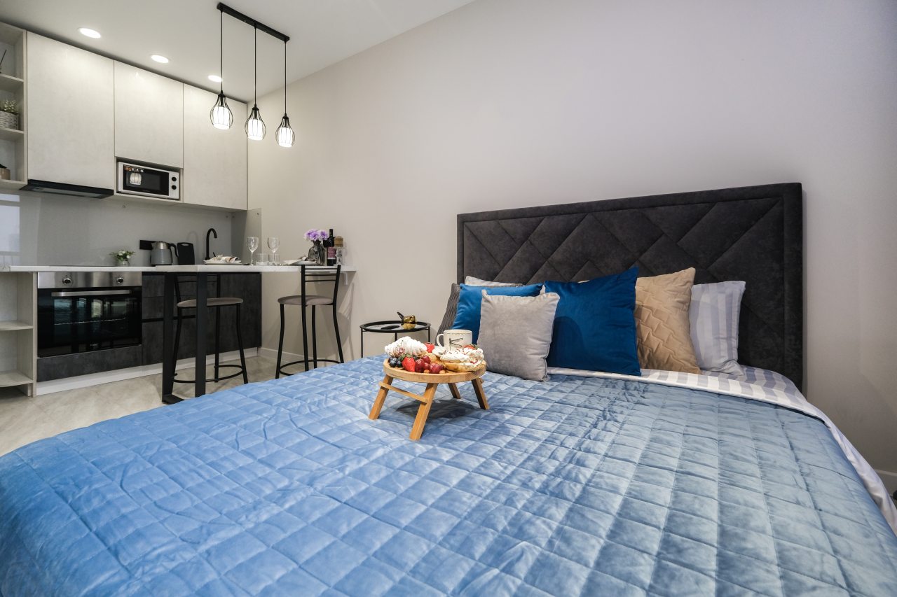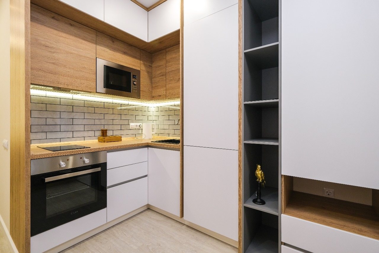Каждая кухня оснащена плитой, СВЧ, чайником, духовым шкафом, холодильником, поэтому в любое время вы сможете порадовать себя домашними блюдами.