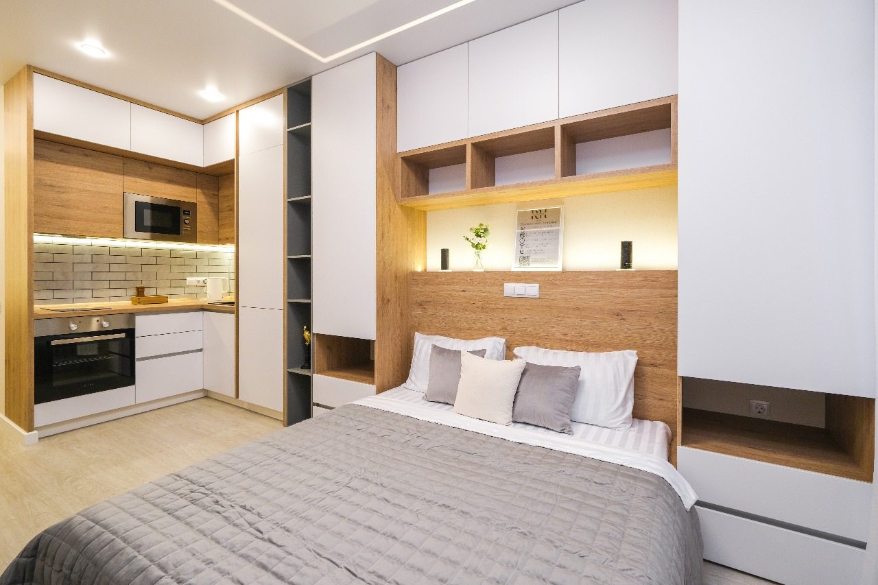 Для выбора представлено несколько вариантов. Внутри каждого вас ожидает двуспальная кровать с качественным матрасом, различные шкафы, разноплановые источники освещения, телевизор, плотные шторы для качественного сна. Санузел может быть укомплектован стиральной машиной или ванной.