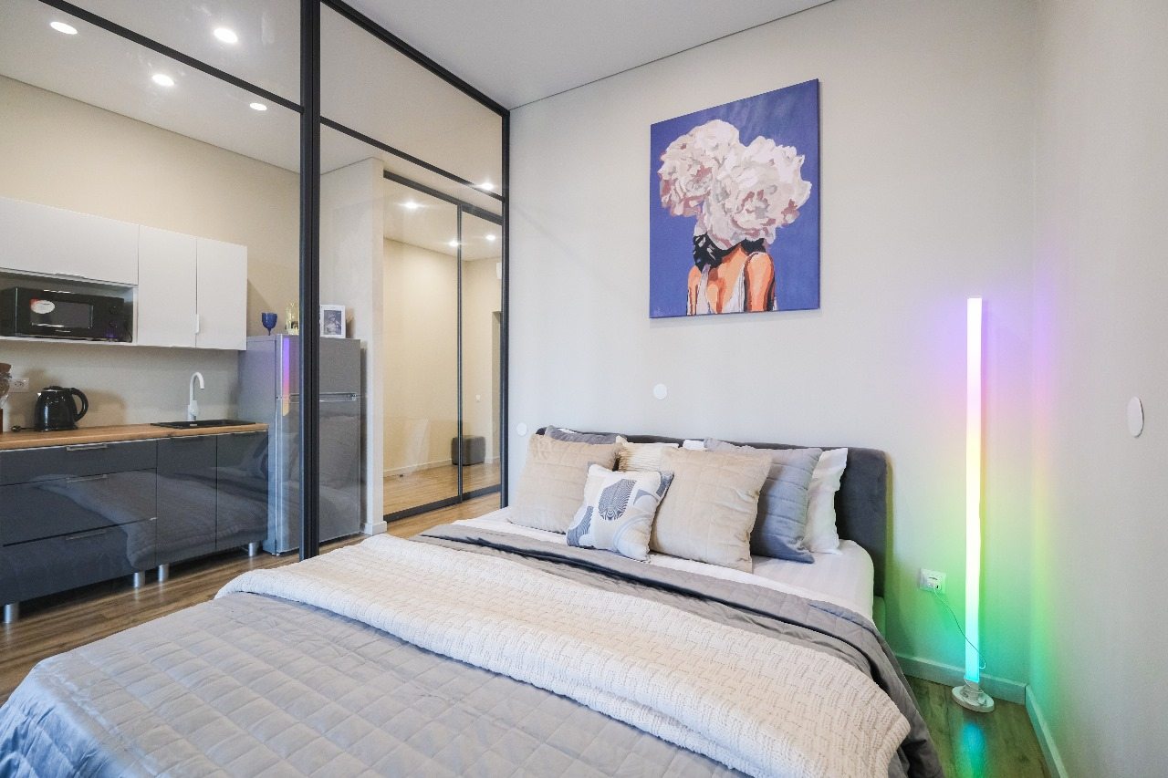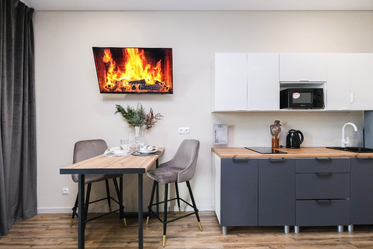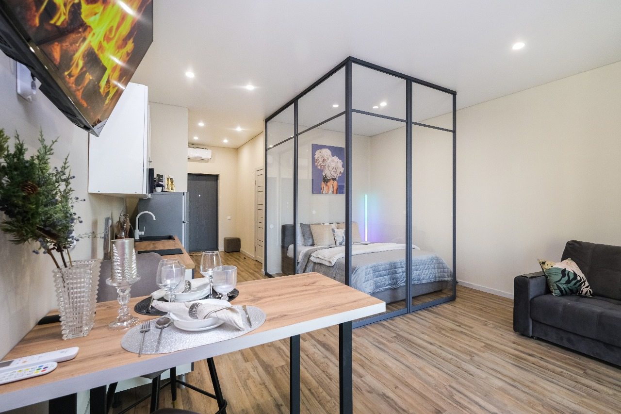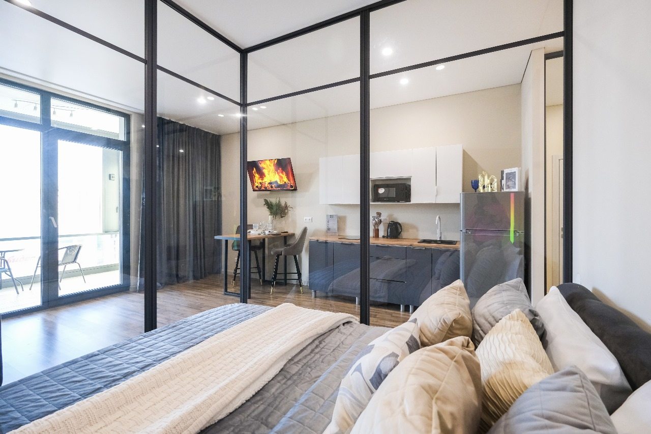 Квартиры укомплектованы всем необходимым для качественного проживания и отдыха, например: удобной двуспальной кроватью с чистым постельным бельем из 100% хлопка, шкафом, телевизором, затемненными шторами, кухонной зоной, ванной комнатой и балконом с панорамными окнами. Санузел имеет комплект современной сантехники, фен для волос, стиральную машину и гигиенические средства.