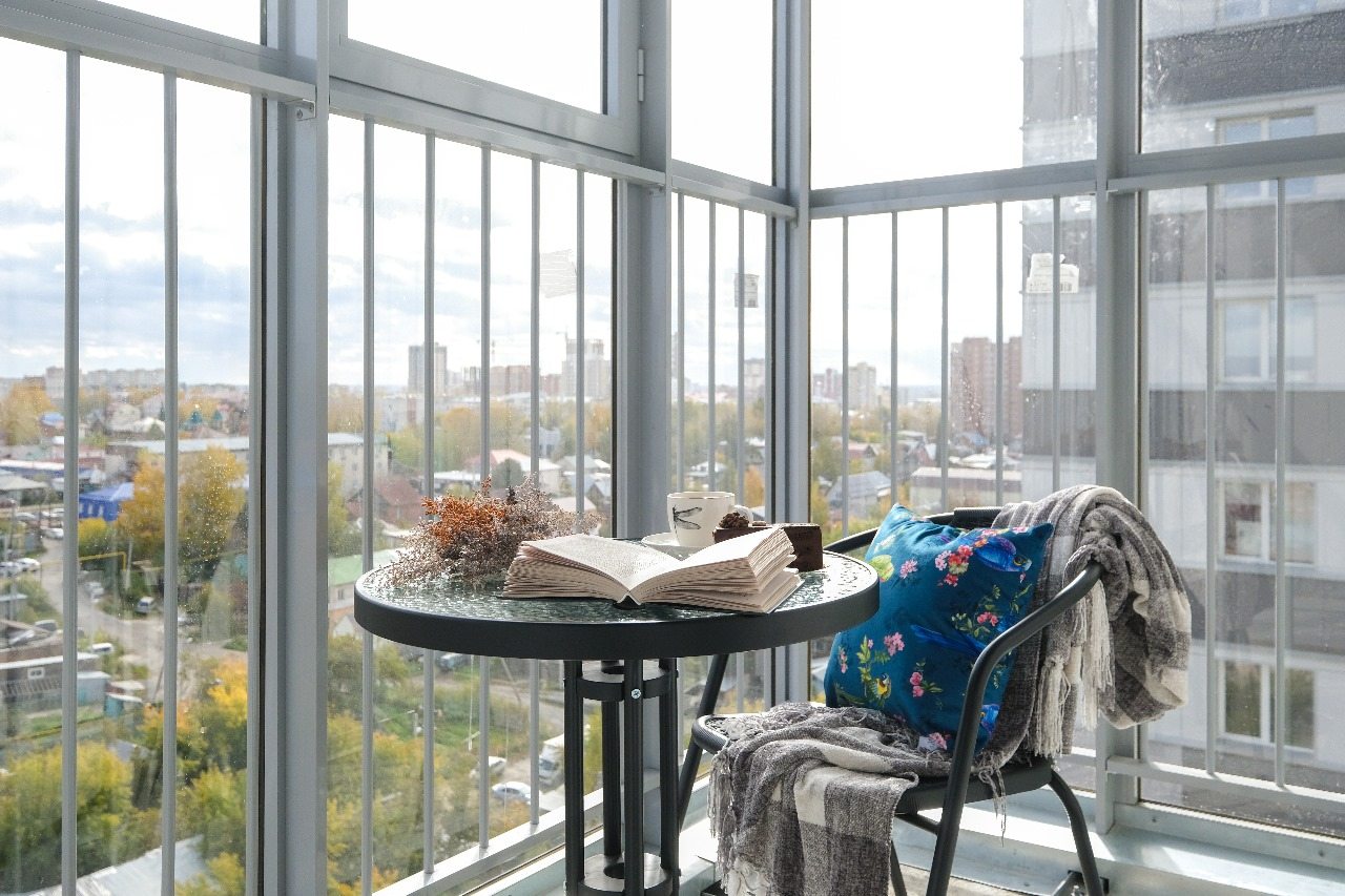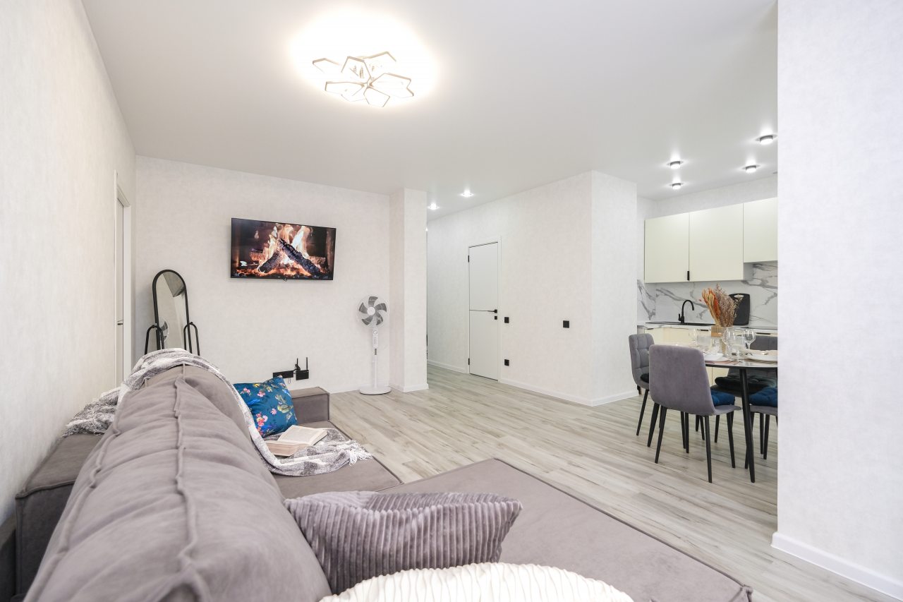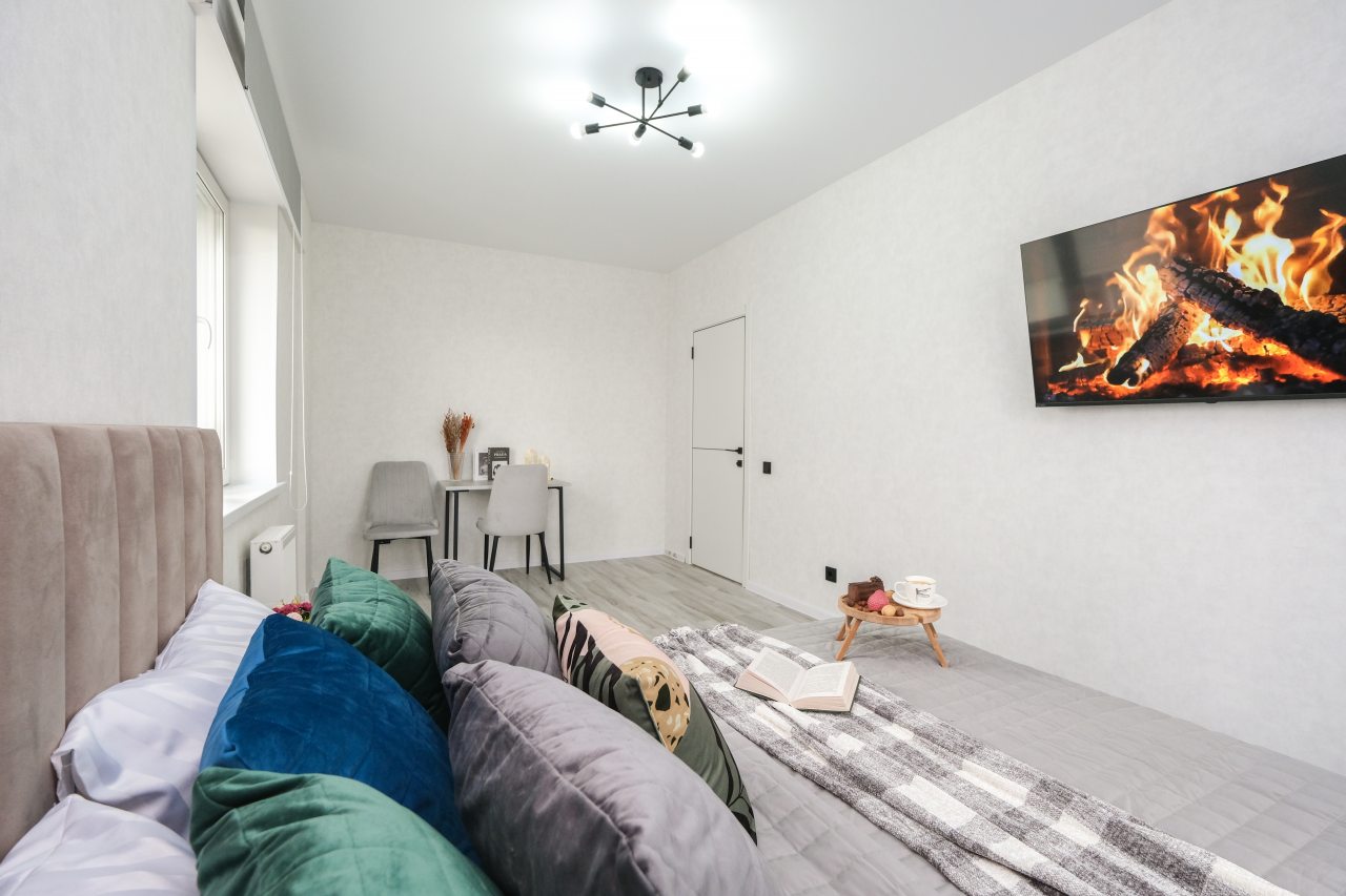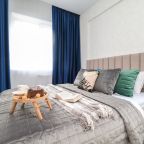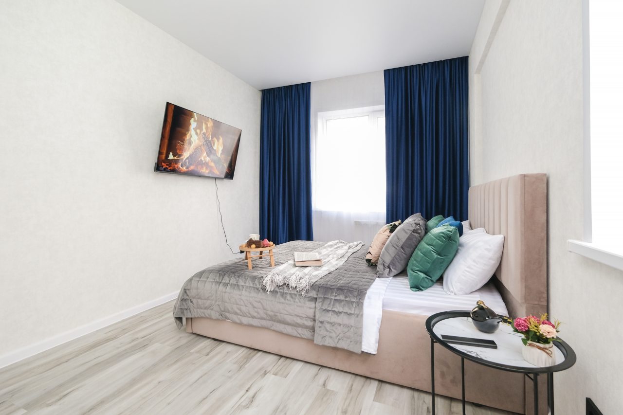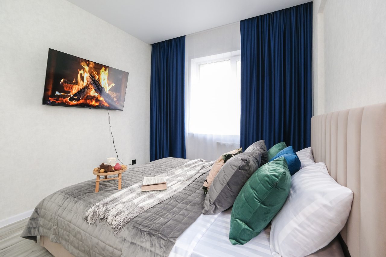 Внутри имеется всё для комфортного проживания, включая двуспальную кровать с хорошим матрасом, затемнённые шторы для лучшего сна, телевидение, балкон с панорамным остеклением, диван, ванную комнату со стиральной машиной.