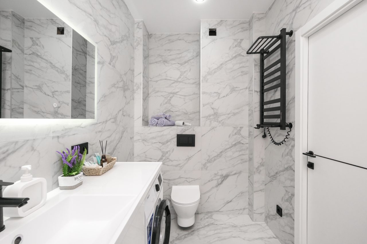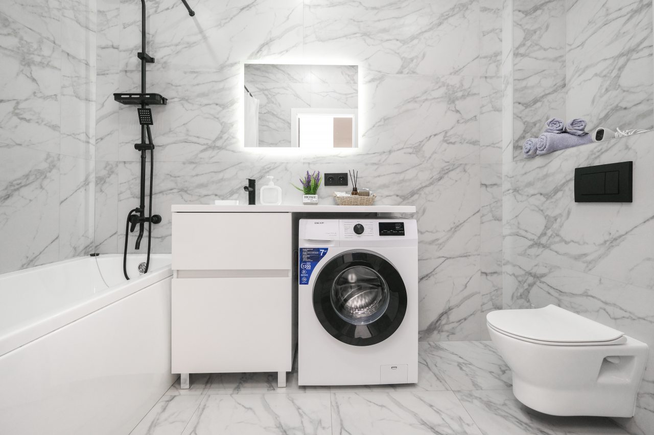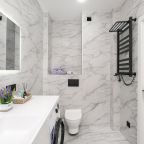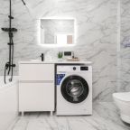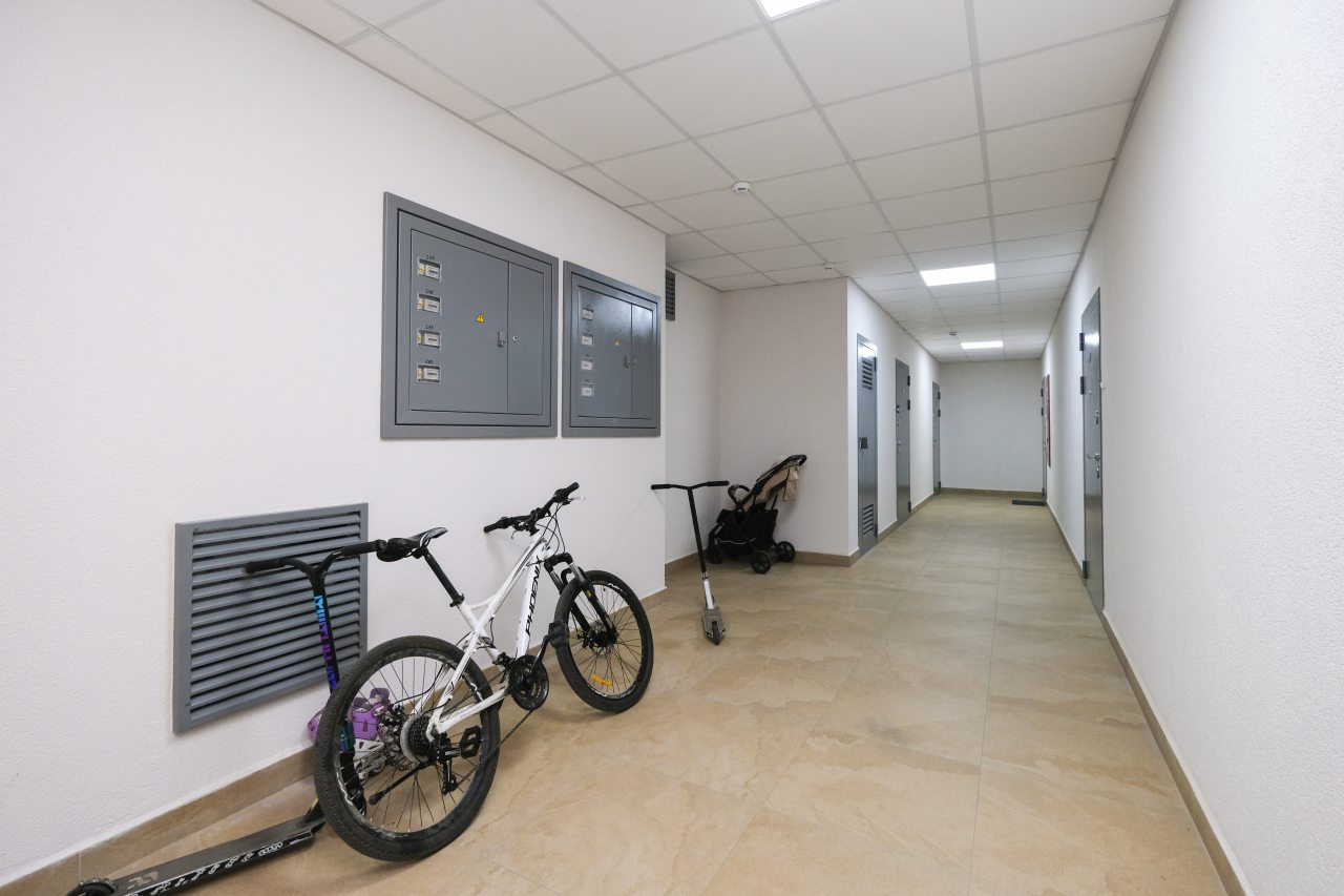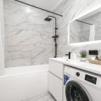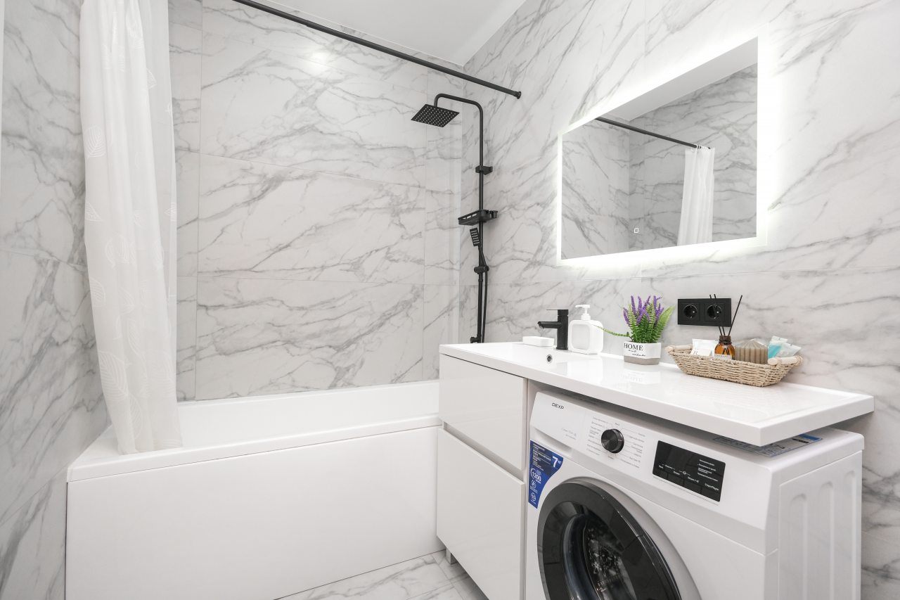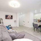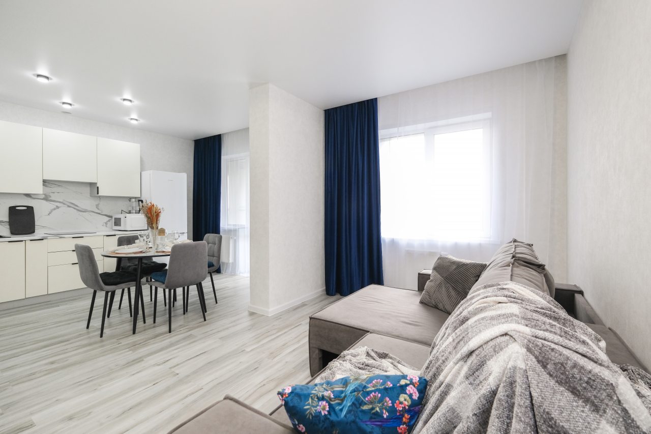 Внутри имеется всё для комфортного проживания, включая двуспальную кровать с хорошим матрасом, затемнённые шторы для лучшего сна, телевидение, балкон с панорамным остеклением, диван, ванную комнату со стиральной машиной.