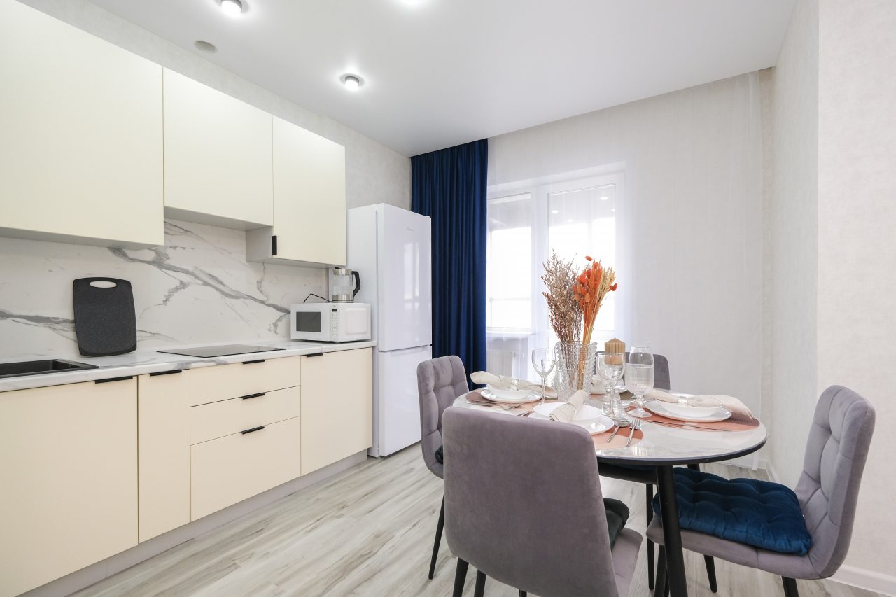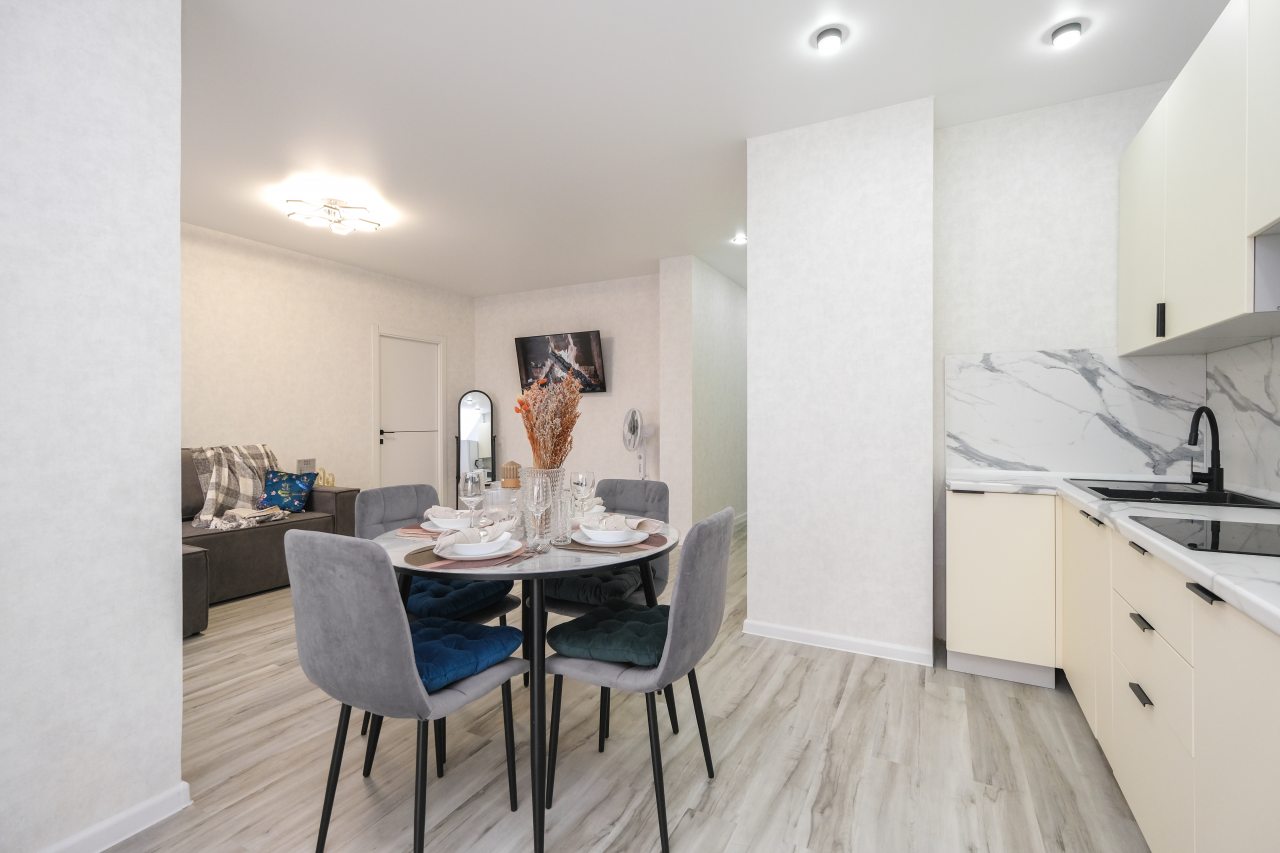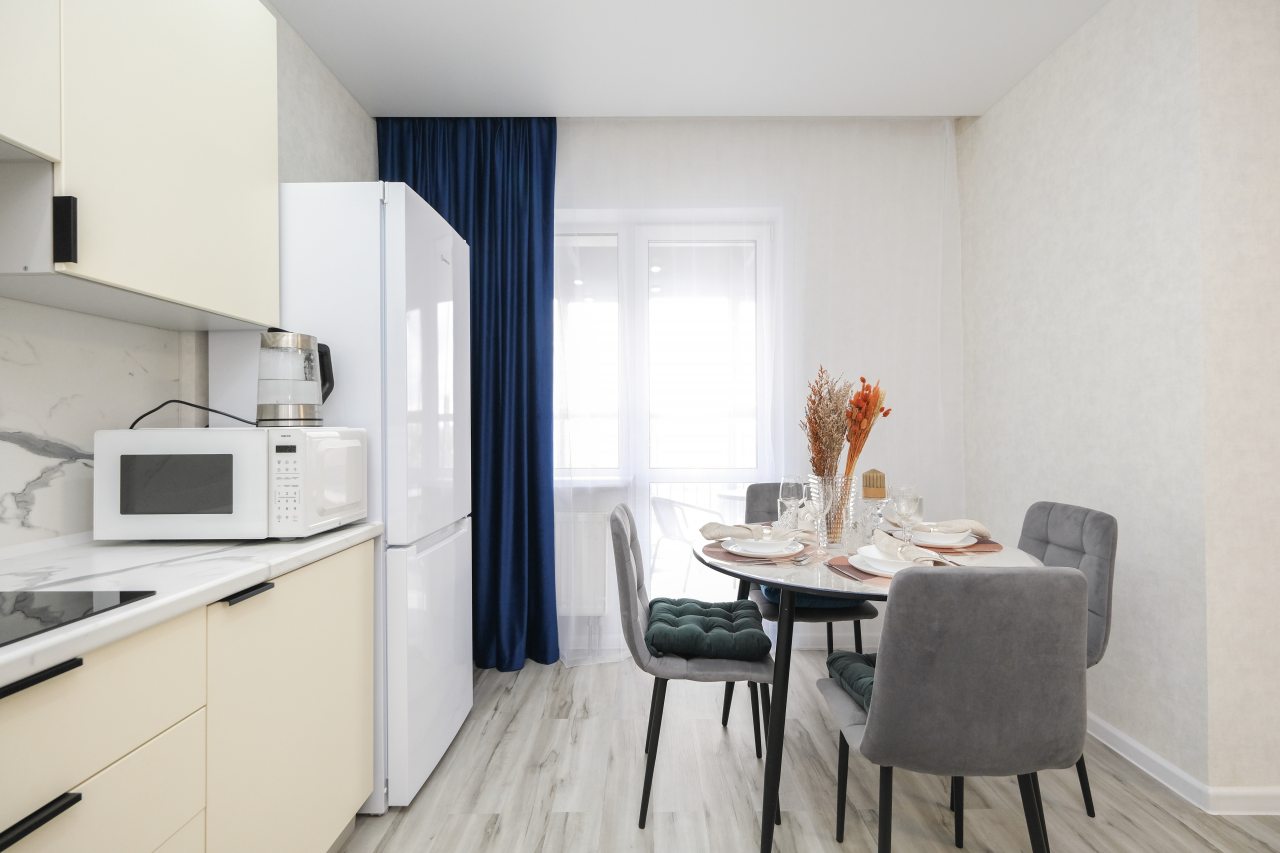 Зона кухни оснащена варочной панелью, СВЧ, посудой, холодильником, чайником, обеденным столом и стульями. Таким образом, вы всегда сможете насладиться любимыми напитками и блюдами.