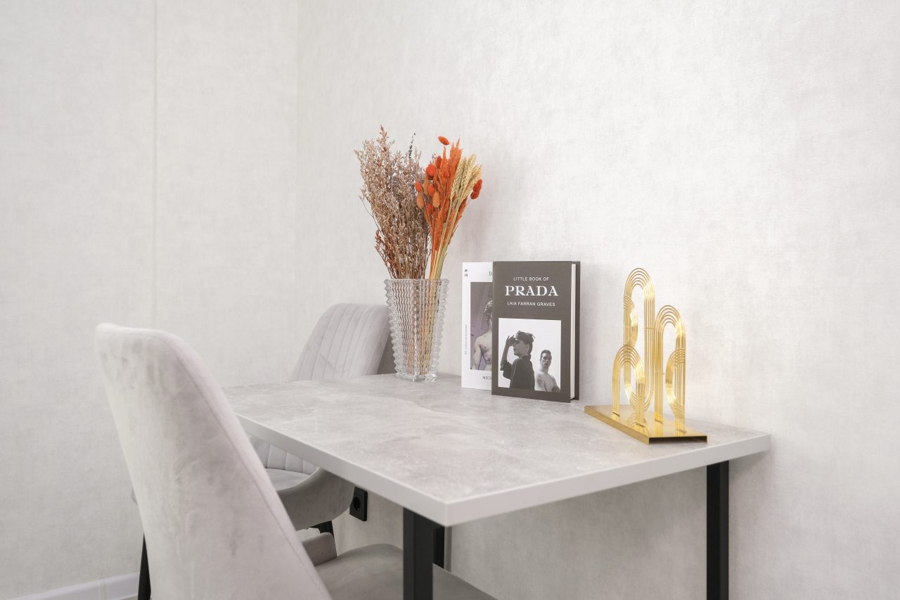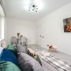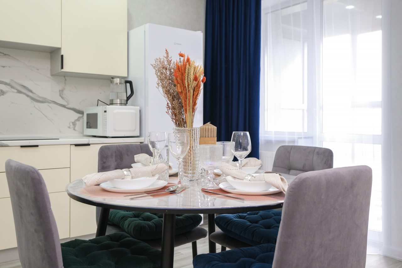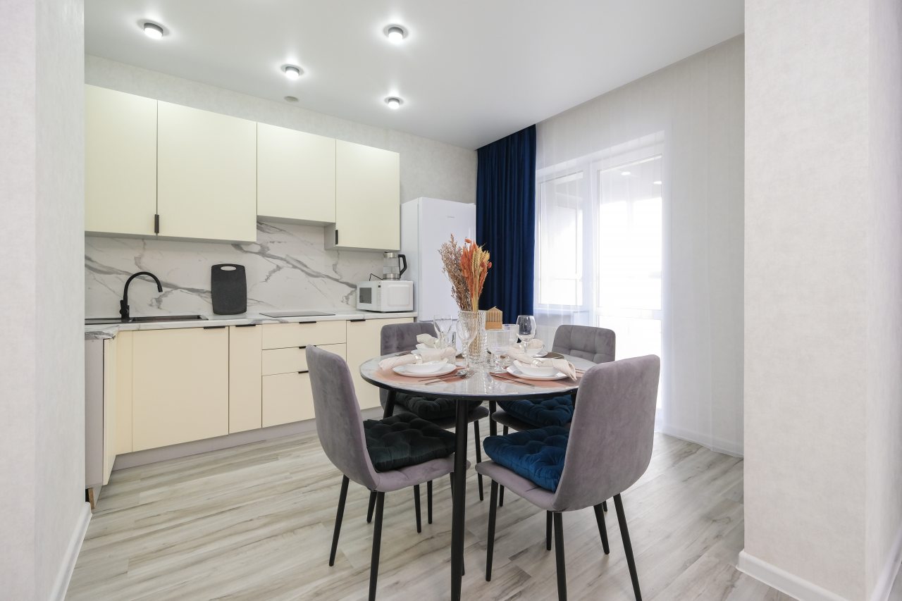 Зона кухни оснащена варочной панелью, СВЧ, посудой, холодильником, чайником, обеденным столом и стульями. Таким образом, вы всегда сможете насладиться любимыми напитками и блюдами.