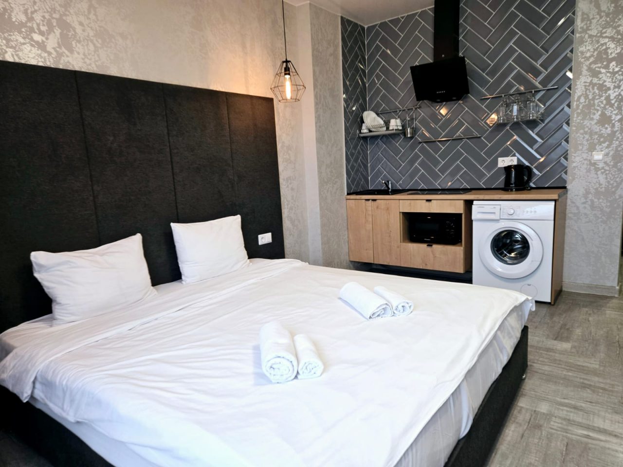 Номер с мини кухней, стиральной машиной, что очень удобно для поездки с ребенком.