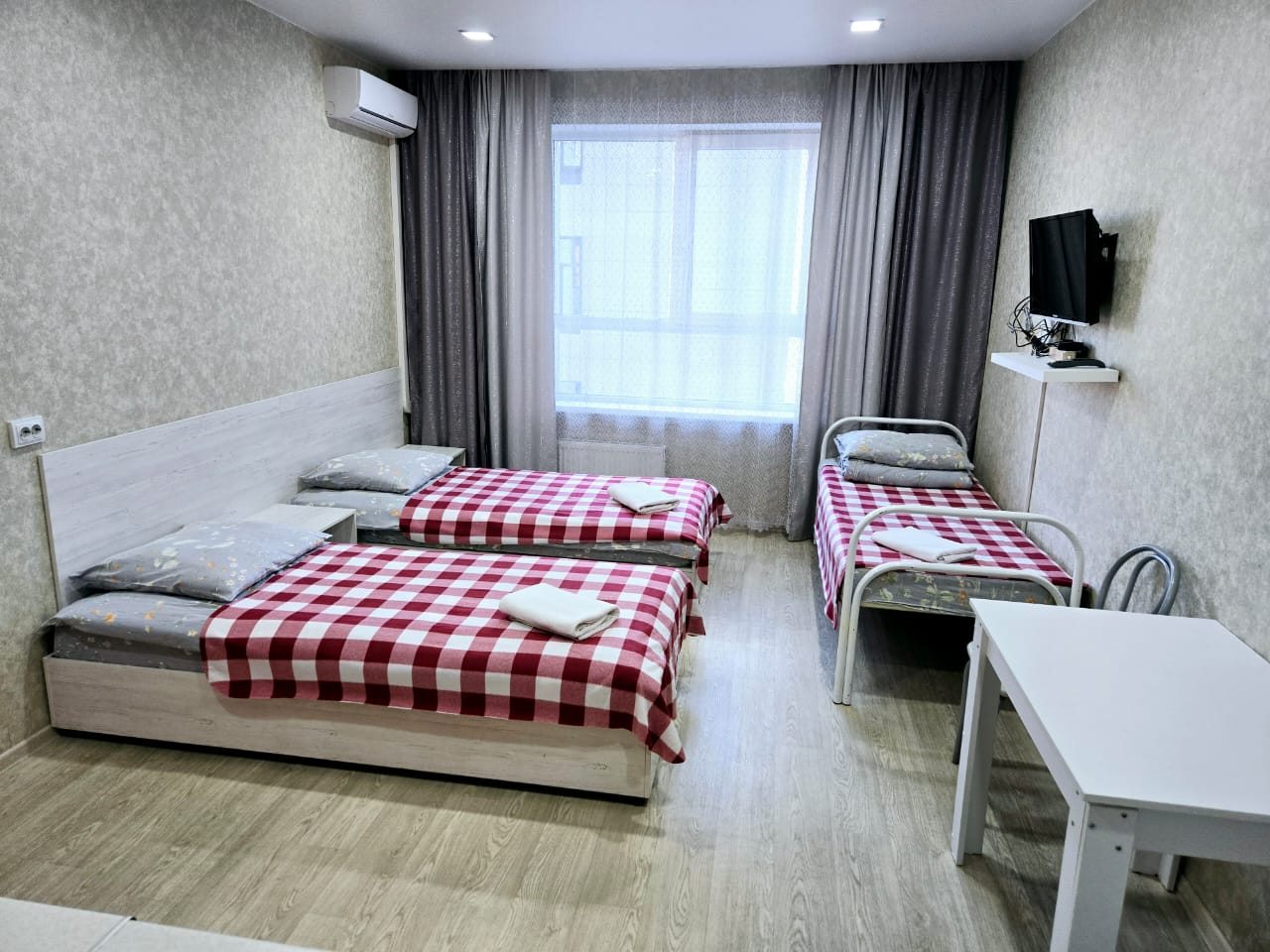 Отель расположен недалеко от центра, мы были на своем автомобиле, поэтому было удобно. Припарковаться можно как во дворе дома, так и вдоль дороги в кармане. В этом же здании есть магазин, но цены там подороже чем рядом в Пятерочке, поэтому покупали там в основном только воду, минералку. В пешей доступности Пятерочка и Spar.