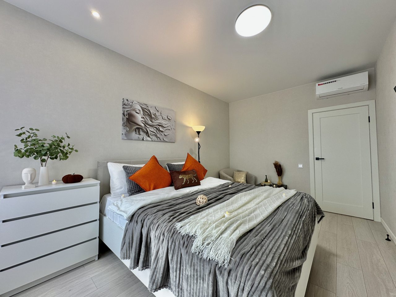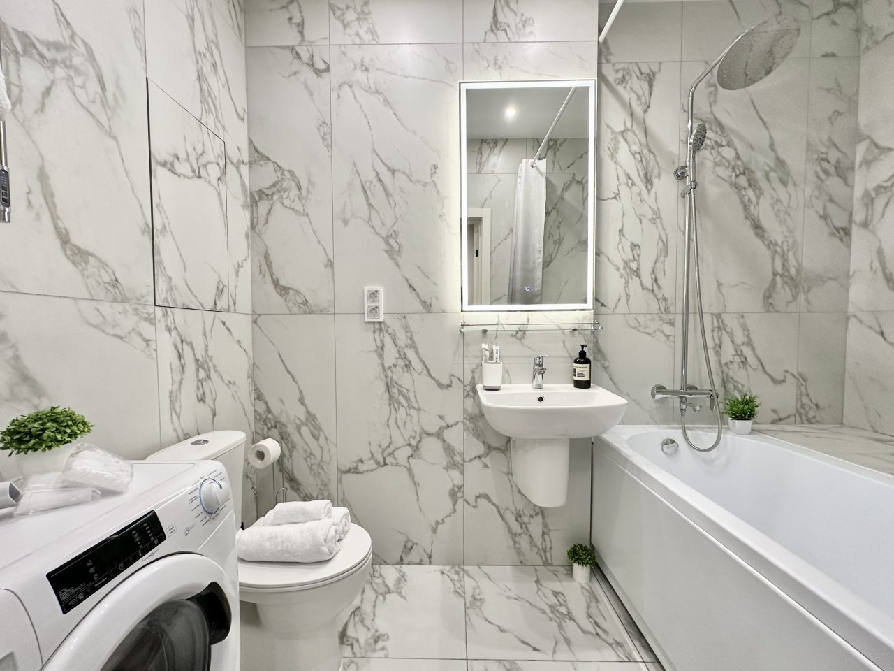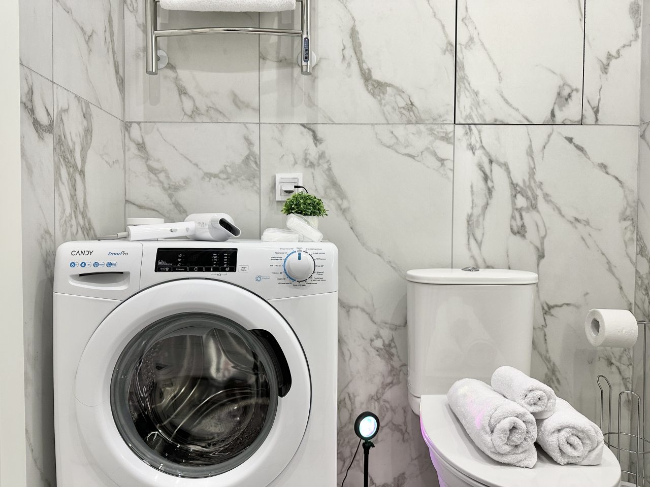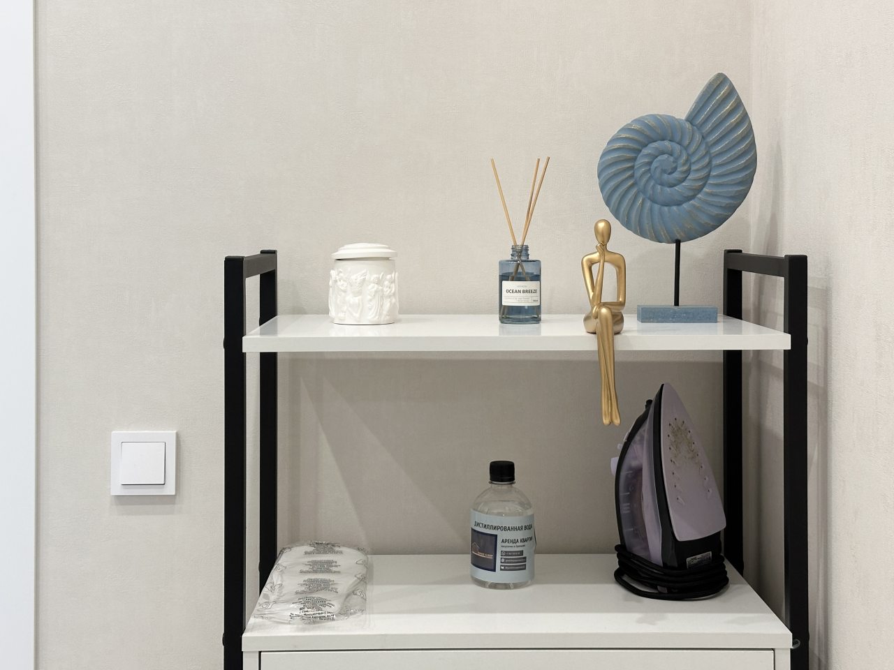 Помимо стильного интерьера внутри, вас также ожидает большая и удобная двуспальная кровать, удобное кресло, кондиционер, вместительный комод, ЖК-телевизор, набор полотенец, фен, стиральная машина, полноценная ванна.