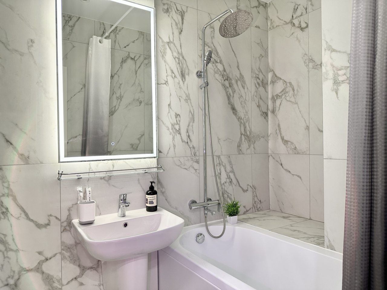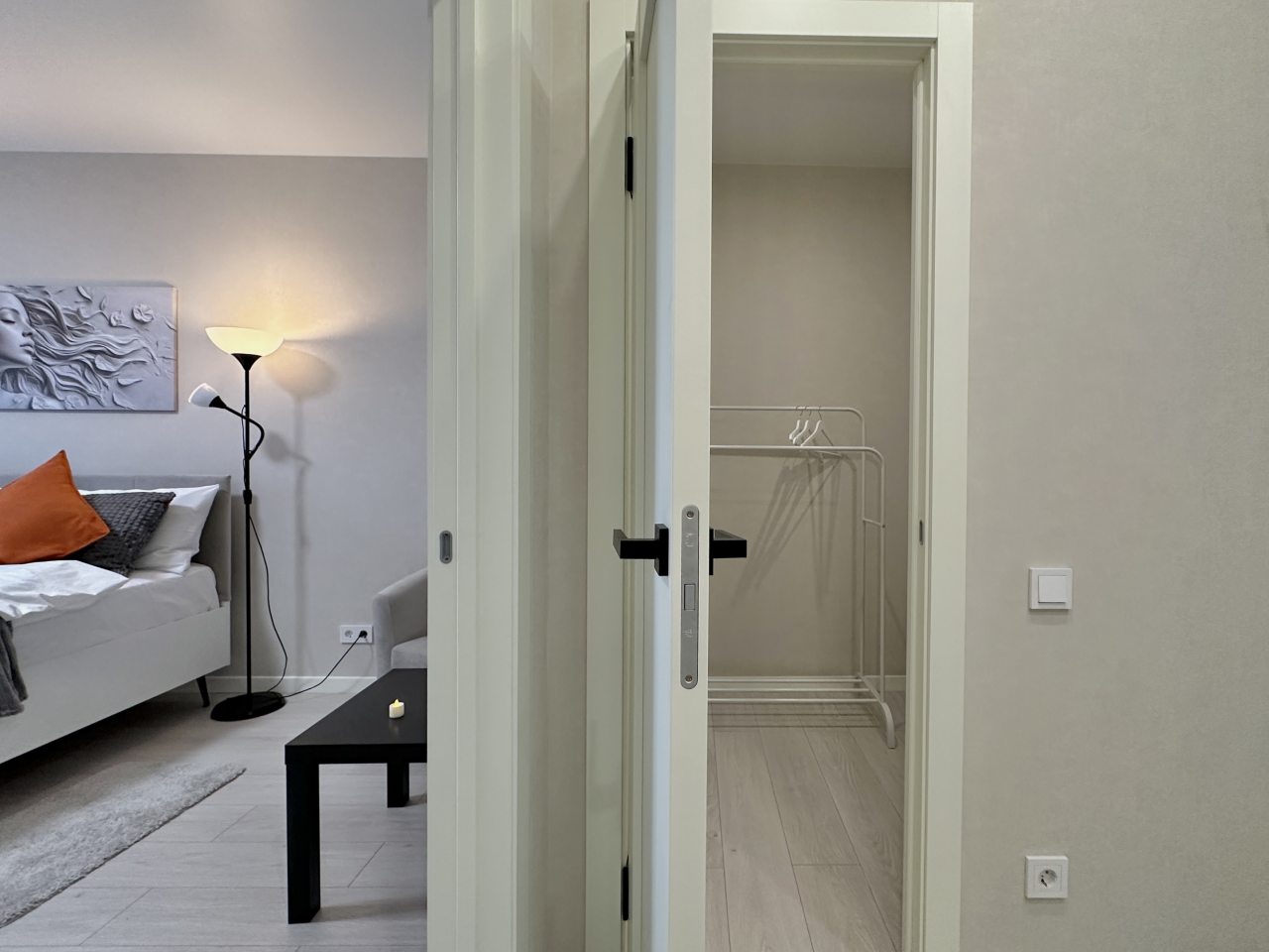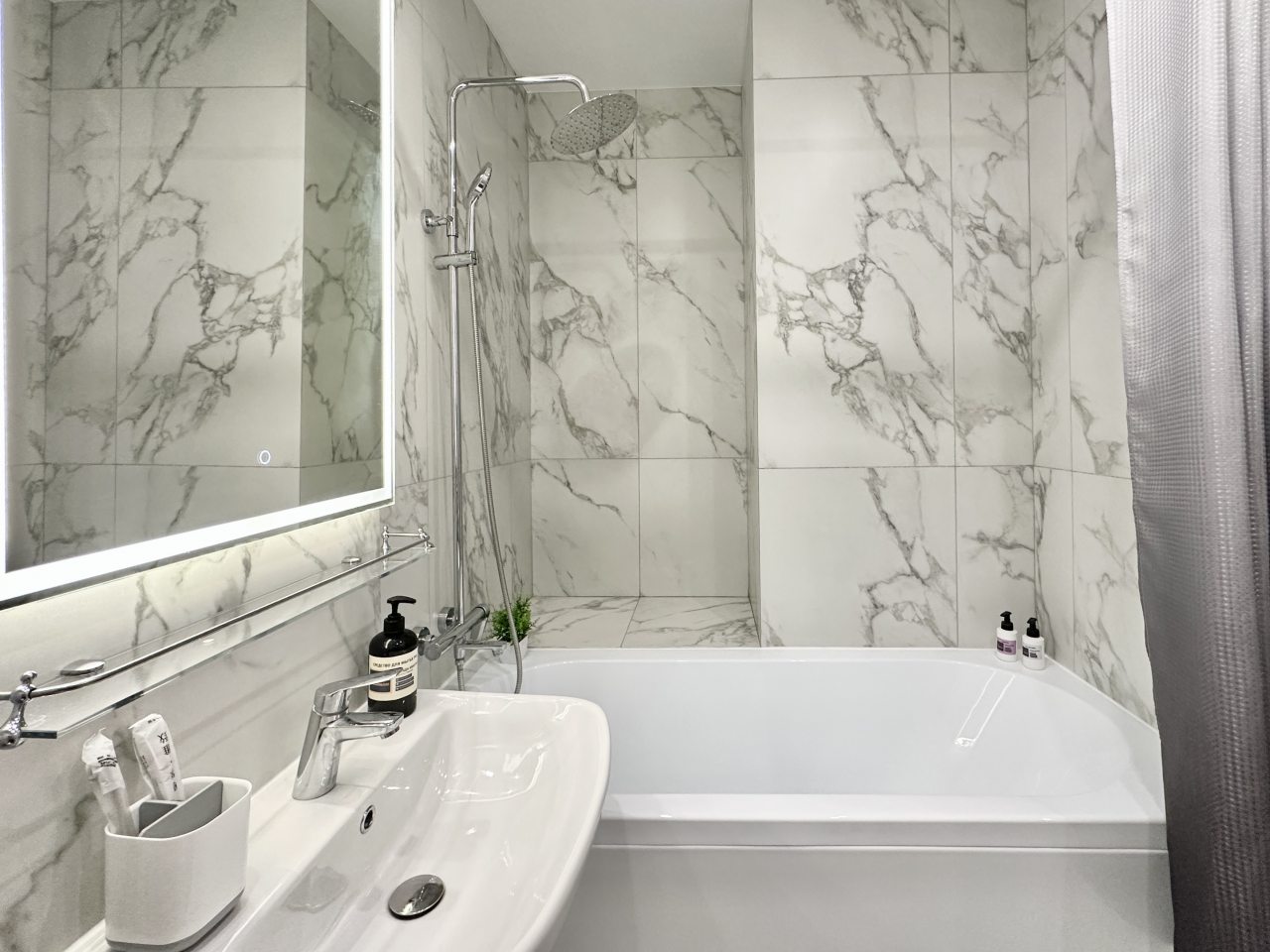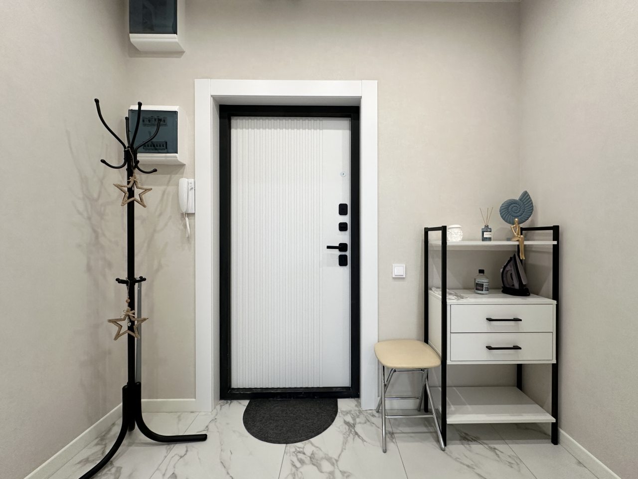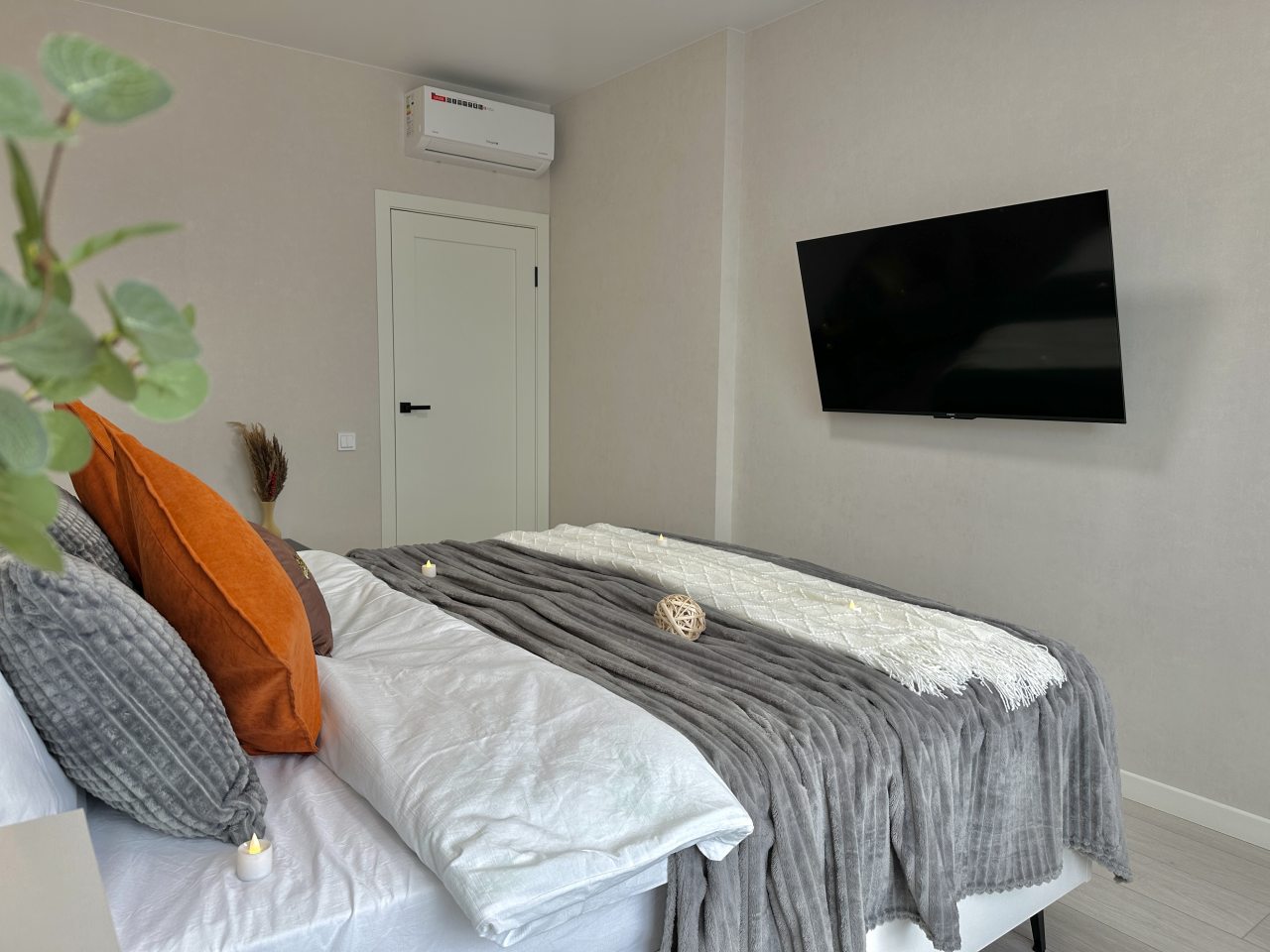 Помимо стильного интерьера внутри, вас также ожидает большая и удобная двуспальная кровать, удобное кресло, кондиционер, вместительный комод, ЖК-телевизор, набор полотенец, фен, стиральная машина, полноценная ванна.