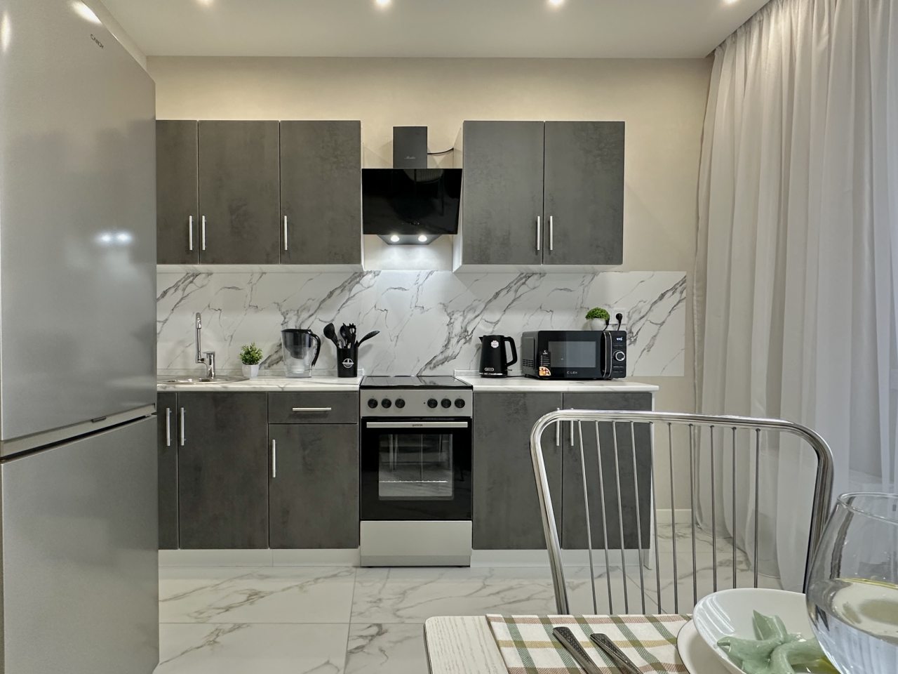 На уютной кухне вы сможете готовить домашние блюда, поскольку в наличии как плита с духовым шкафом, так и микроволновая печь, а также чайник и фильтр для воды.