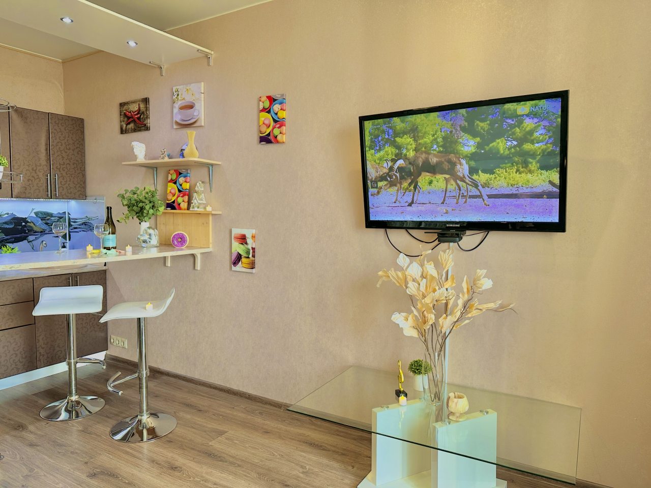 Отдыхающим предоставляется студийная квартира с приятной цветовой гаммой. В апартаментах есть диван-кровать, гардеробная комната, балкон, собственная кухня и ванная комната. Для полного удовлетворения гостей в апартаментах имеется постельное белье, полотенца, гладильная доска, стиральная машина, средства личной гигиены, телевидение и бесплатный wi-fi.