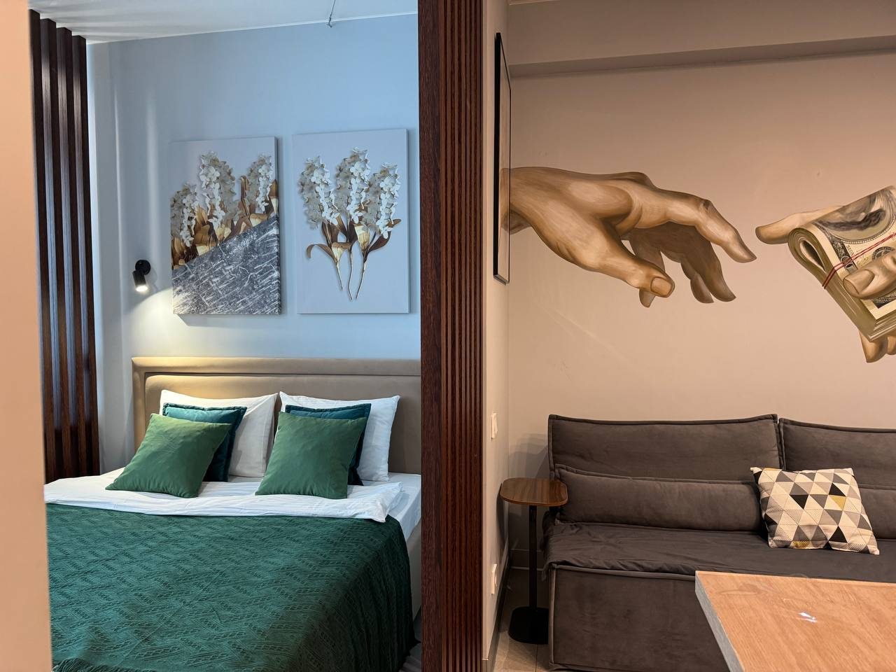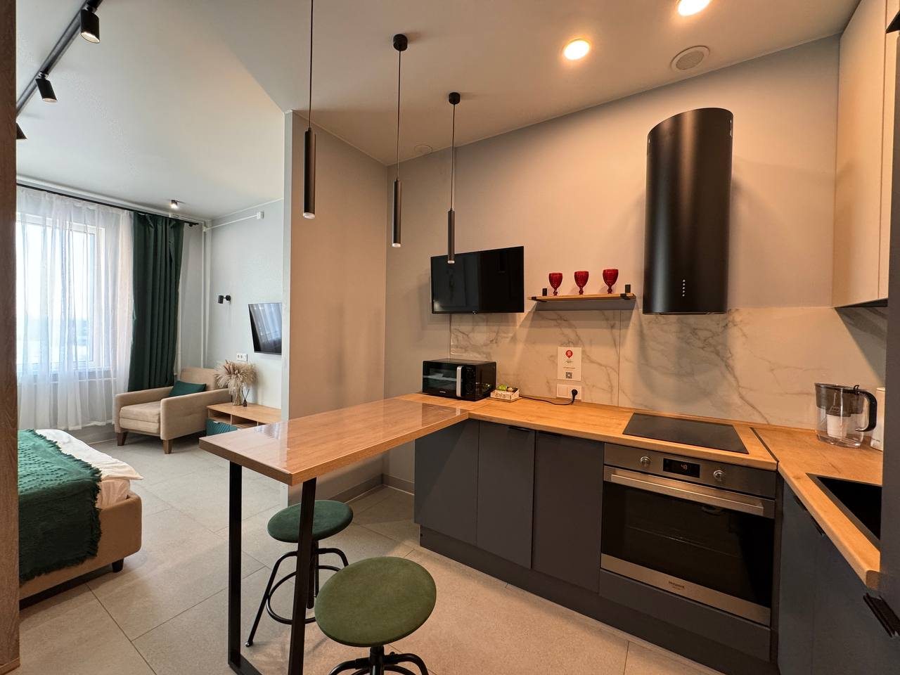 Очень понравились апартаменты — всё чисто, уютно и соответствует описанию. Чистота была на высоте при заезде, всё аккуратно подготовлено. Красивая мебель, приятный интерьер, удобная кровать и свежие полотенца.