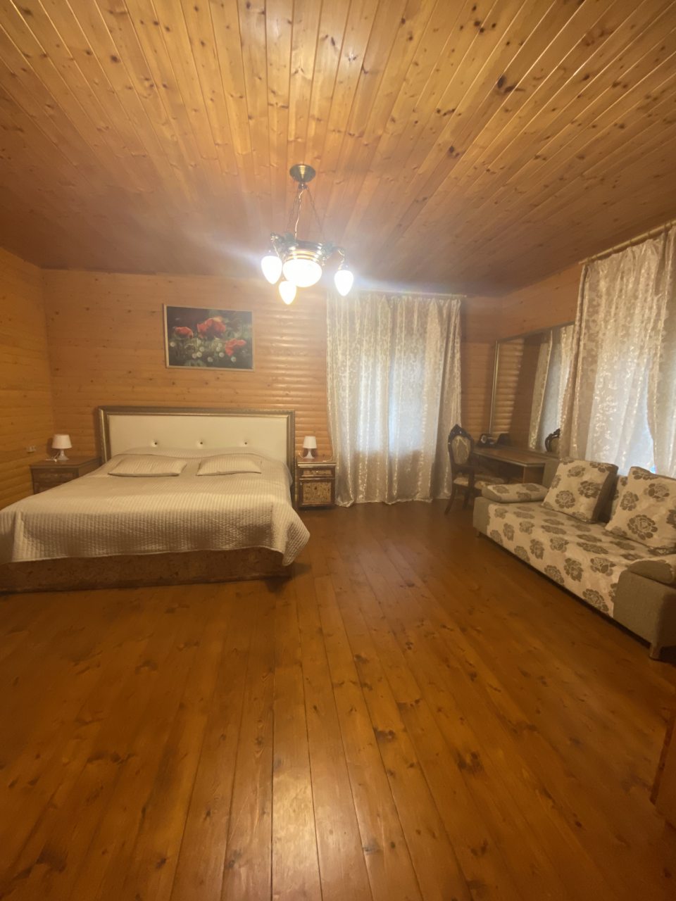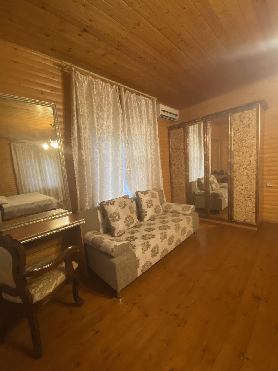 Внутри предусмотрено всё для комфорта гостей, в том числе: мягкий диван, двуспальная кровать с удобным матрасом, прикроватные лампы и тумбы, кондиционер, шкаф, туалетный столик с зеркалом, камин, а также санузел с душевой и стиральной машиной.
