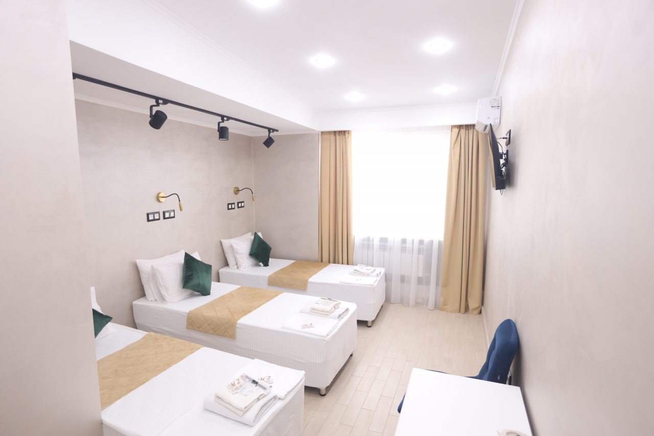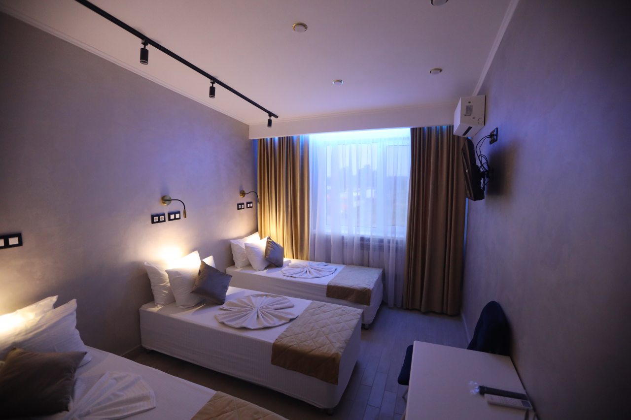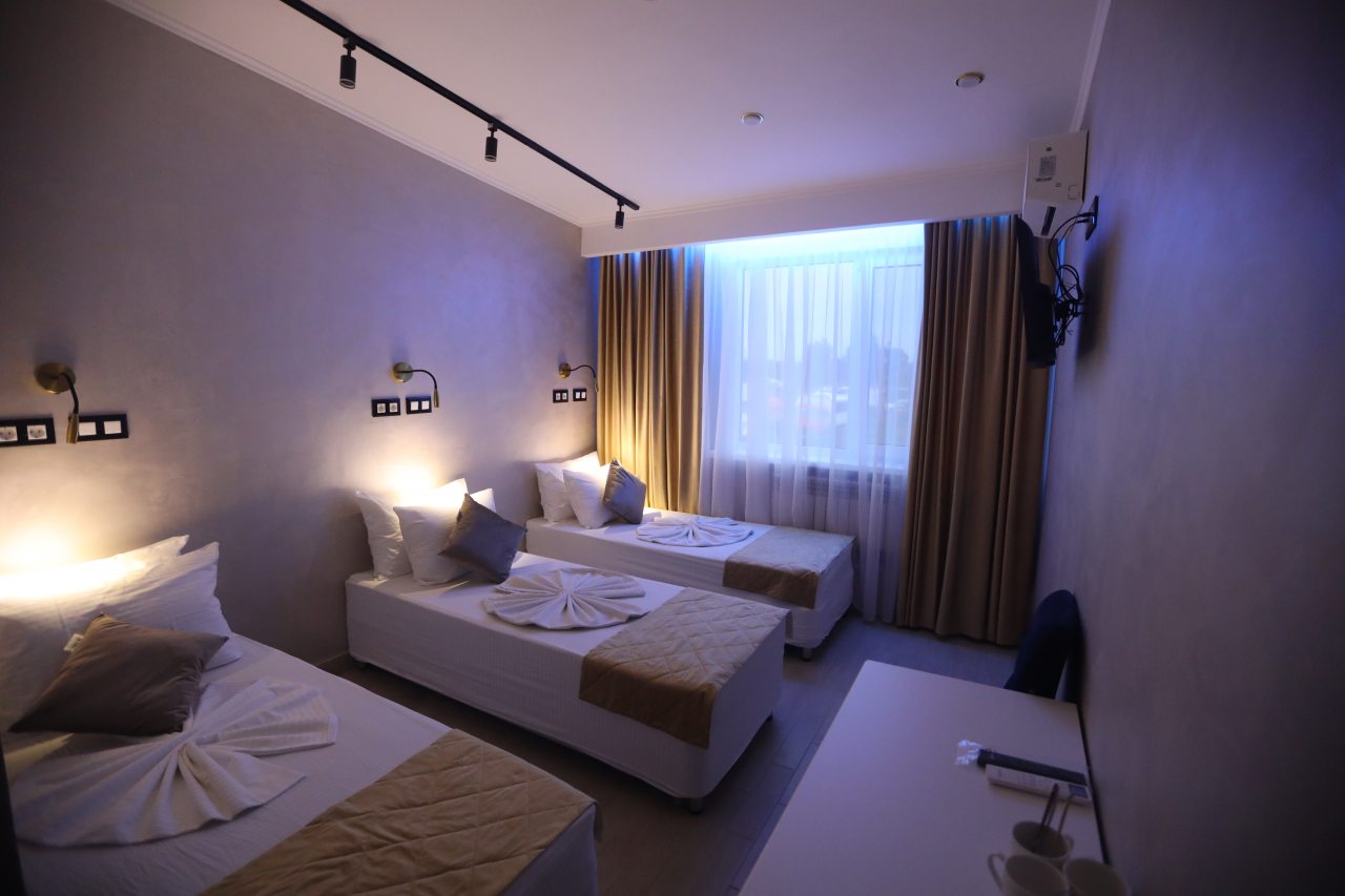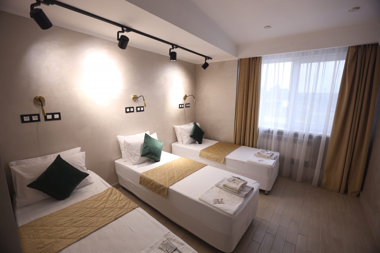 Заехали семьёй на ночь проездом: 3 взрослых + 1 ребёнок. 4-х местный номер: 2 кровати + 1 2-х ярусная. На ресепшене очень хорошенькая, приятная, вежливая девушка. Предложила несколько вариантов. Чисто, нормальная парковка, удобное расположение для проезжающих. Спать комфортно, удобства качественные. Завтрак вкусный.