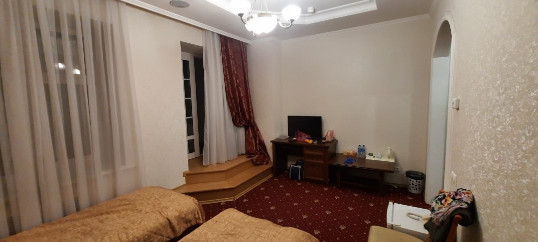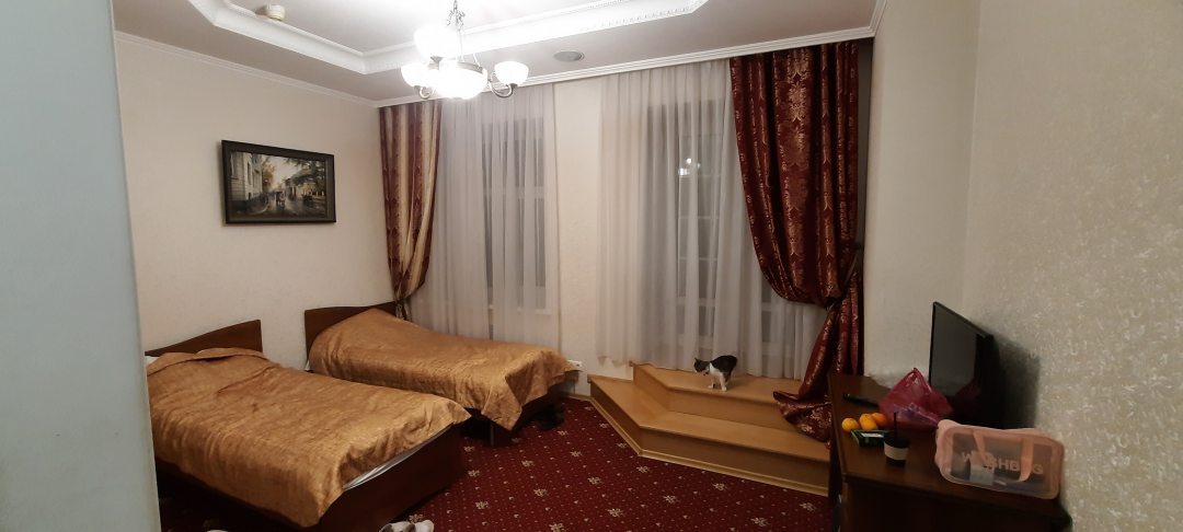 Были проездом и решили остановиться в этой гостинице. У нее очень интересное название и красивый интерьер. Выбрали двухместный номер с одной кроватью. К нашему приезду номер был чистый, со свежим постельным бельем. Техника немного устаревшая, но все равно рабочая. Нам все понравилось.)