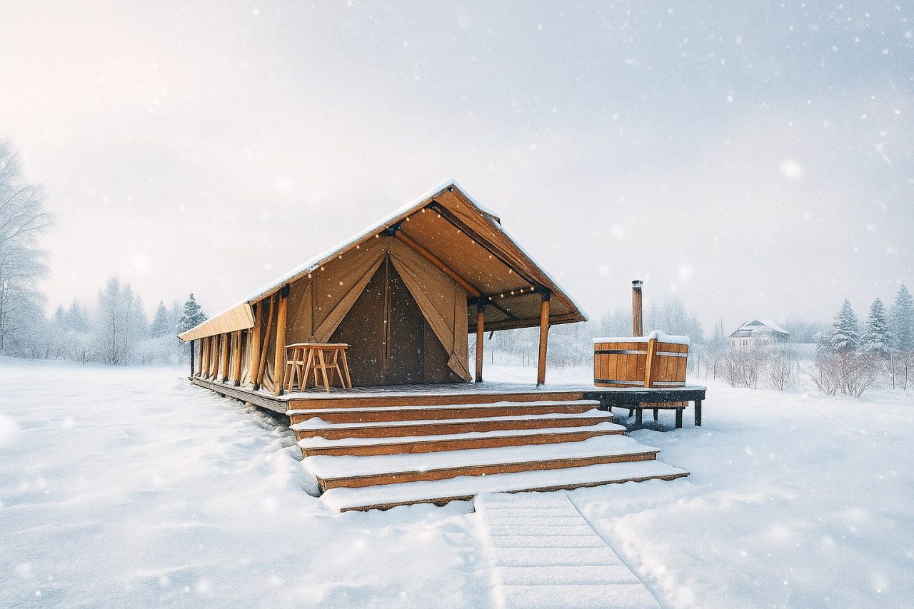 Разместиться предлагается в одном из 12 сафари-тентов с освещением и розетками, из техники в них имеются холодильник и чайник. У каждого свой санузел с туалетом и душем. Кроме того, установлены диваны и столики, мебель на террасе. На территории работает бесплатный интернет.