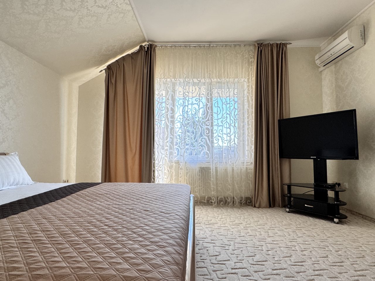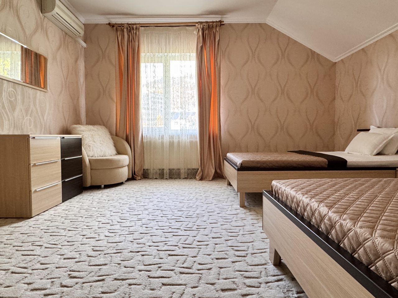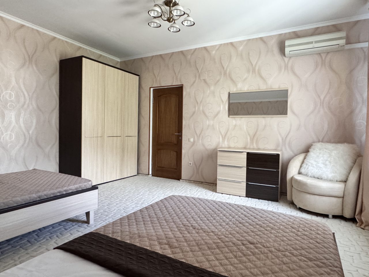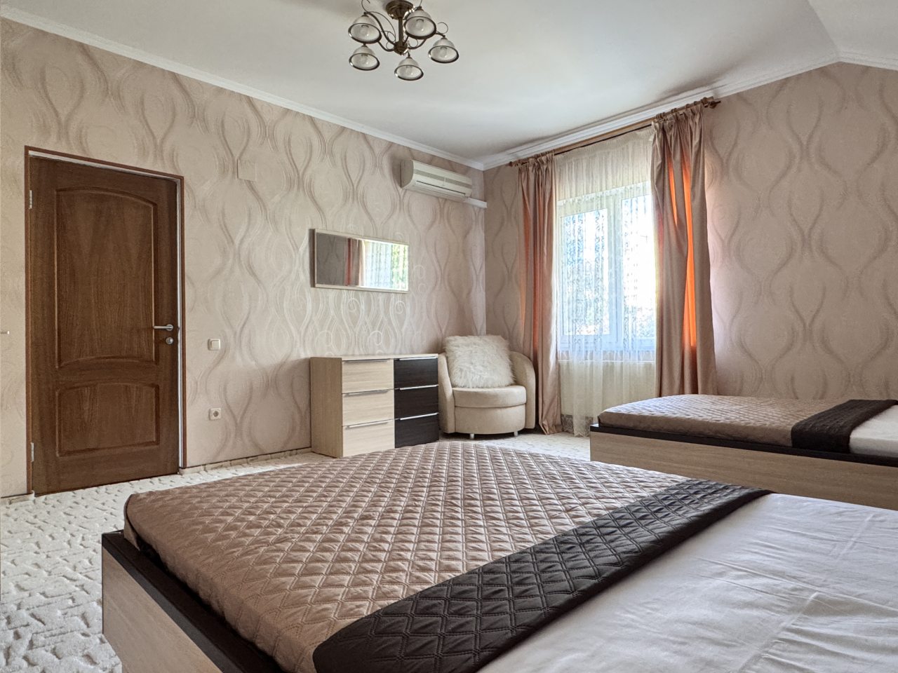 Коттедж отлично подходит для спокойного отдыха в Ялте, так как находится в тихом районе частного сектора. Мы приезжали сюда компанией из трех семей, и так как комнат много и в принципе площадь дома огромная, хватило всем места с лихвой. Наполнение стандартное, главное, что есть вся необходимая техника и мебель для проживания. Все остались довольны.