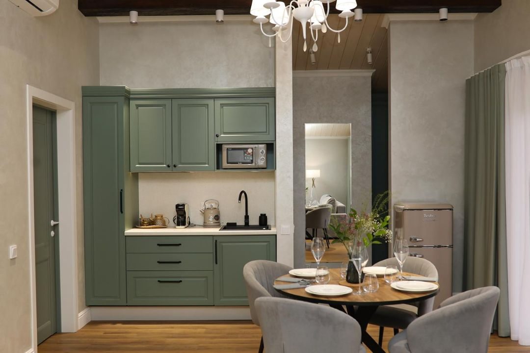 Стильная кухня укомплектована гарнитуром, холодильником, кофемашиной, электрочайником, микроволновой печью и др. Пообедать можно в ближайшем кафе. Предусмотрена зона барбекю, где можно приготовить любимые блюда на гриле.