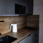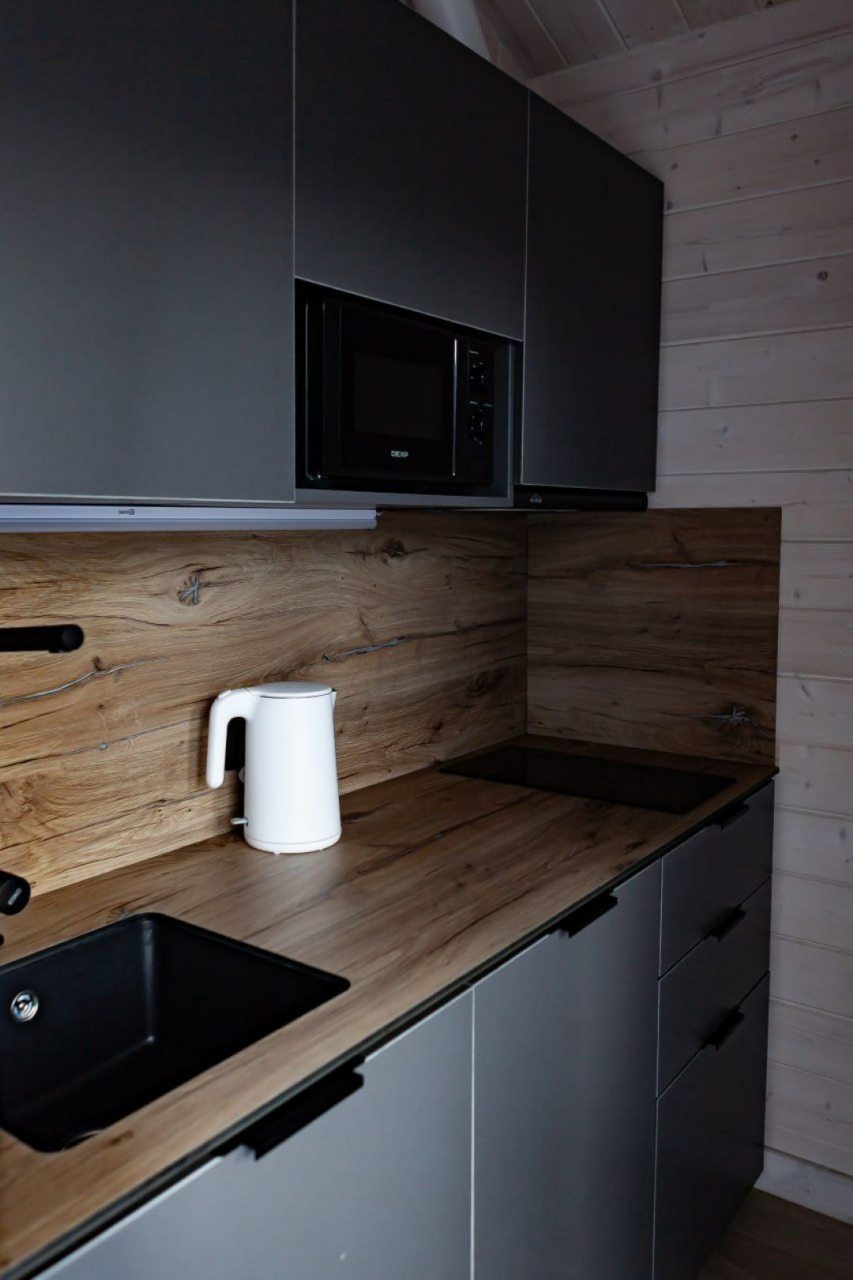 Кухонная зона укомплектована варочной панелью, чайником, холодильником, СВЧ, обеденным столом и стульями, чтобы вы могли всегда порадовать себя любимой едой и напитками.